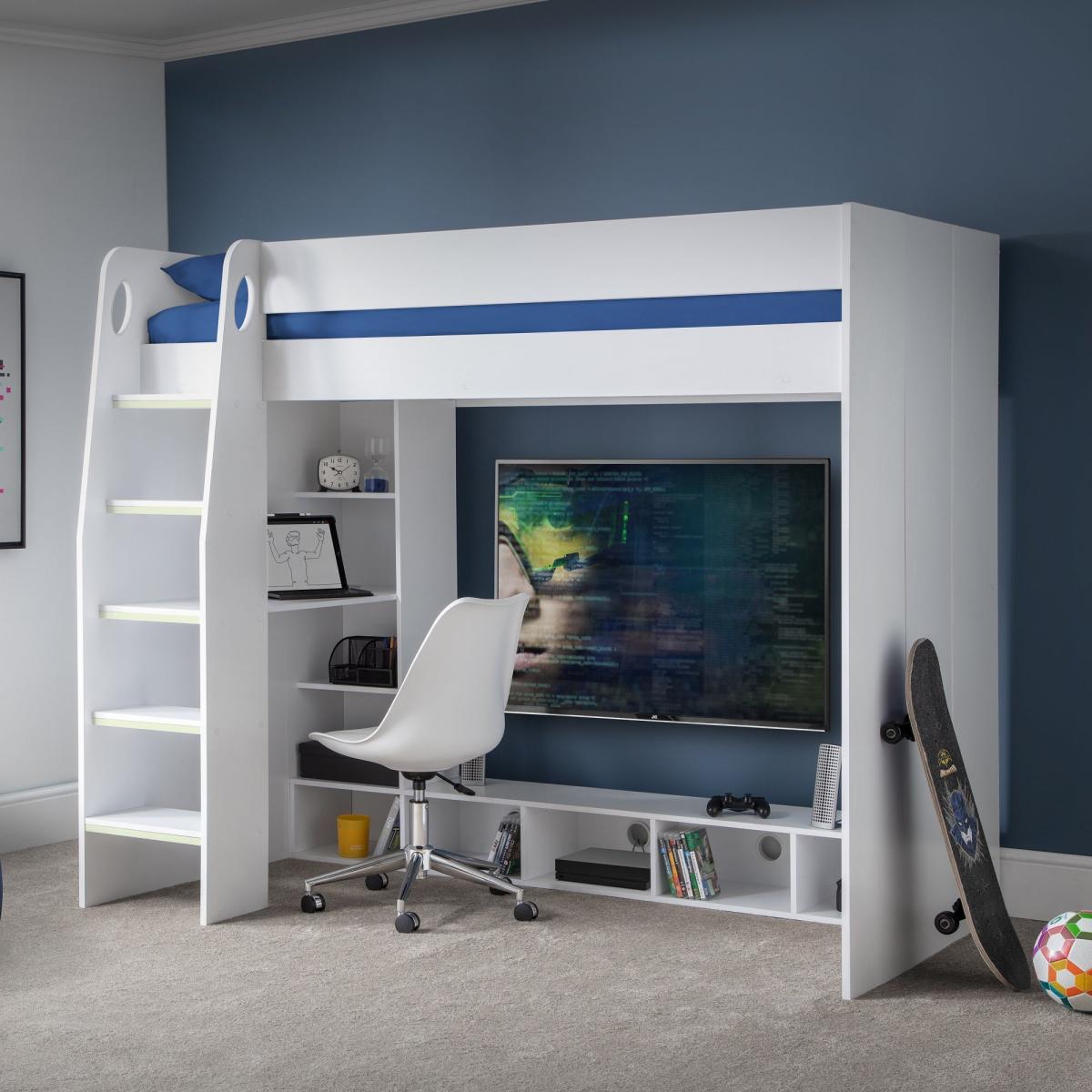 The nebula gaming bed looks practical and modern, perfect for a contemporary kids' room or a teenage space. I love its clean white finish, which makes it versatile and easy to incorporate into various interior styles-think minimalist, Scandi, or playful themed rooms. It works well with neutral tones or adding splashes of colour through bedding, cushions, or wall art. For styling tips, consider pairing it with cosy lighting, such as fairy lights or a desk lamp, to create a functional yet inviting area. Integration of storage solutions, like organisers on the shelves or under-bed storage, will keep the space tidy. Overall, it’s a great addition for a practical, multi-use room that emphasises both sleep and study or gaming areas.
