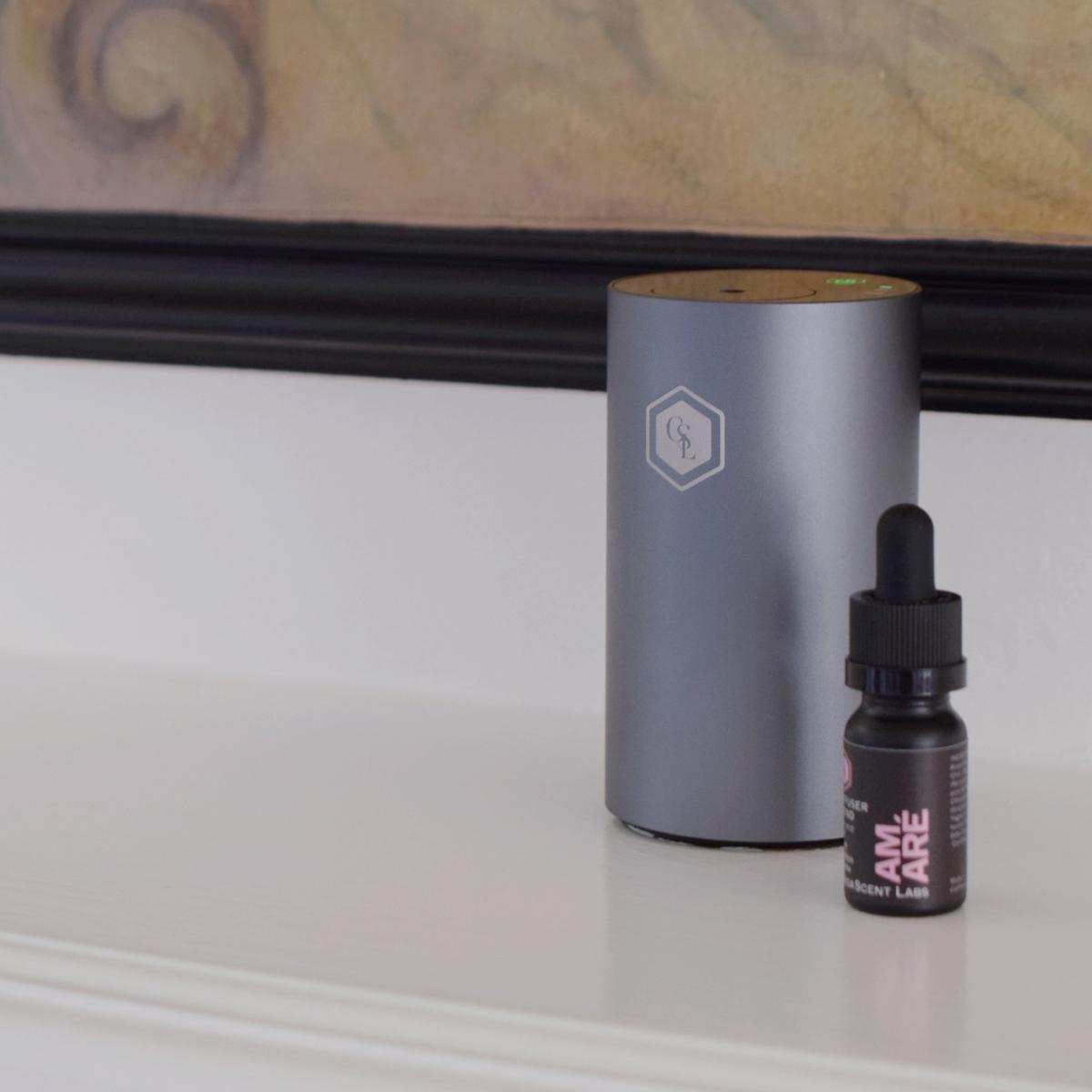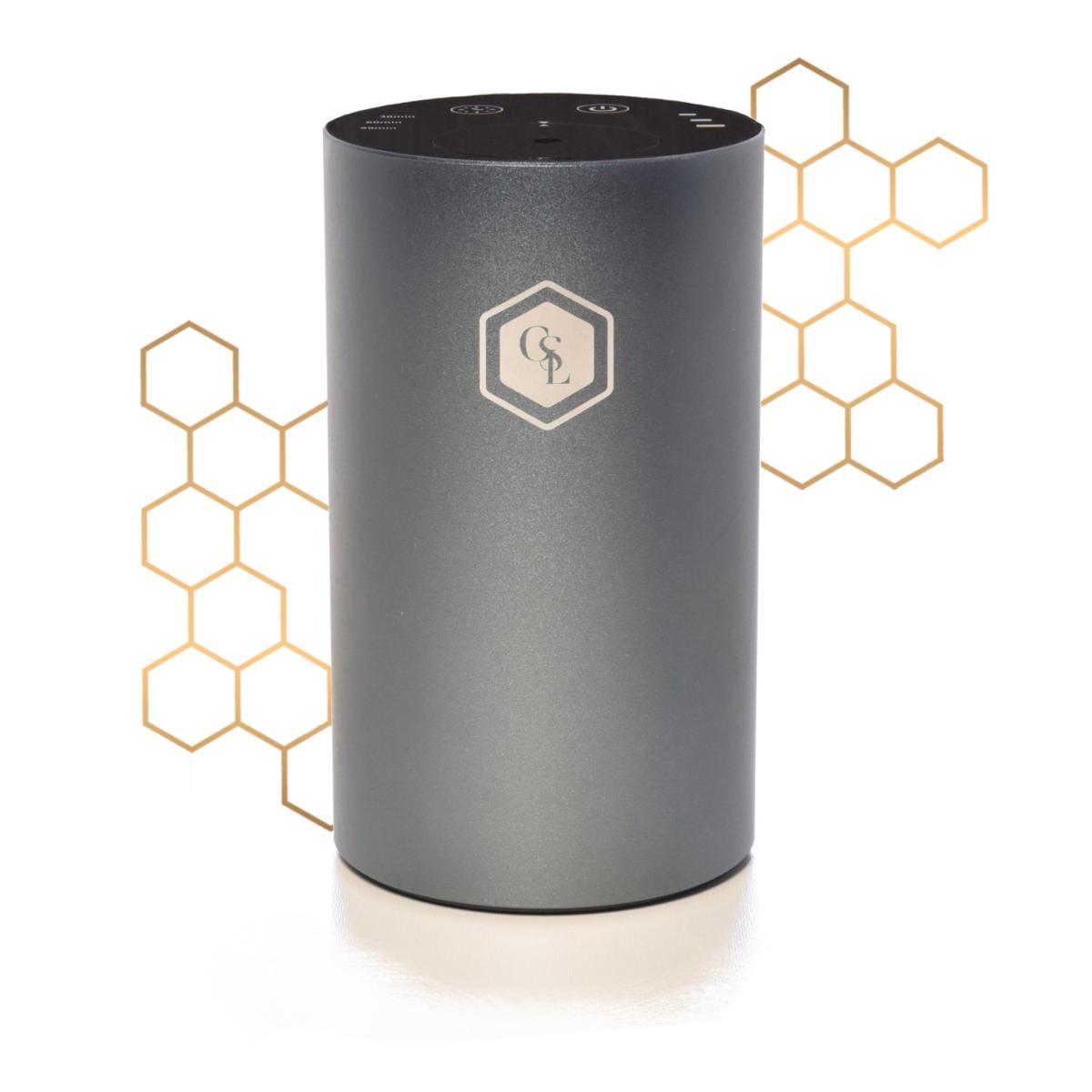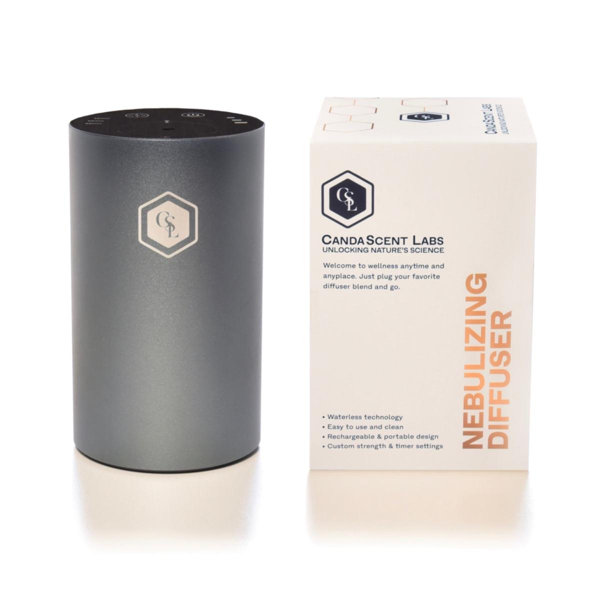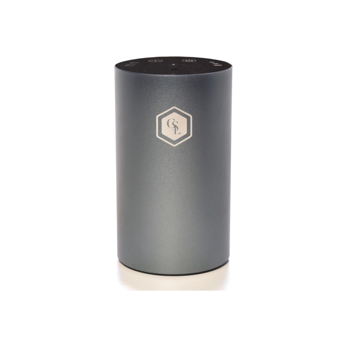 Wellness anytime and anyplace. The Nebulizing Waterless Diffuser is a mini yet mighty scent diffuser that leverages waterless, cold diffusion technology in a sleek and portable design. This battery-powered, USB rechargeable diffuser is perfect for your home office, bedroom, your car, or your hotel room, with a simple-to-use interface that allows you to customize the intensity and duration of your desired aroma experience. Featuring a chic pewter finish, the aluminum body of the Nebulizing Diffuser is a timeless accent to any corner of your home. Pair the Nebulizing Waterless Diffuser with Canda Scent Labs sophisticated and fresh aromatic diffuser blends (sold separately), made with antioxidant and anti-inflammatory 100% botanical ingredients to enjoy wellness formulations whenever you like.