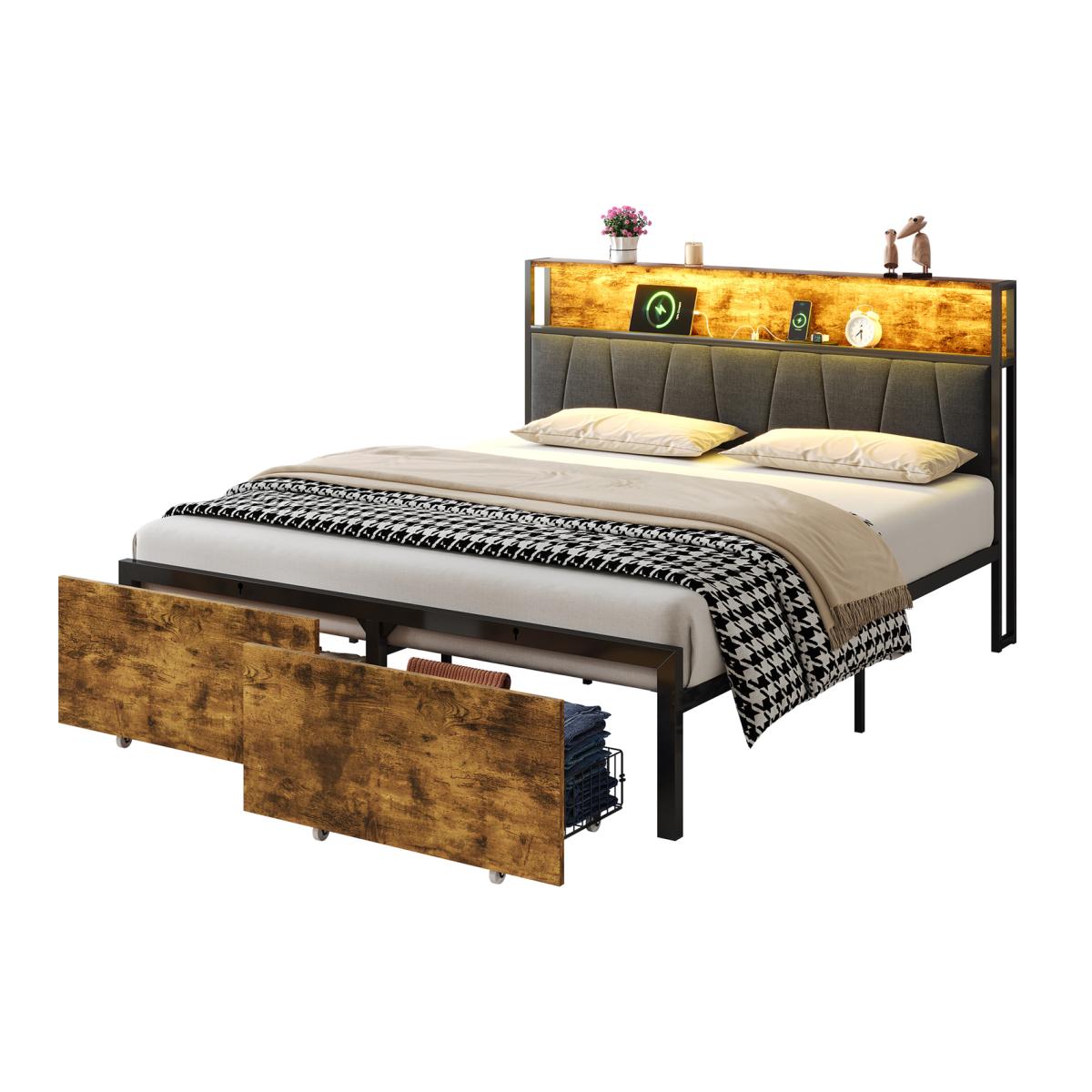 This bed frame has ample storage space, you can store blankets, storage boxes, toys and others in the storage drawers, headboard storage and under bed space to make your bedroom neat and organised. Its bedside equipped with Type-C port, USB port and a power outlet ensure your devices are always charged and ready to use. Combined RGB LED stripe, this upholstered bed frame can lend chic and subtle beauty to your bedroom. The headboard padded with high resilience sponge and covered soft linen fabric to give you better support when reading and relax. Its rustic wood finish imparts a cozy charm, enhancing the ambiance and creating a warm and welcoming environment.