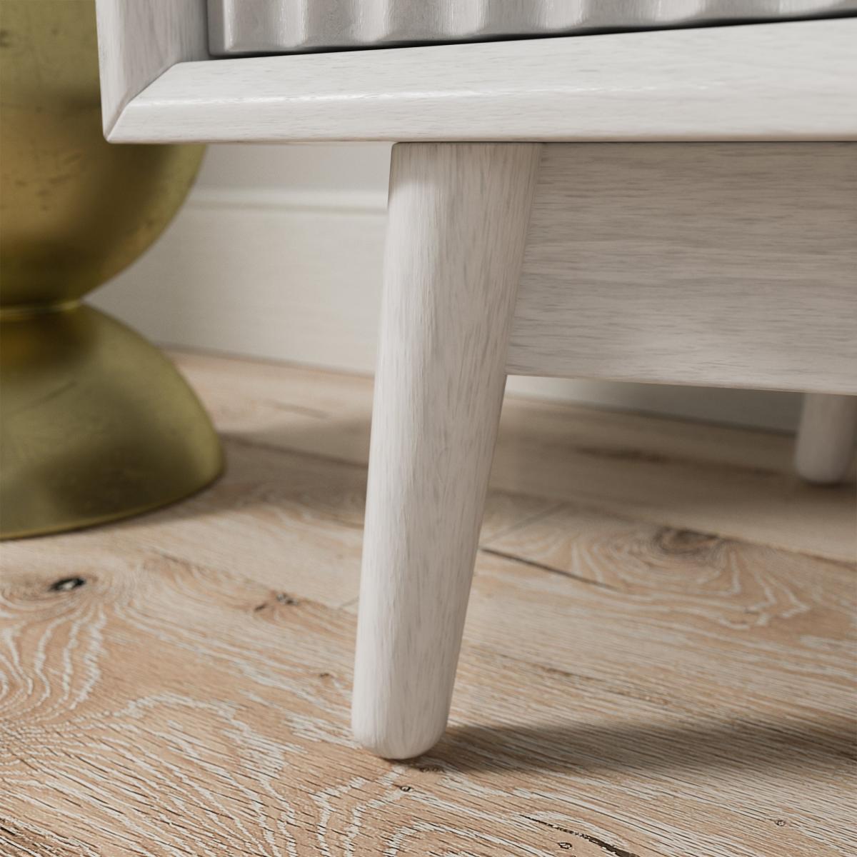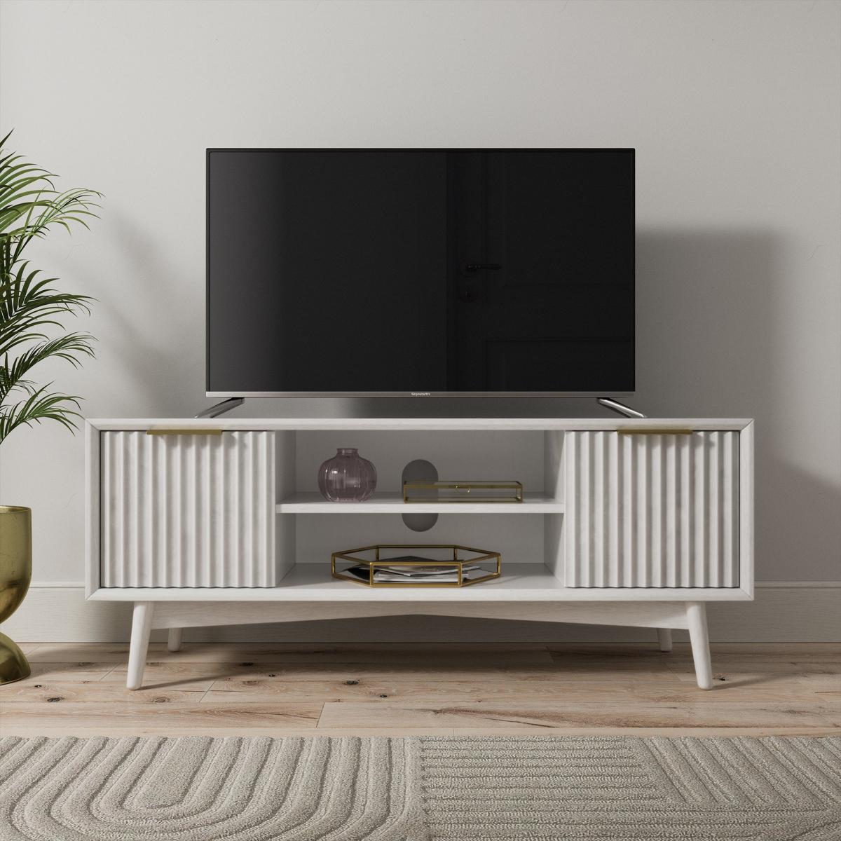 Add a little pizzazz to your living space with this fun and casual TV unit. Featuring a washed white painted finish and champagne metal handles, it's sure to make a statement in any room. Not only is it aesthetically pleasing, but its fluted front design, open shelves, and hole for cable management make it highly functional too. Whether you're setting up the perfect entertainment centre or just need a little extra storage space, this TV bench is sure to be the talk of the town!.