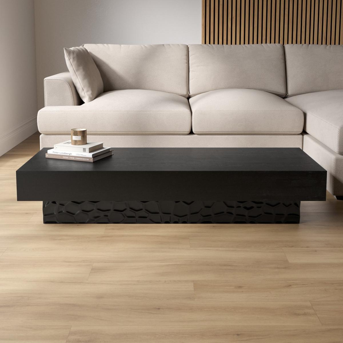 Add a unique touch to your home with this modern rectangular coffee table. It's immediately eye-catching thanks to the handcrafted wood carvings on the base that create its chic textured surface. Further enhanced by its chunky low profile, its large table top allows you to place a set of stylish coasters or a trendy floral arrangement. It would look great positioned centrally in your living room. Delivered fully assembled, you can use it right away.