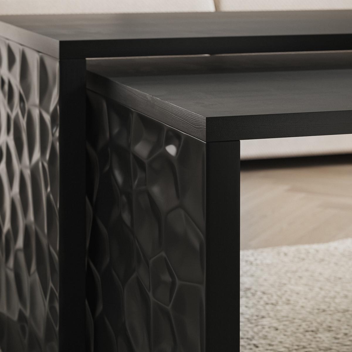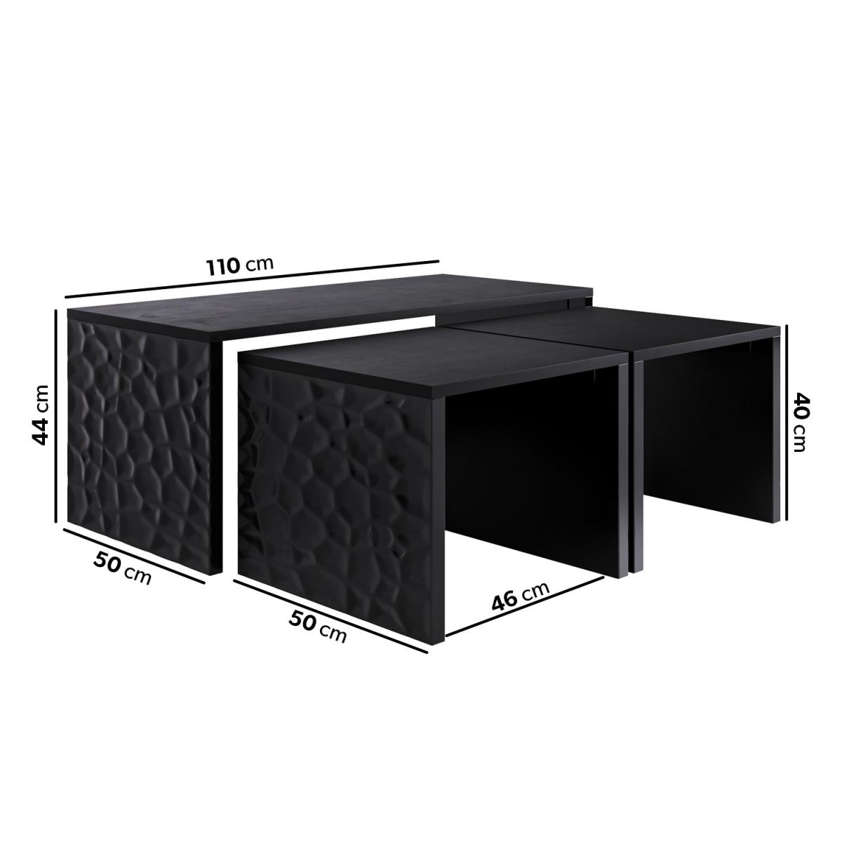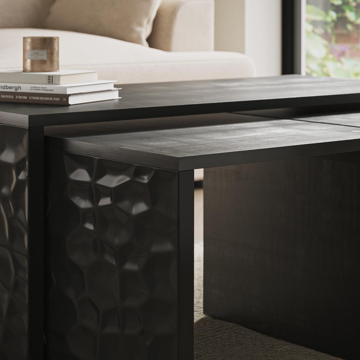 Maximise your floor space with this modern nest of three tables. Each table is immediately eye-catching thanks to the hand-crafted wood carvings on the sides that create its chic textured surface. The long table is perfect as a coffee table. The small tables tucked neatly beneath are space-saving and can be pulled out and adapted in an instant. Place in the living room, conservatory or anywhere you might need extra surface space. Delivered assembled, you can use them right away.