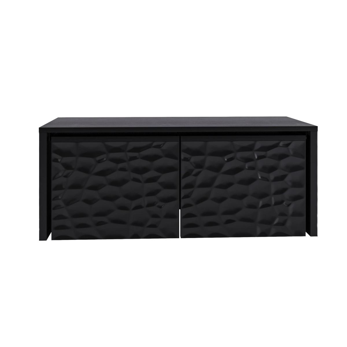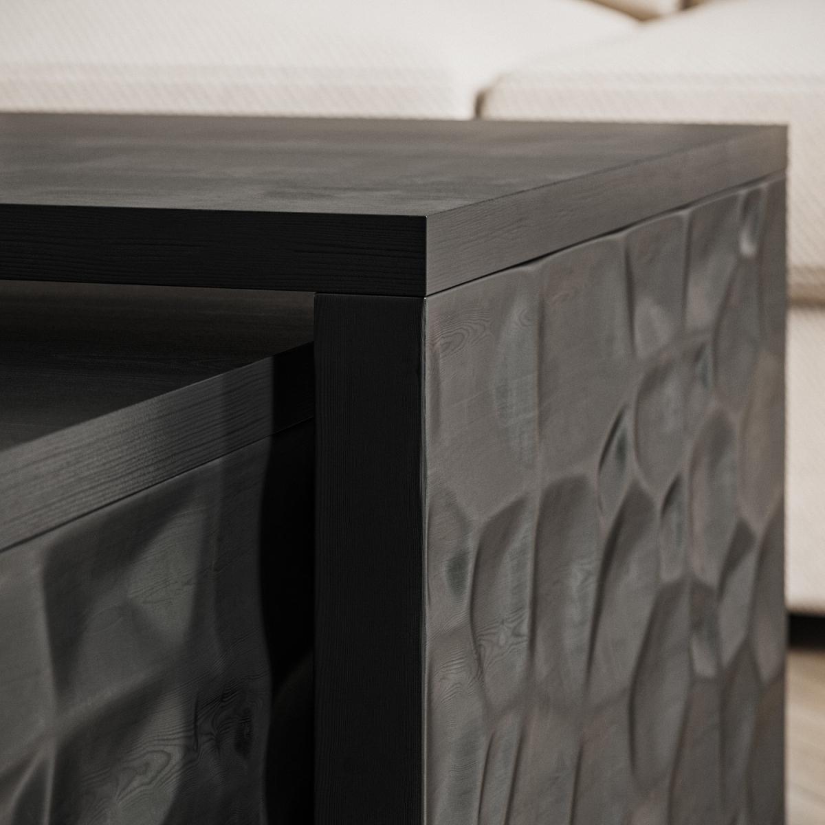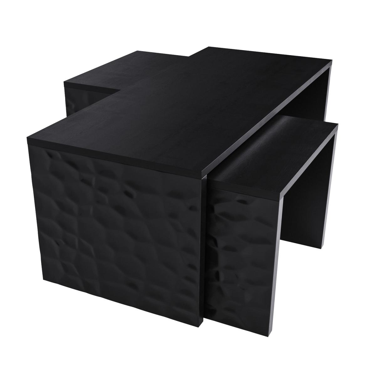 Maximise your floor space with this modern nest of three tables. Each table is immediately eye-catching thanks to the hand-crafted wood carvings on the sides that create its chic textured surface. The long table is perfect as a coffee table. The small tables tucked neatly beneath are space-saving and can be pulled out and adapted in an instant. Place in the living room, conservatory or anywhere you might need extra surface space. Delivered assembled, you can use them right away.