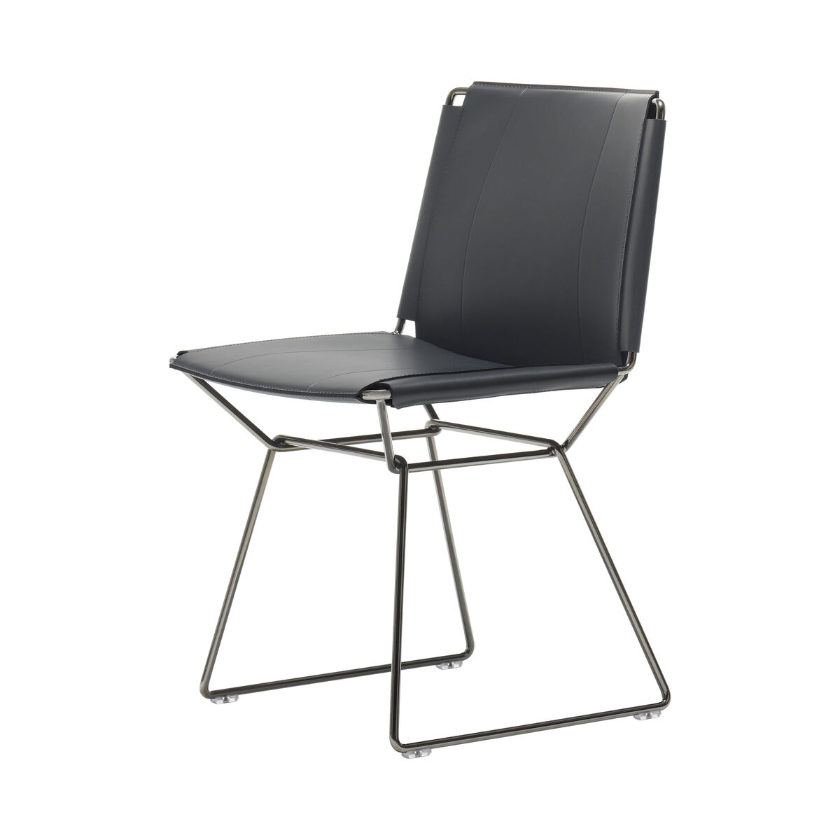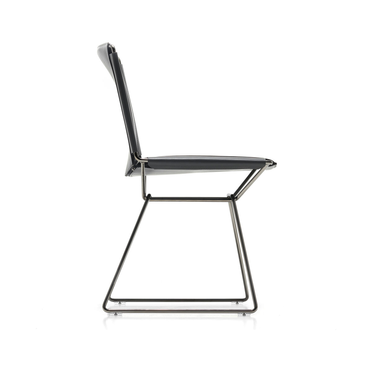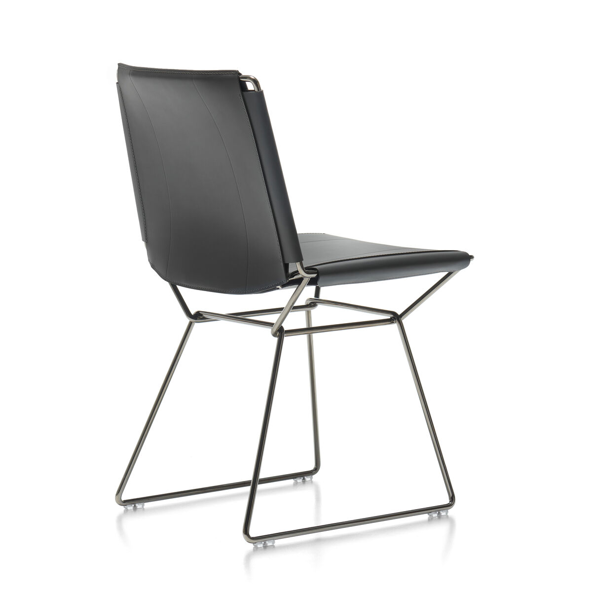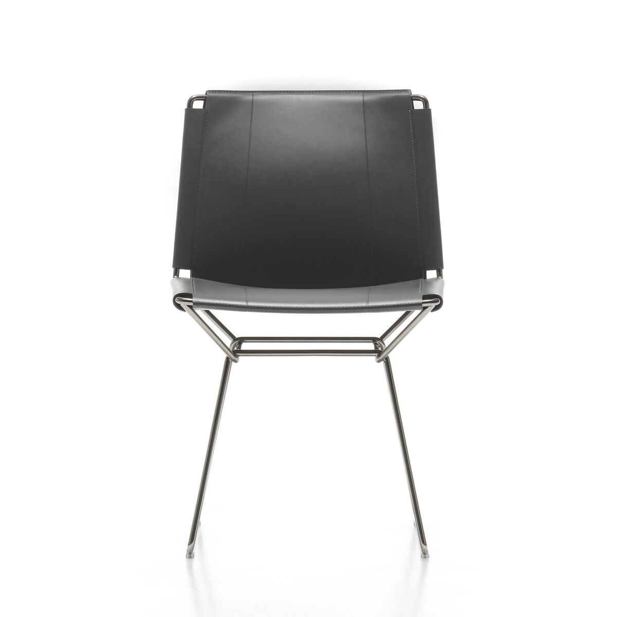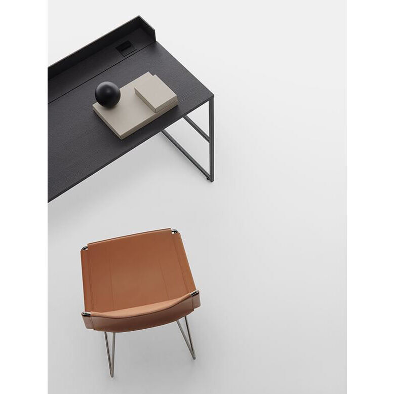 Minimalist, elegant, light and sophisticated, the iconic Neil chair by Jean-Marie Massaud is getting an update with a luxurious saddle-leather version. Neil took inspiration from the classic shape and "historic" traits of the Bauhaus period: A very simple frame made from steel wire and a seat and backrest made from taut saddle leather. Hand-crafted in Italy, the full-grain saddle-leather upholstery of a great thickness requires real expertise. This traditional hand sewing technique guarantees great sturdiness. Every detail is extremely meticulous: seams in heavy duty thread, dyed edges, and pressed areas on the leather surface form raised decorations that emphasise the tension and pattern. Like beautiful, luxury leather goods, the saddle-leather upholstery is simply stretched taut across the fine chrome-plated steel structure. It guarantees an unexpected comfort despite its formal simplicity. Marrying design and craftsmanship, the Neil chair adapts to different contexts, from the more traditional to the more contemporary.