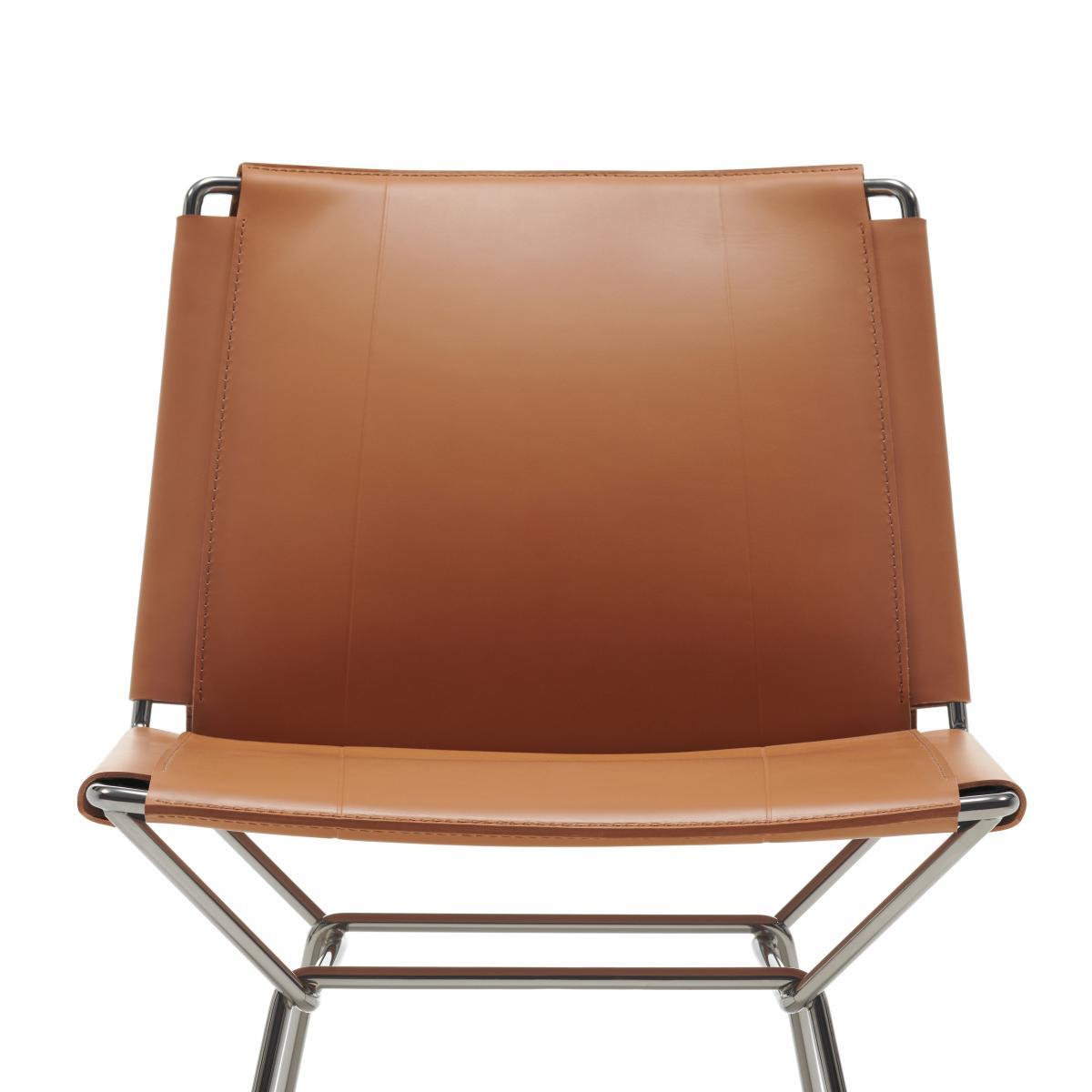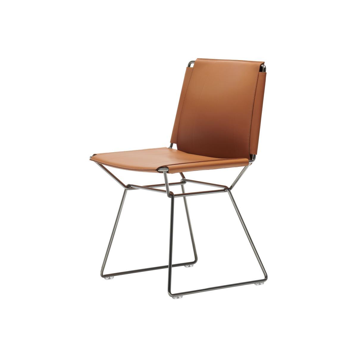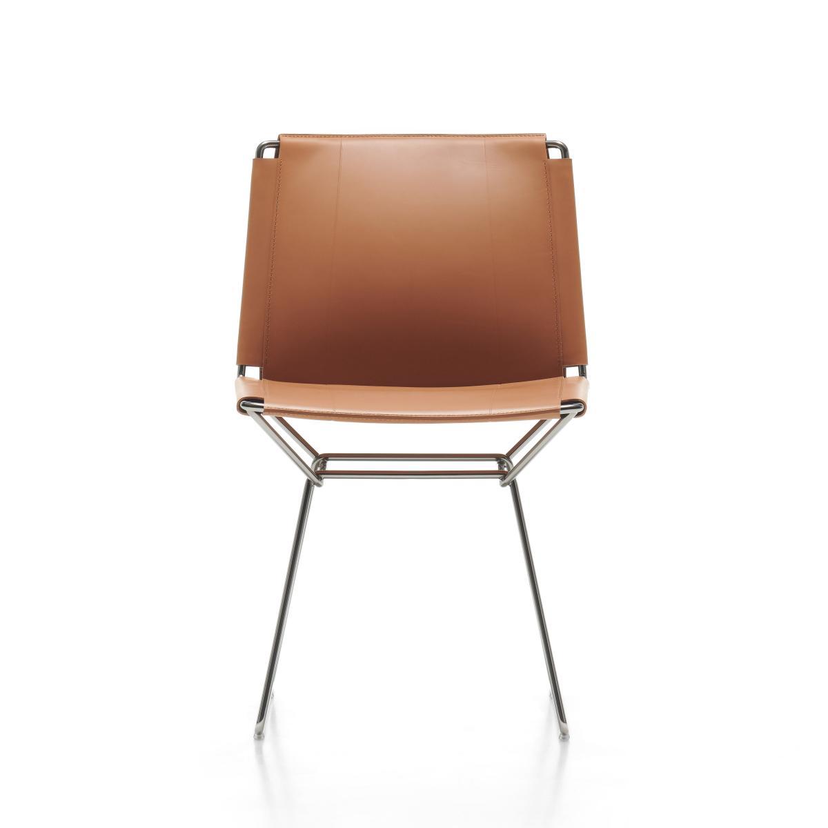 Minimalist, elegant, light and sophisticated, the iconic Neil chair by Jean-Marie Massaud is getting an update with a luxurious saddle-leather version. Neil took inspiration from the classic shape and "historic" traits of the Bauhaus period: A very simple frame made from steel wire and a seat and backrest made from taut saddle leather. Hand-crafted in Italy, the full-grain saddle-leather upholstery of a great thickness requires real expertise. This traditional hand sewing technique guarantees great sturdiness. Every detail is extremely meticulous: seams in heavy duty thread, dyed edges, and pressed areas on the leather surface form raised decorations that emphasise the tension and pattern. Like beautiful, luxury leather goods, the saddle-leather upholstery is simply stretched taut across the fine chrome-plated steel structure. It guarantees an unexpected comfort despite its formal simplicity. Marrying design and craftsmanship, the Neil chair adapts to different contexts, from the more traditional to the more contemporary.