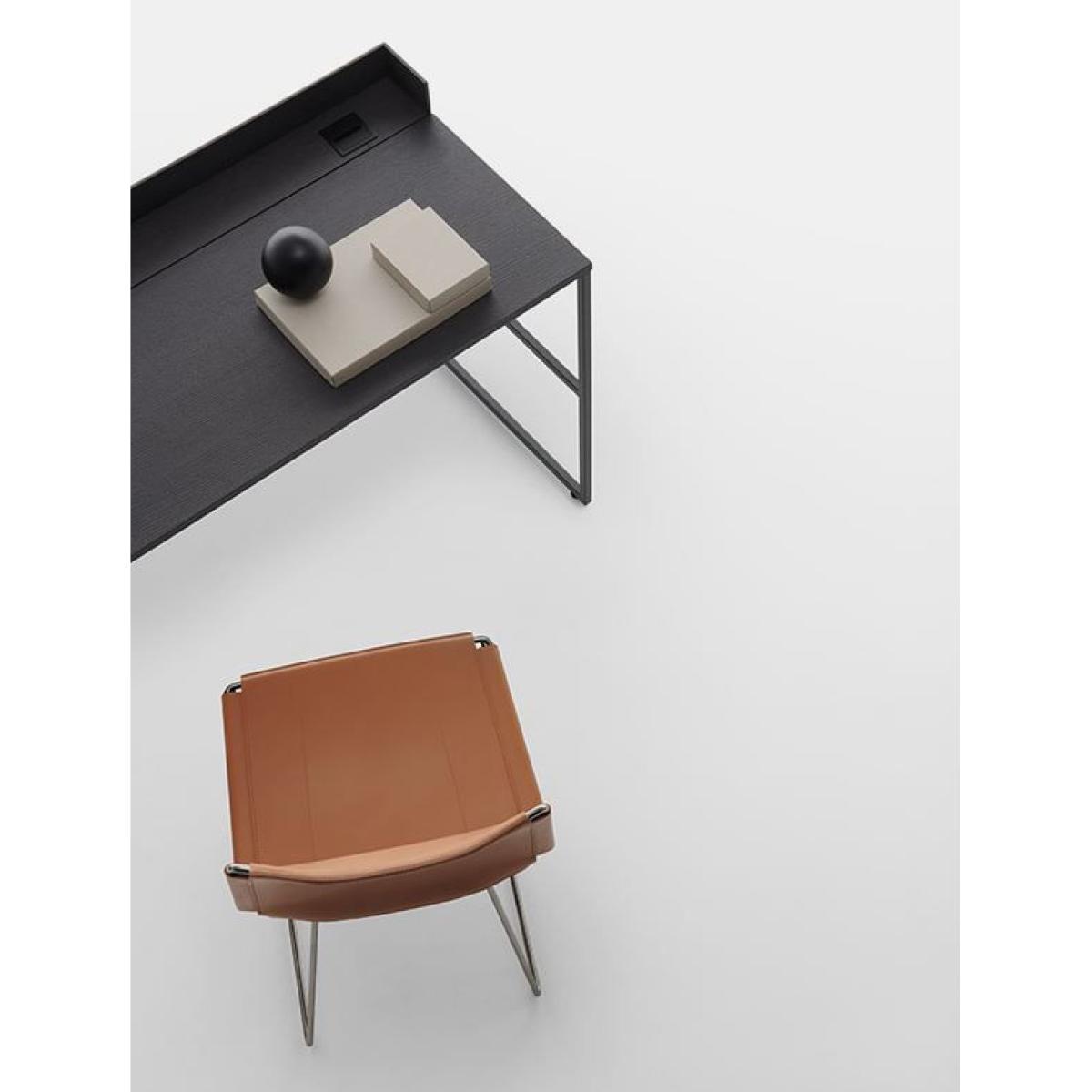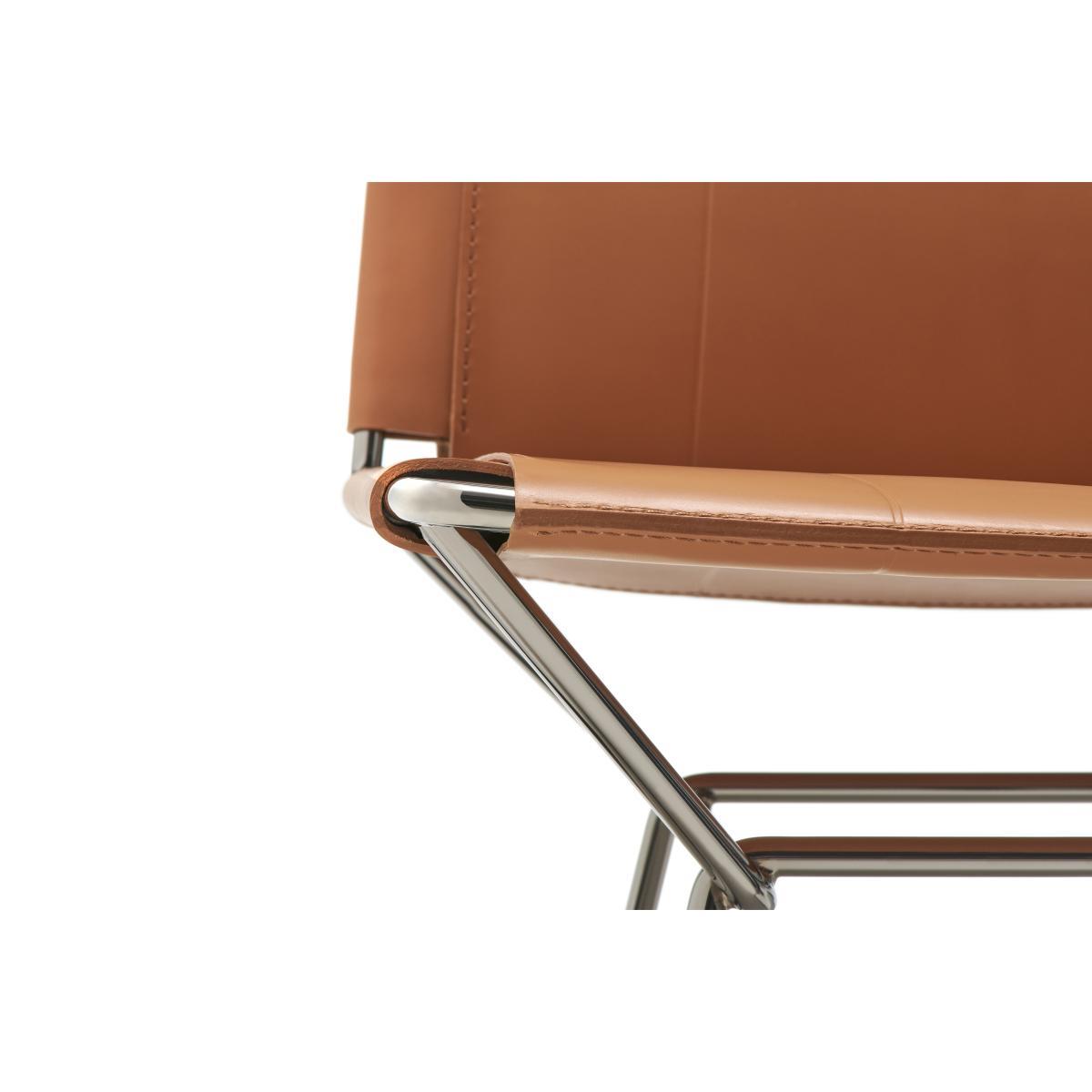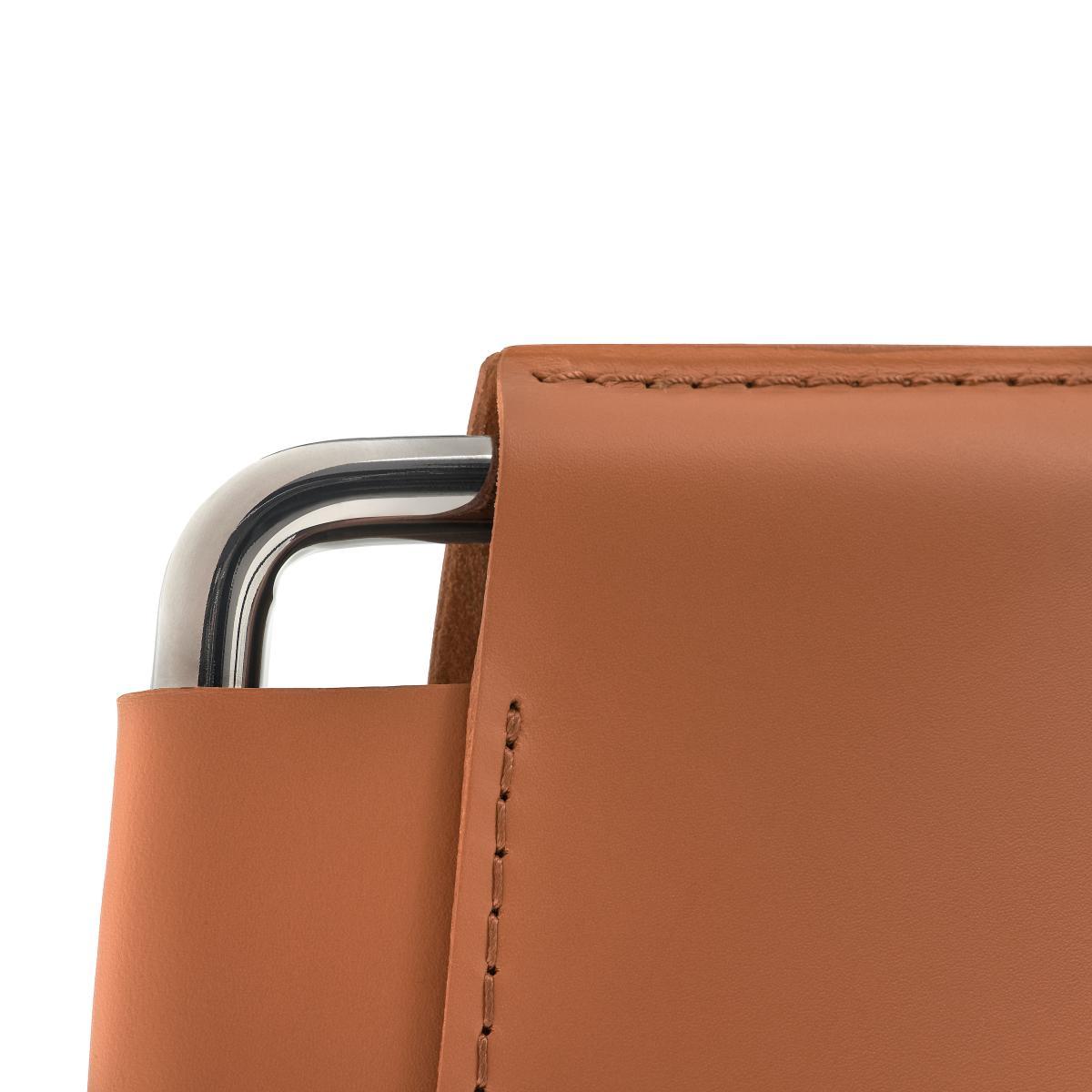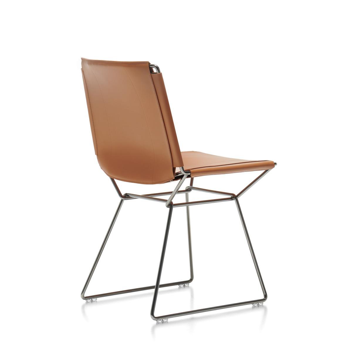 Minimalist, elegant, light and sophisticated, the iconic Neil chair by Jean-Marie Massaud is getting an update with a luxurious saddle-leather version. Neil took inspiration from the classic shape and "historic" traits of the Bauhaus period: A very simple frame made from steel wire and a seat and backrest made from taut saddle leather. Hand-crafted in Italy, the full-grain saddle-leather upholstery of a great thickness requires real expertise. This traditional hand sewing technique guarantees great sturdiness. Every detail is extremely meticulous: seams in heavy duty thread, dyed edges, and pressed areas on the leather surface form raised decorations that emphasise the tension and pattern. Like beautiful, luxury leather goods, the saddle-leather upholstery is simply stretched taut across the fine chrome-plated steel structure. It guarantees an unexpected comfort despite its formal simplicity. Marrying design and craftsmanship, the Neil chair adapts to different contexts, from the more traditional to the more contemporary.