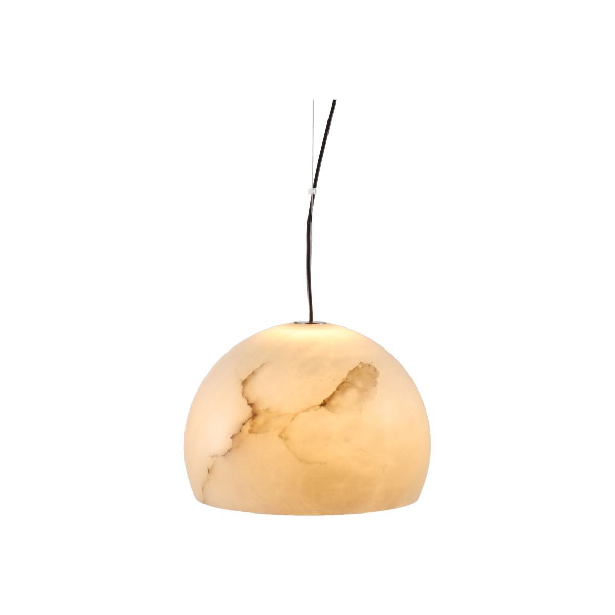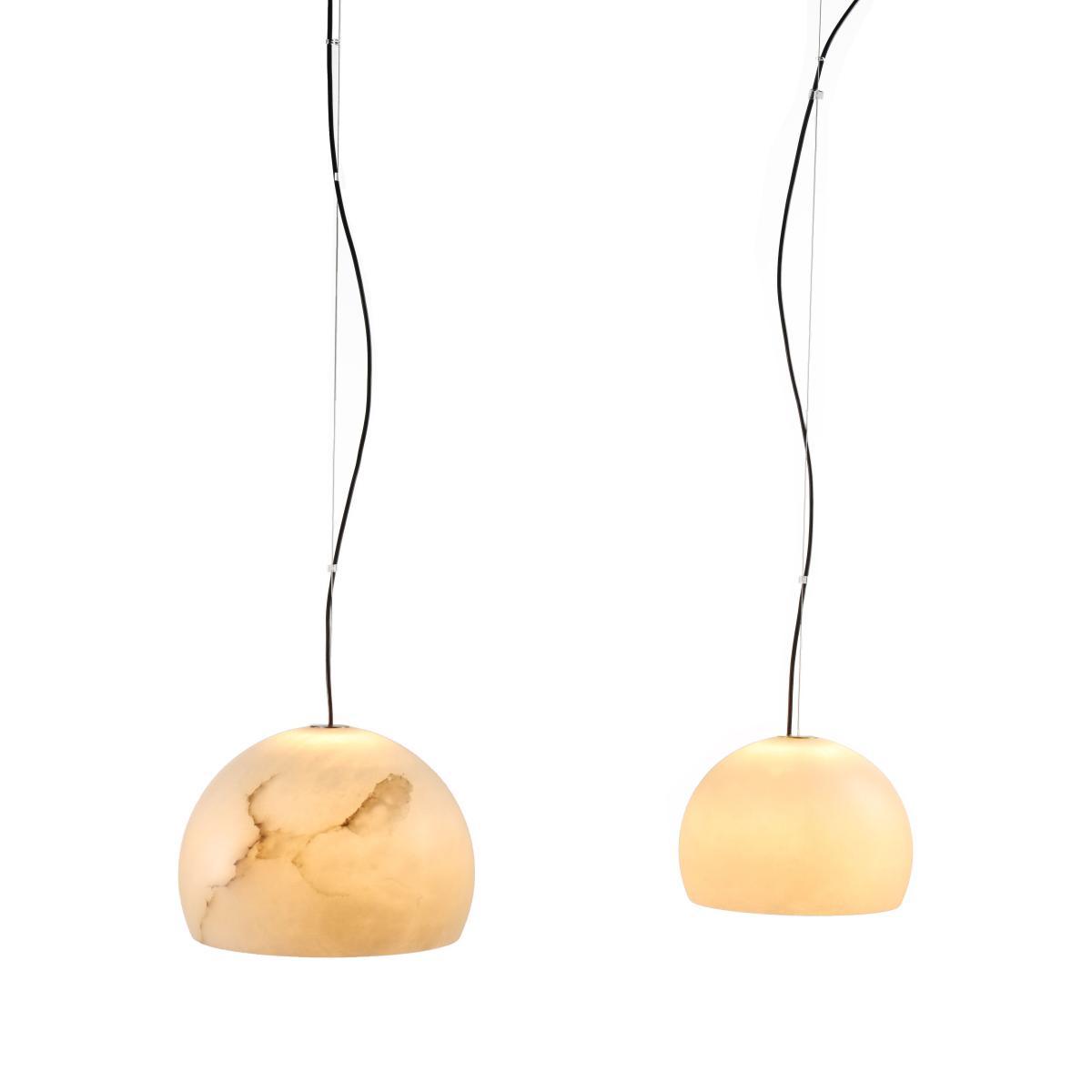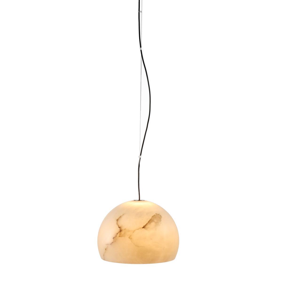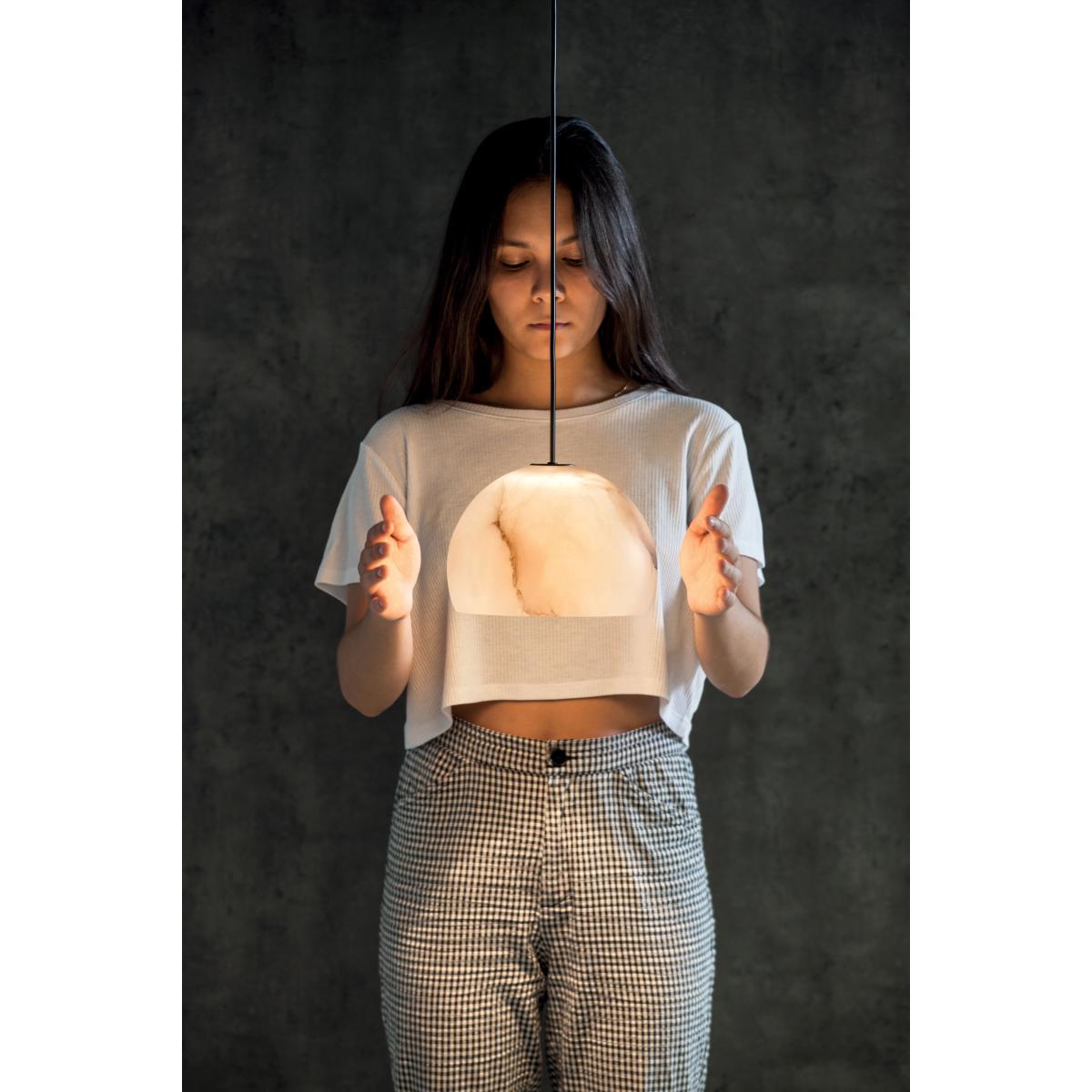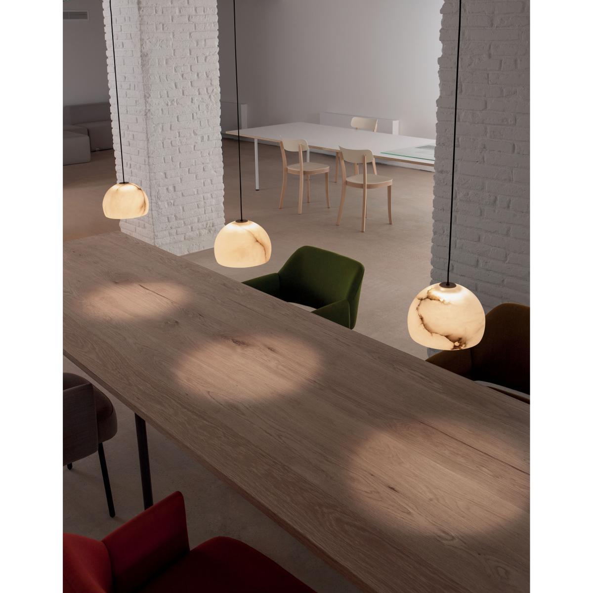 The designer Xavier Solé introduces alabaster into the world of modern design. Robust although delicate and sophisticated, the Neil pendant showcases wonderful work on the material. The lampshade is made of a single piece of alabaster: The stone is delicately worked with finesse in order to obtain a spherical form that is very thin. When the light is switched on, the lampshade becomes slightly translucent and lights up, highlighting the delicate veins. This material effect creates a wonderful contrast of light and shade on the lampshade. Neil translates the vibratory richness of alabaster, a stone with multiple light and pattern variations. The alabaster gives off a delicate and vivid light, inviting contemplation.