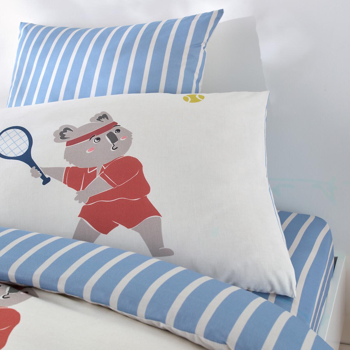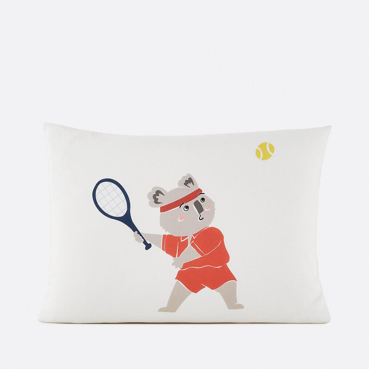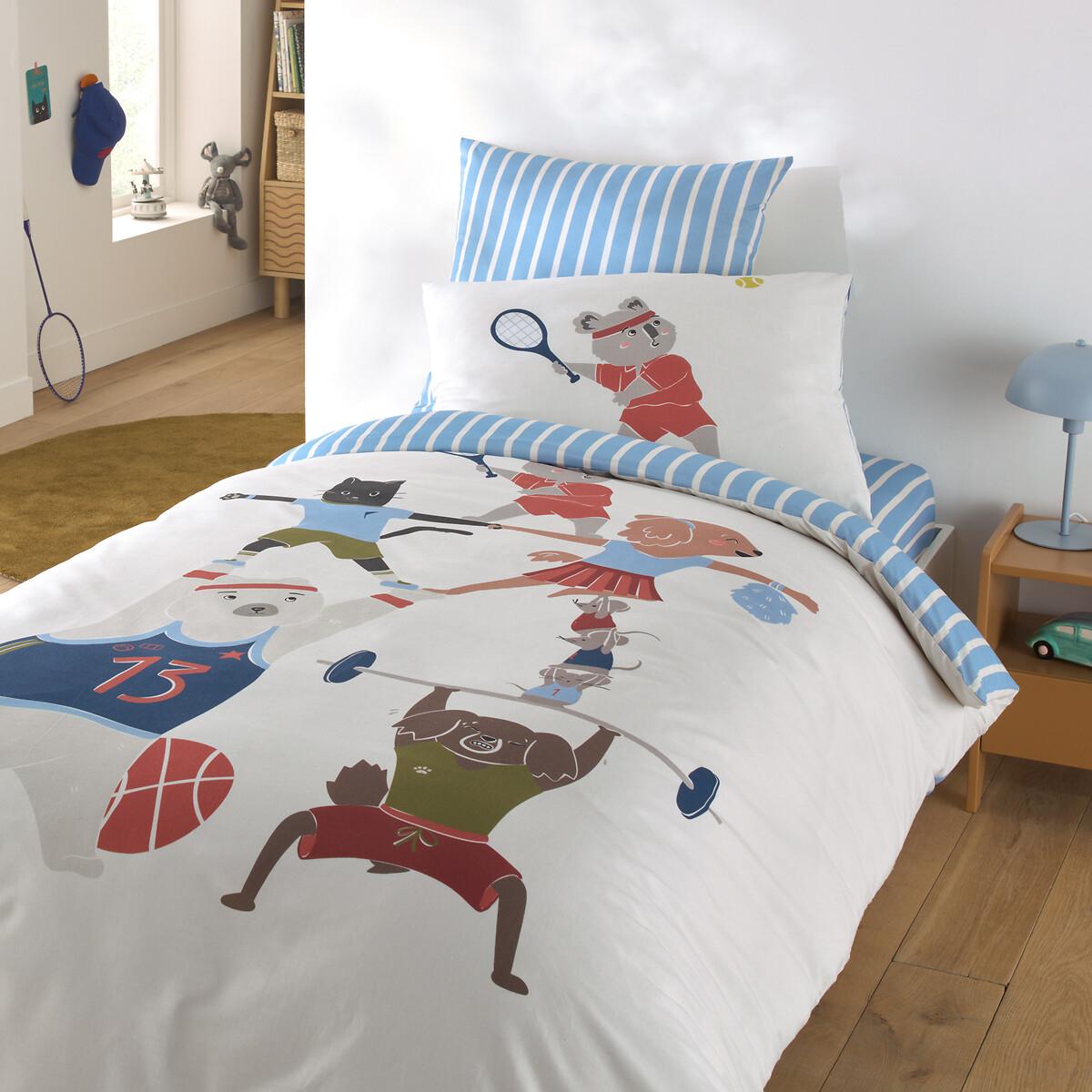 Acrobatic gymnastics, tennis or weightlifting... Find playful, cute little characters on these fresh, contemporary bed linens. The Neilo pillowcase will accompany the dreams of little sportsmen and women!Designed by La Redoute Intérieurs. Cotton is part of our daily lives. We love it for its suppleness and softness. Easy Care, it is ideal for the beds of young and old alike!Product Details • 100% cotton, 115g/m2 • Contains 30% recycled cotton • 144 thread count • Animal print on front, stripes on back. As the seasons go by, add your own personal touch by mixing Neilo bed linen with our range of Scénario plains. Care Advice • Machine washable at 60°C • By washing your laundry at 40°C instead of 60°C, you limit energy consumption. Dimensions • 50 x 70cm: Rectangular pillowcase • 63 x 63cm: Square pillowcase • Recycled cotton. Using recycled cotton is all about conserving resources and reducing waste. • OEKO-TEX® Standard 100. Standard 100 certification by OEKO-TEX® tests textile products for harmful substances via an independent, international label.