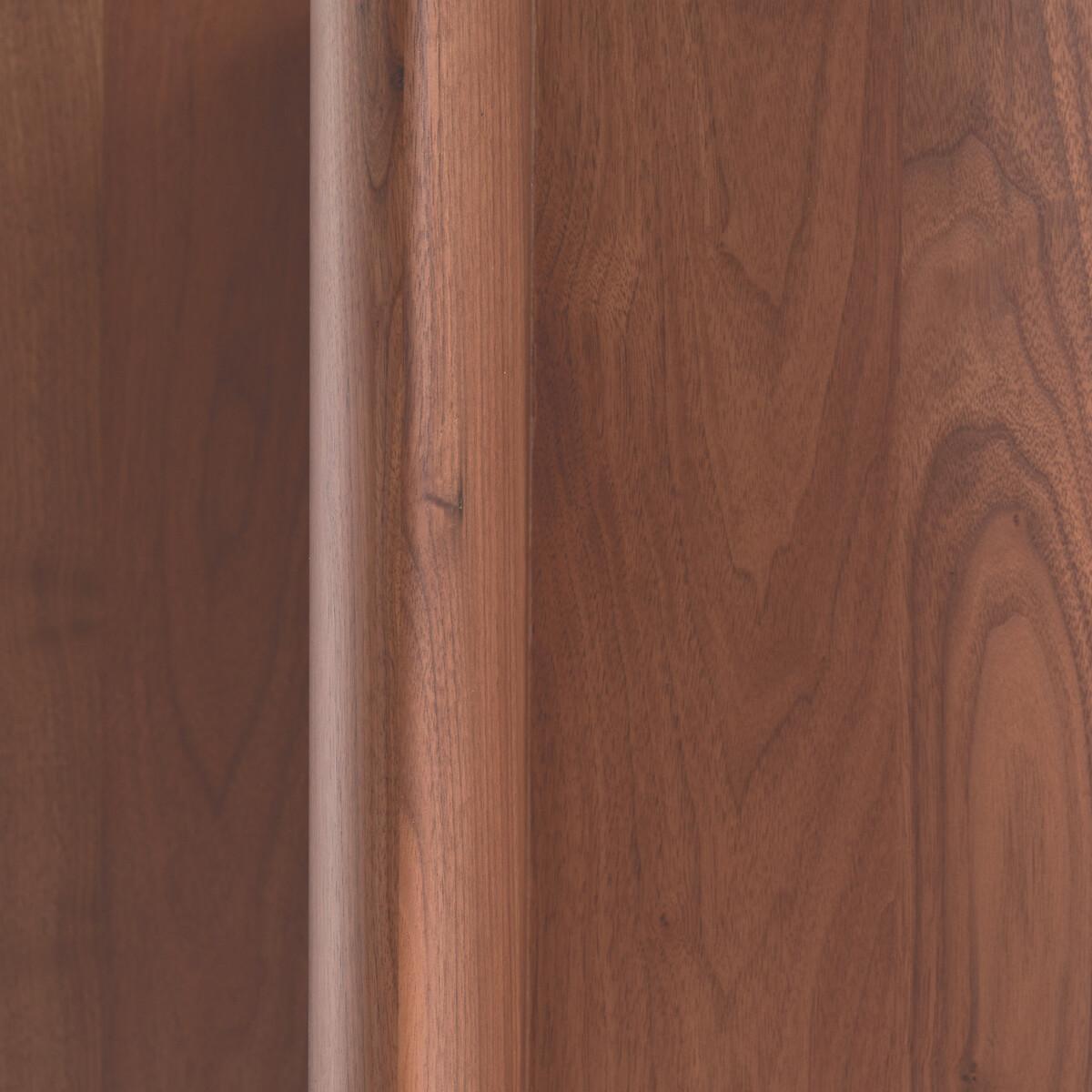 The Nella table has an organic top in tempered glass and a base worked in solid walnut.