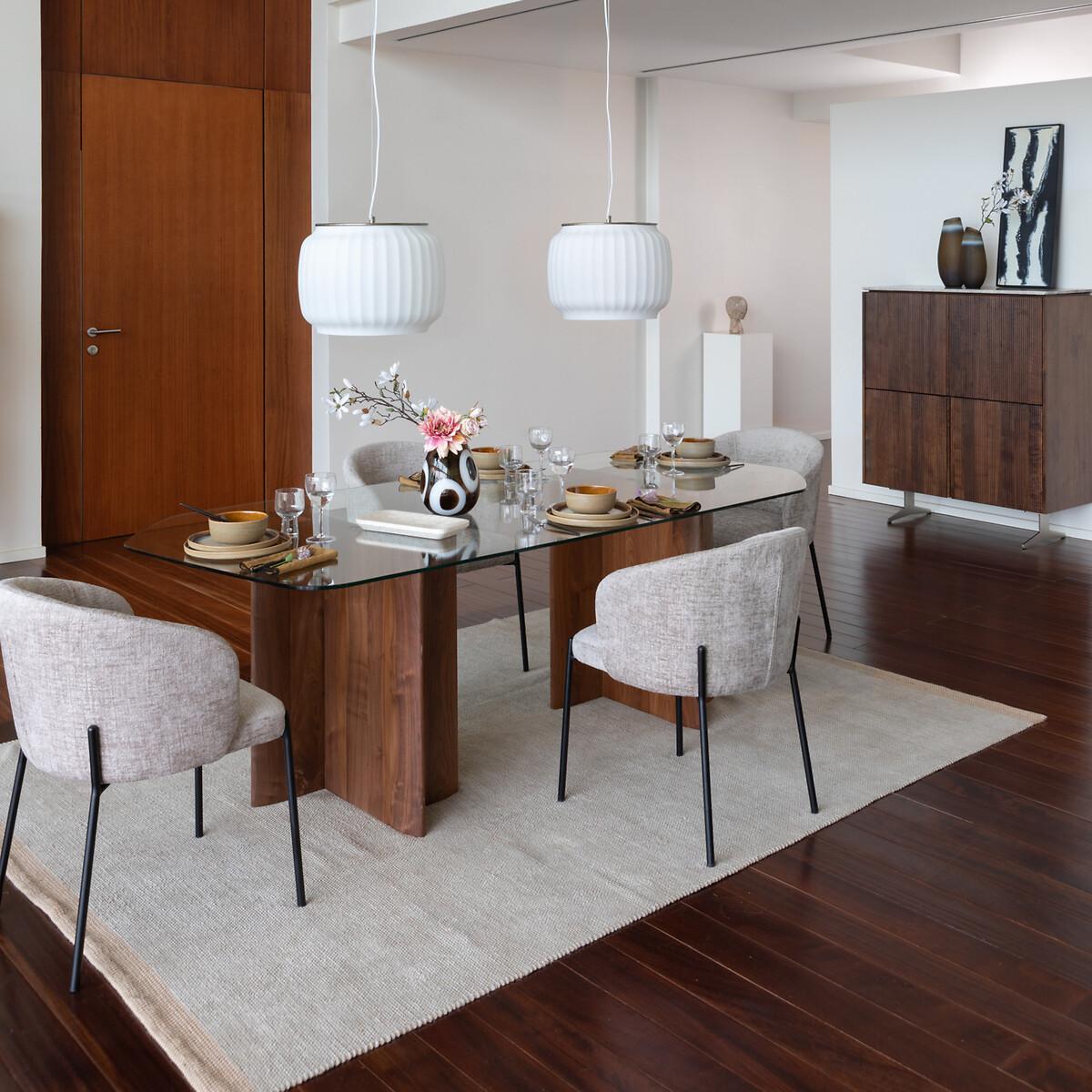 I love this dining table for its modern yet timeless appeal-combining warm walnut with sleek glass creates a versatile piece that suits both contemporary and classic interiors. It's perfect for open-plan living spaces, adding a sense of sophistication without feeling overwhelming. To style around it, consider minimalist or Scandinavian decor with neutral tones and textured textiles, which will let the natural wood and glass stand out. Practical tips include using a simple runner or centrepiece to highlight the table’s clean lines, and pairing it with chairs that balance comfort and style, like upholstered or timber options. This table works well in spaces that need a functional focal point without sacrificing elegance.