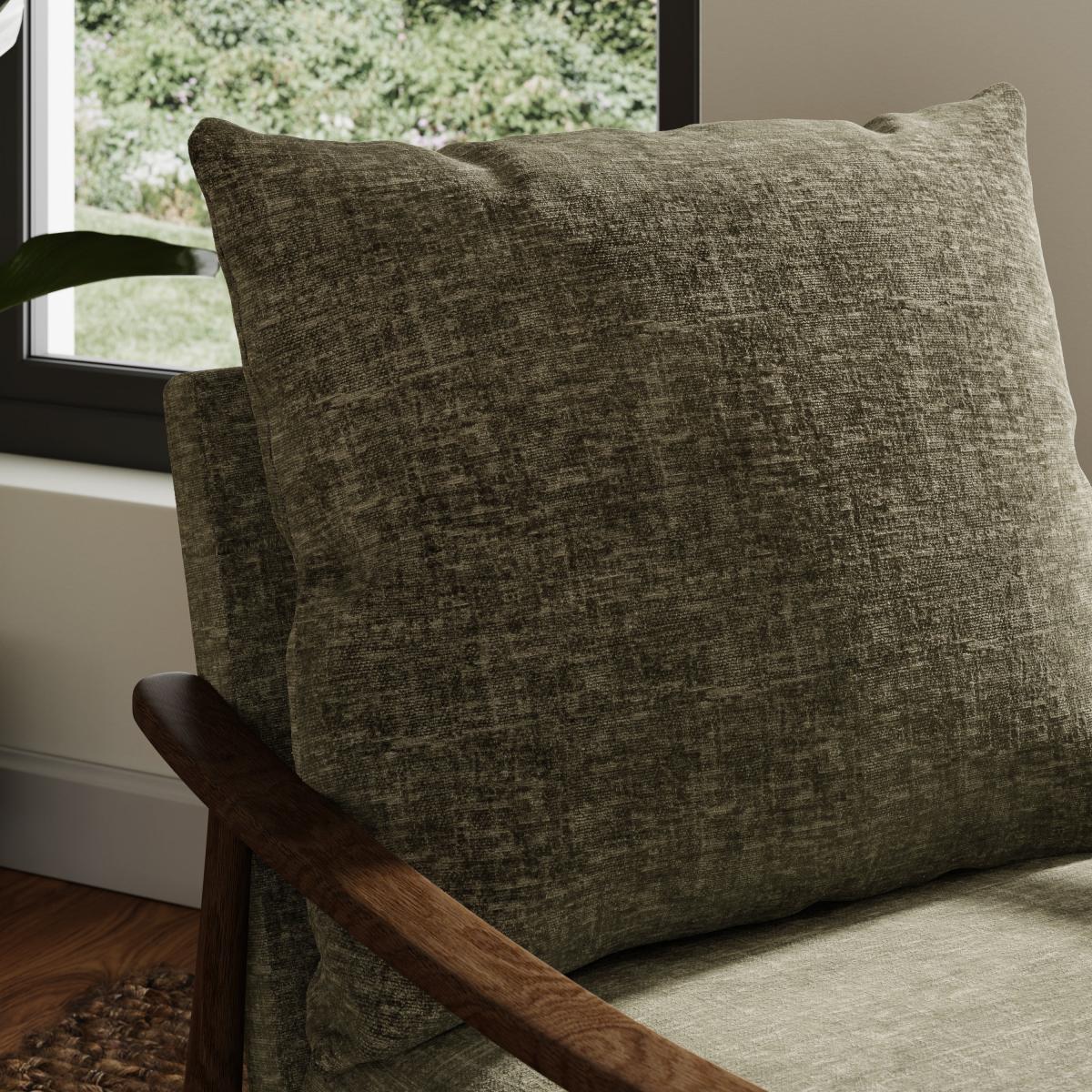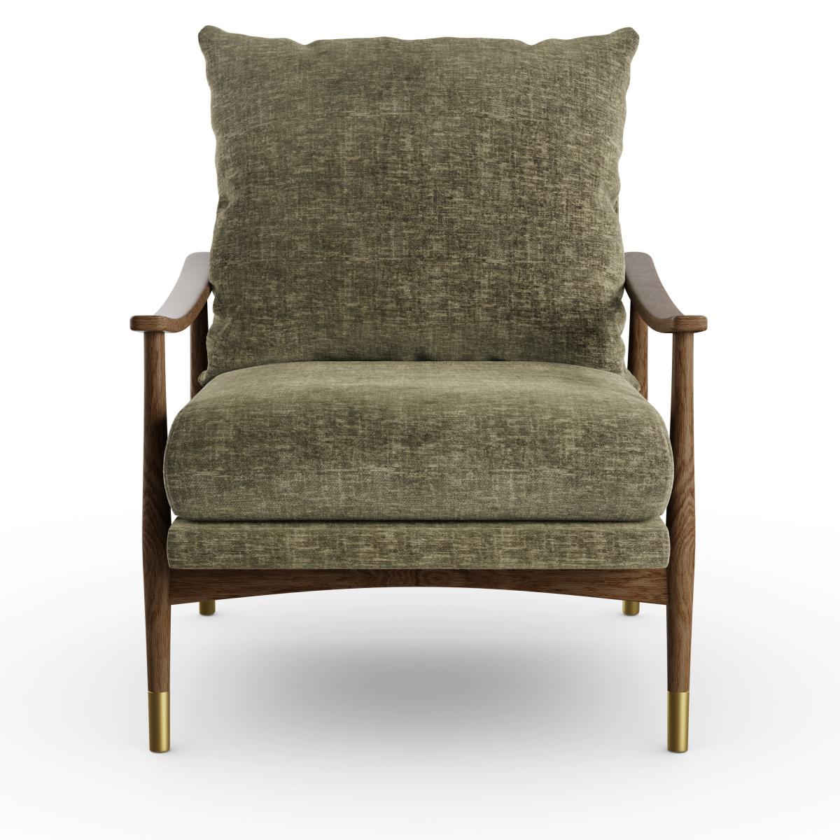 * Wooden frame* Upholstered cushions* Mid-century style Embrace mid-century-inspired style with this upholstered armchair. The earthy olive tones paired with the textured chenille fabric create a sophisticated yet laid-back vibe. Perfect for unwinding after a long day, this armchair offers both comfort and versatility, effortlessly fitting into any décor scheme.