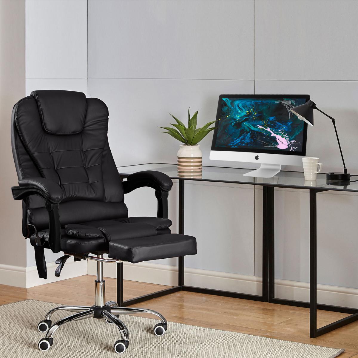 Double padded for extra comfort with heavy duty coating for durability. Comes in leather or fabric options. Pneumatic adjustable height and 360 degree swivel for accessibility. Reclining function with spring tilt control for easy adjustments. Built in comfortable footrest Remote control included for Massage. Matching pouch for storage of remote.5 Massage modes to chose from. Massages Back, Lumbar and Thighs. Flame Resistant Leather Chair. One year manufacturer warranty.