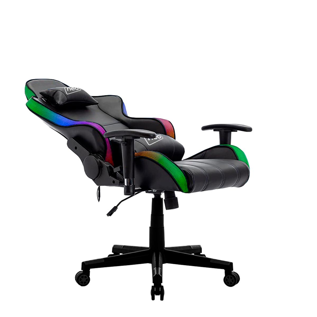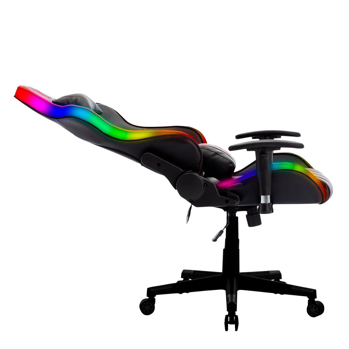 Made with comfort in mind, this chair and its 360-degree swivel allows you to easily move around. With vibrant RGB LEDs that move around the seat and backrest in 30 different patterns and colour combinations. Heavy-duty chrome base sits on nylon castors. Variable seat height. A great addition to any office, home or gaming room. High-quality Material. Padded with premium PU material, the soft backrest and seat are easy to wipe and the high-density sponge helps retain its shape.