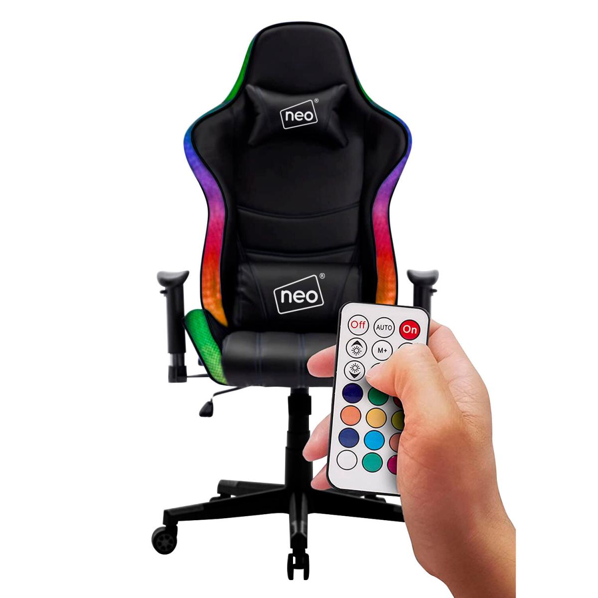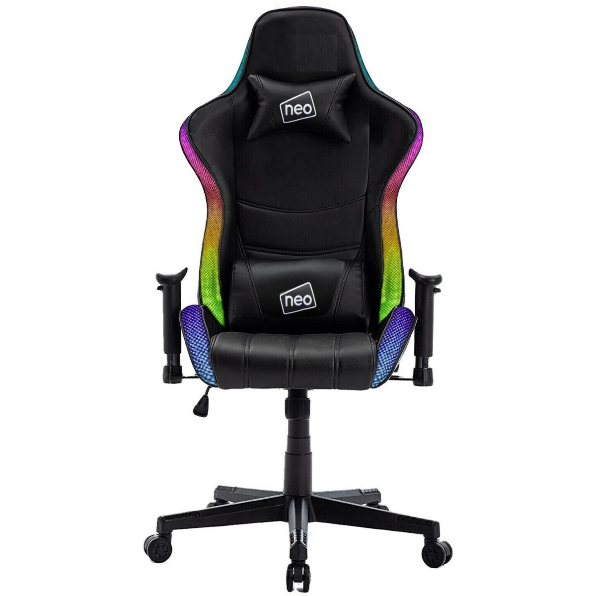 This Neo gaming chair's sleek black and vibrant rainbow accents make it a standout piece in a contemporary gaming setup or a modern home office. I love how its bold design adds a touch of personality without overpowering a space, and it works well in interiors with monochrome or minimalist palettes, adding a pop of colour and function. For styling, position it alongside a streamlined desk and keep surrounding accessories simple to let the chair do the talking. Practical tips include pairing it with a neutral-toned rug or adding matching colourful accessories to create a cohesive look that balances fun and sophistication.