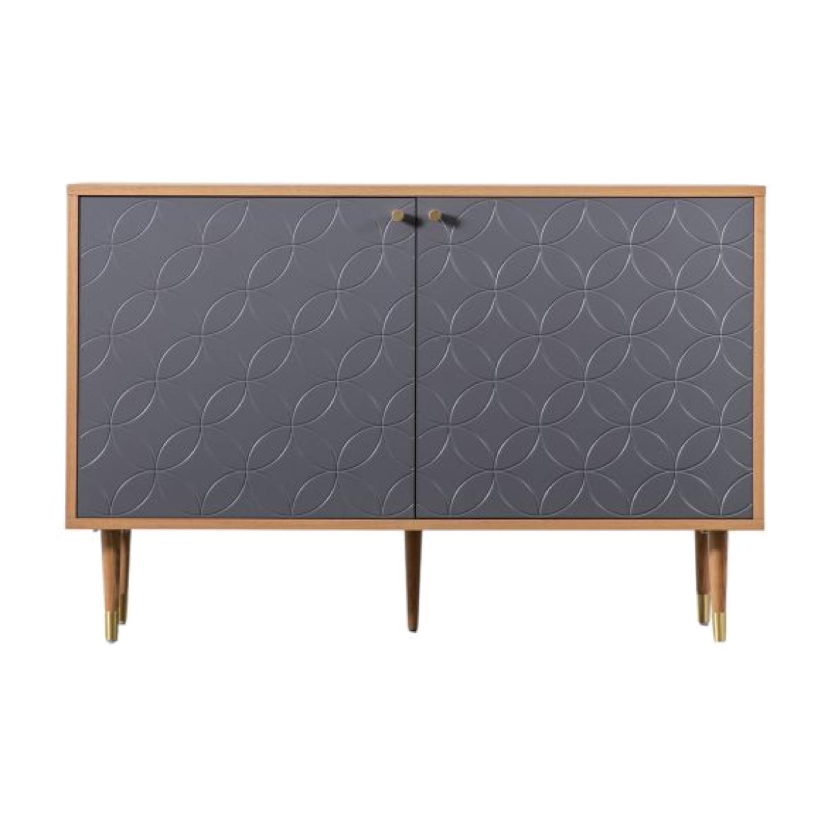 This lovely 2 Door Cabinet makes an unusual eye-catching feature piece, with a combination of a grey painted finish and natural oak veneer. The cabinet combines colour and shape to great effect, with a routed geometric circular pattern, reminiscent of Bauhaus design, on the painted doors. Brass handles on the cupboard doors are complemented by brass ‘socks’ on the solid oak legs. The cabinet is also available in white, and the collection also includes other matching and coordinating pieces. The collection of living furniture is part of our Packed-Flat Design Project, offering easy delivery to any room in any property, whilst reducing the packaging needed. Easy assembly is required, but all the tools needed are supplied. Material: Oak. Colour/Finish: Grey. Number of Doors: 2.