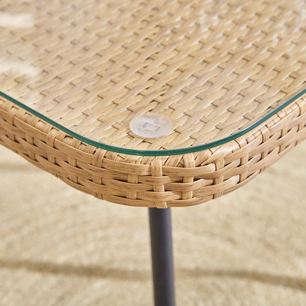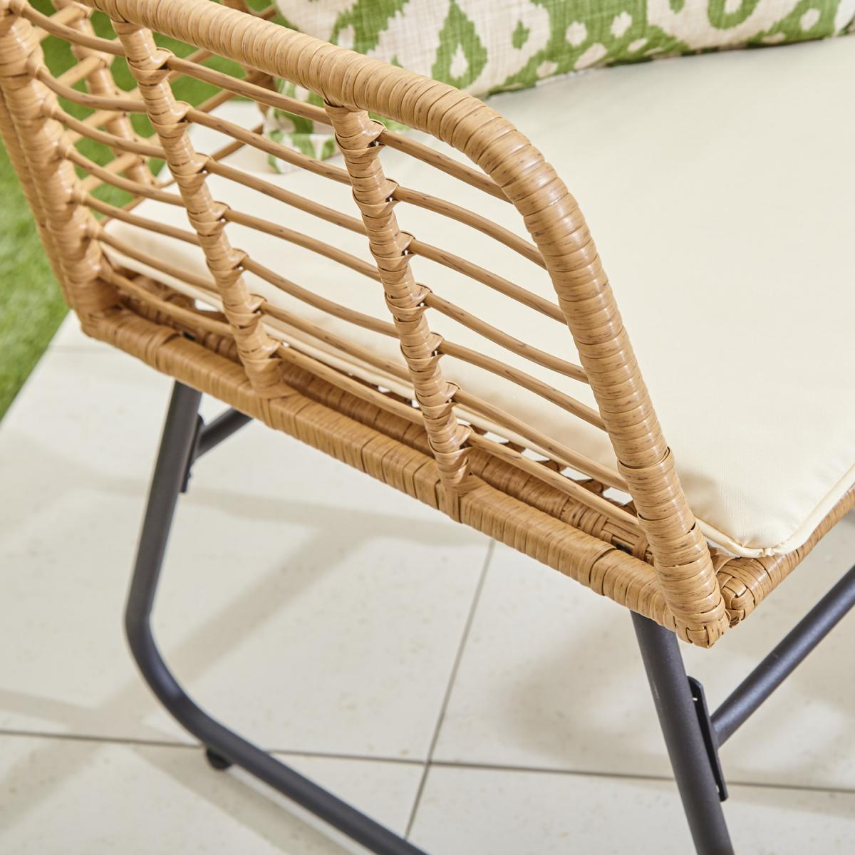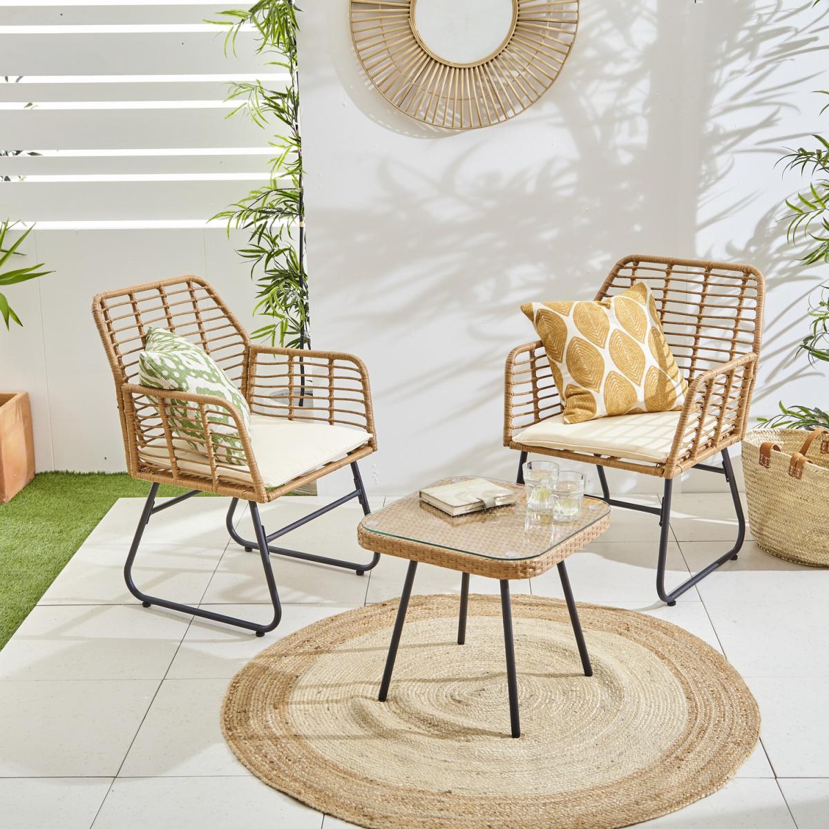 Enjoy your balcony or patio view whilst relaxing on this stunning Neo Bamboo effect bistro set. Now you can enjoy a morning coffee, an afternoon tea or drinks in the evening. The natural bamboo effect armchairs offer comfort, and contrast beautifully with the striking metal black legs. Comes with amply filled cushions for comfort. Cushions can be removed and washed, with a choice of beige or grey colours. The glass topped coffee table makes it easy to wipe. This modern trend-forward set can also be used in a conservatory, a perfect addition to any conservatory or indoor space.