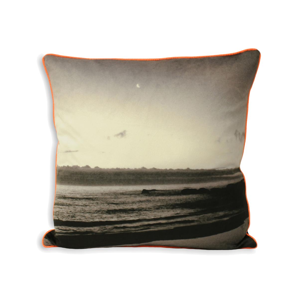 Featuring a monochrome coastal landscape scene and paired with a bright contrasting piped trim.
