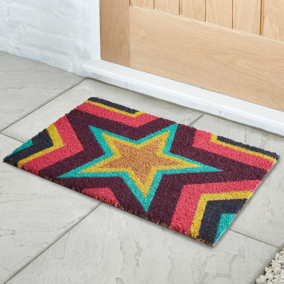 I love this star-themed doormat for its vibrant and playful design, making it a cheerful addition to any porch or hallway. Its bold colours and geometric pattern work particularly well in contemporary or eclectic interiors, adding a pop of colour and personality. Practically, it’s great for adding a touch of fun while being durable enough to handle everyday dirt and debris. Styling tips include pairing it with plain, minimal exterior decor to let it stand out or coordinating with accessories in similar hues indoors for a cohesive look. It's a practical yet lively choice for welcoming guests with colour and charm.