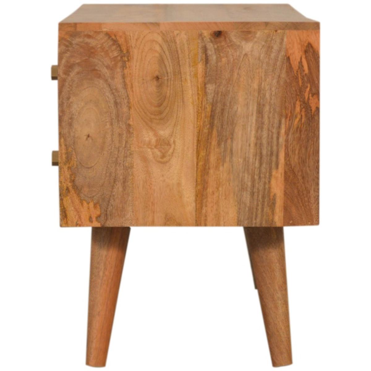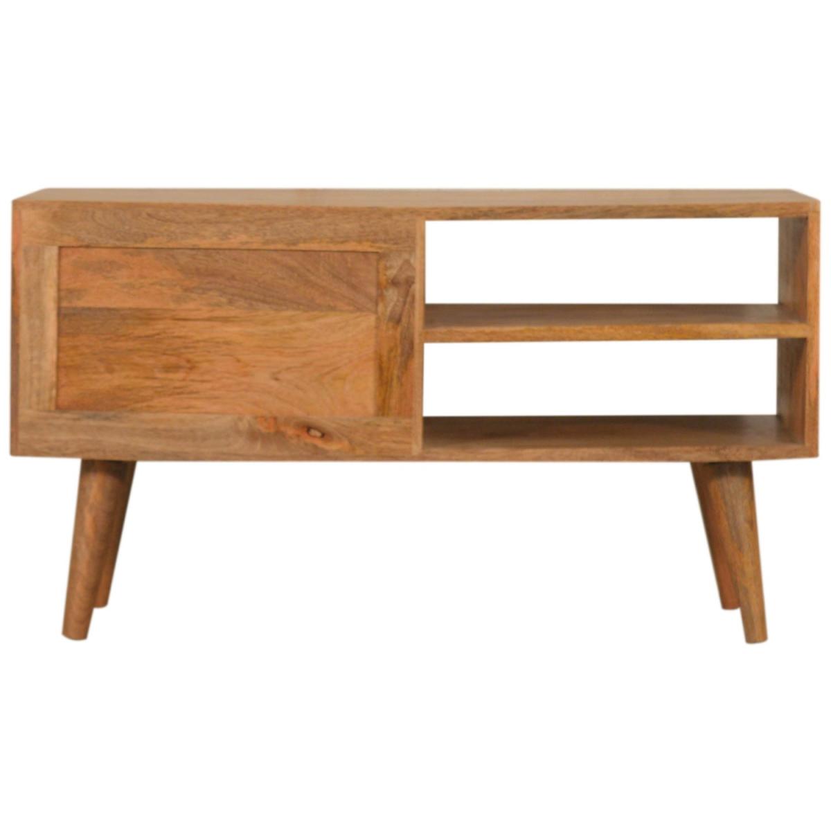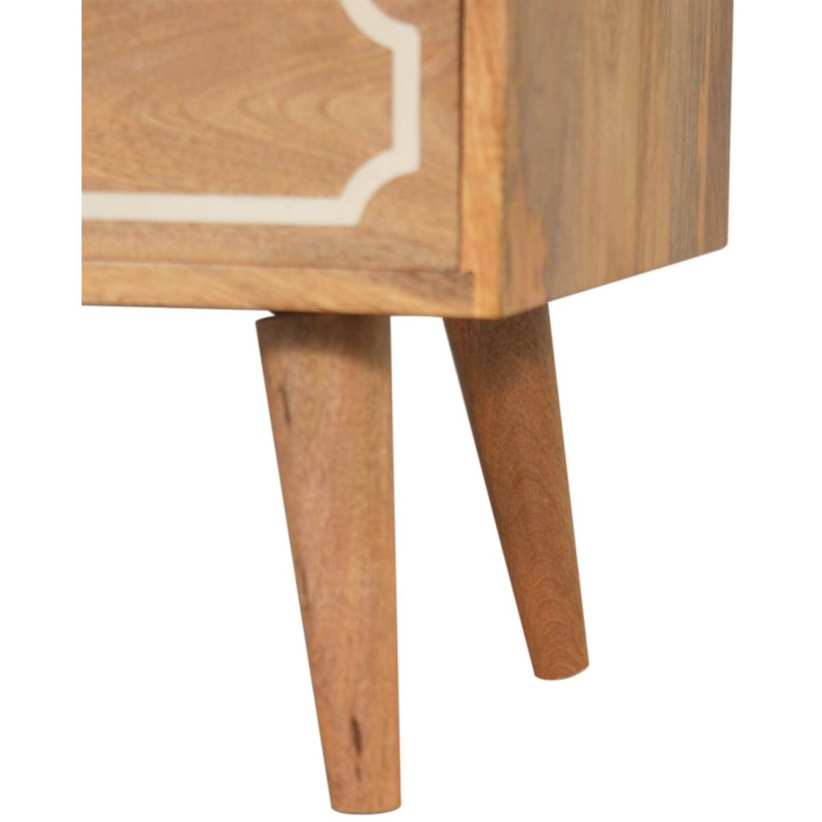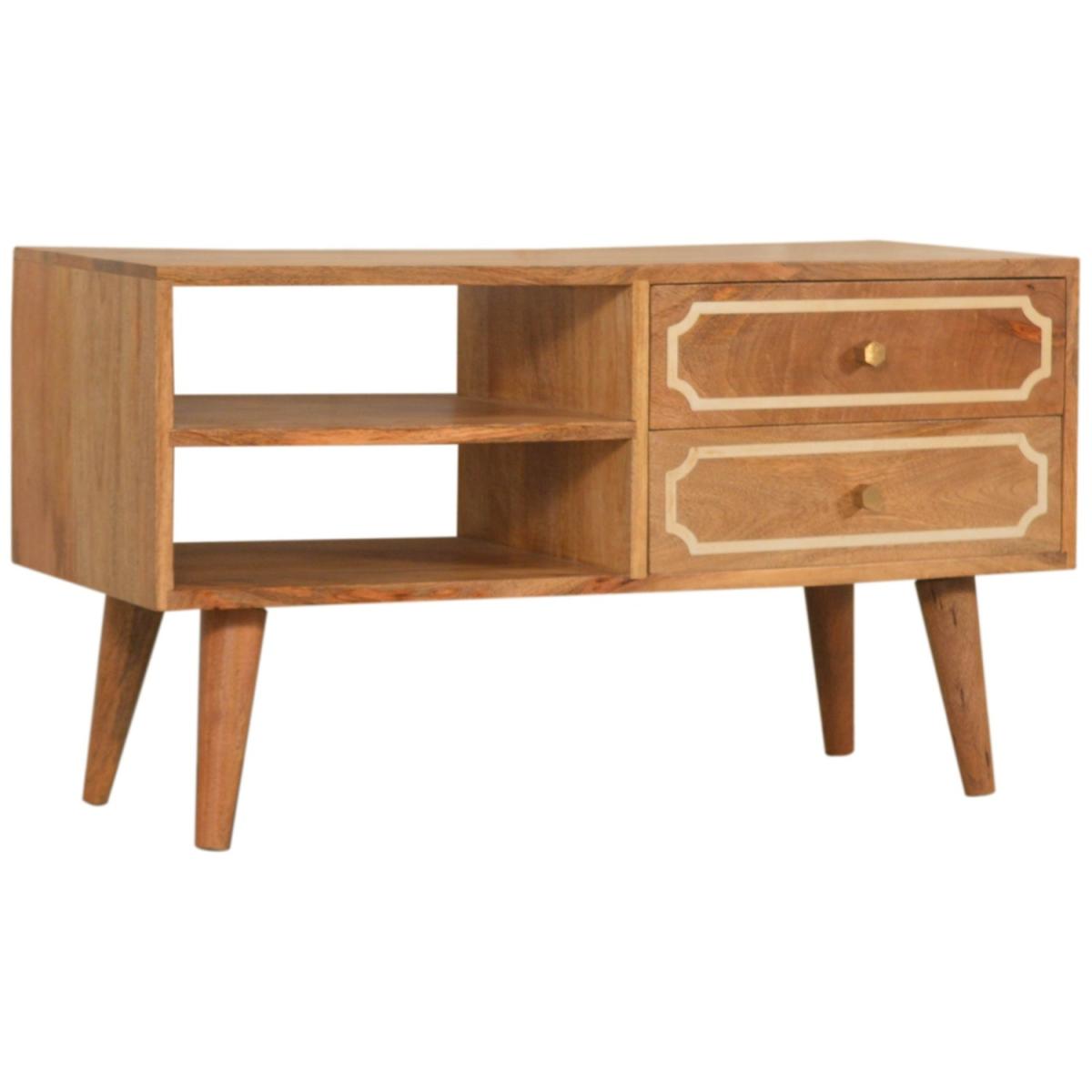 Constructed from solid wood. This media unit features 2 open slots and 2 Bone Inlay drawers suitable for use in the living room. It has a sleek compact design with Nordic-style legs and shiny knobs.
