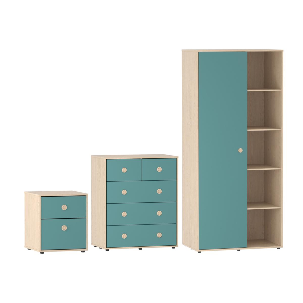 Neptune 3 Piece Bedroom Set - 2 Drawer Bedside Cabinet, 5 Drawer Chest, Wardrobe - Blue and Oak