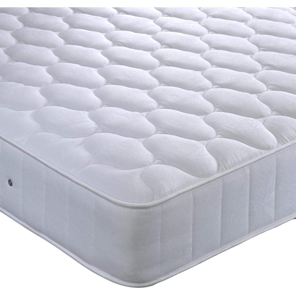 A modern coil-sprung mattress using abundant polyester and satin pads. Finished with a damask fabric, micro quilt panels and a vertical border design. Combination of style and comfort, this exclusively designed mattress offers separate springs, which are arranged in lines, interlinked with helical wire as well as a rod supporting the edge of the mattress. Delivered to a room of choice.