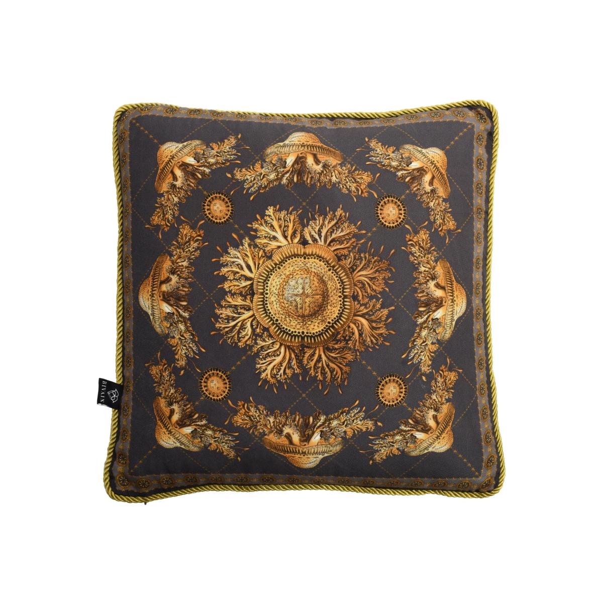 Silk twill and velvet sea urchin print grey cushion. Add Nautical chic to your home or yacht with this glamorous silk cushion featuring a sea urchin illustration, and accented with a gold rope trim to add an element of opulence in keeping with the nautical theme. The grey cushion comes with a grey or brown velvet back that pairs beautifully against most neutral shades. Composition:Silk twill front with cotton lining, velvet back, metallic trim Digitally printed front Includes feather pad Removable cover Discreet zip closure Colours may vary slightly due to batch printing Dry clean only