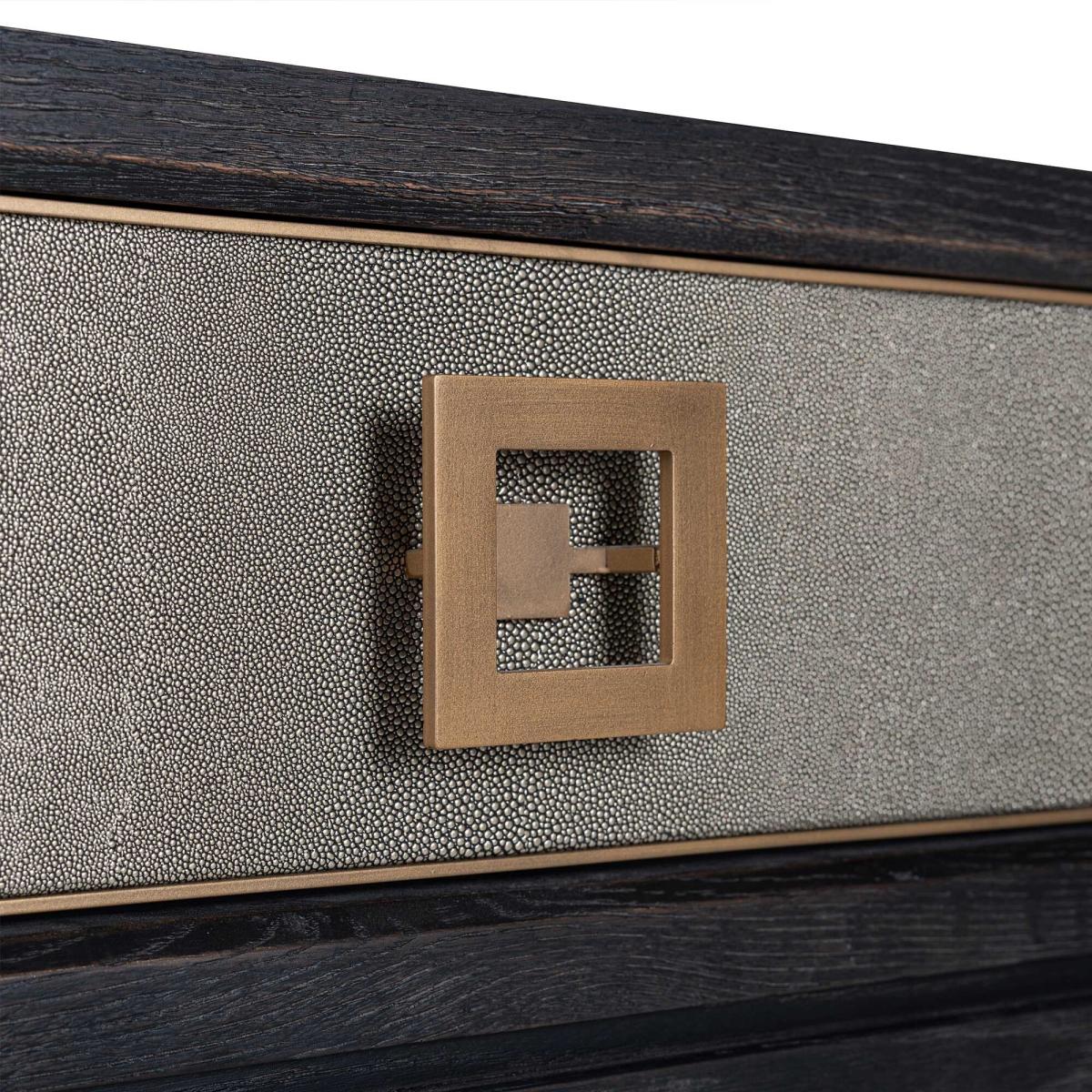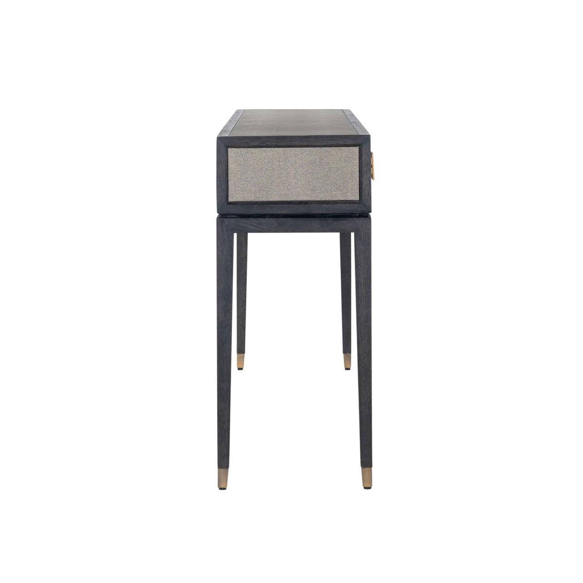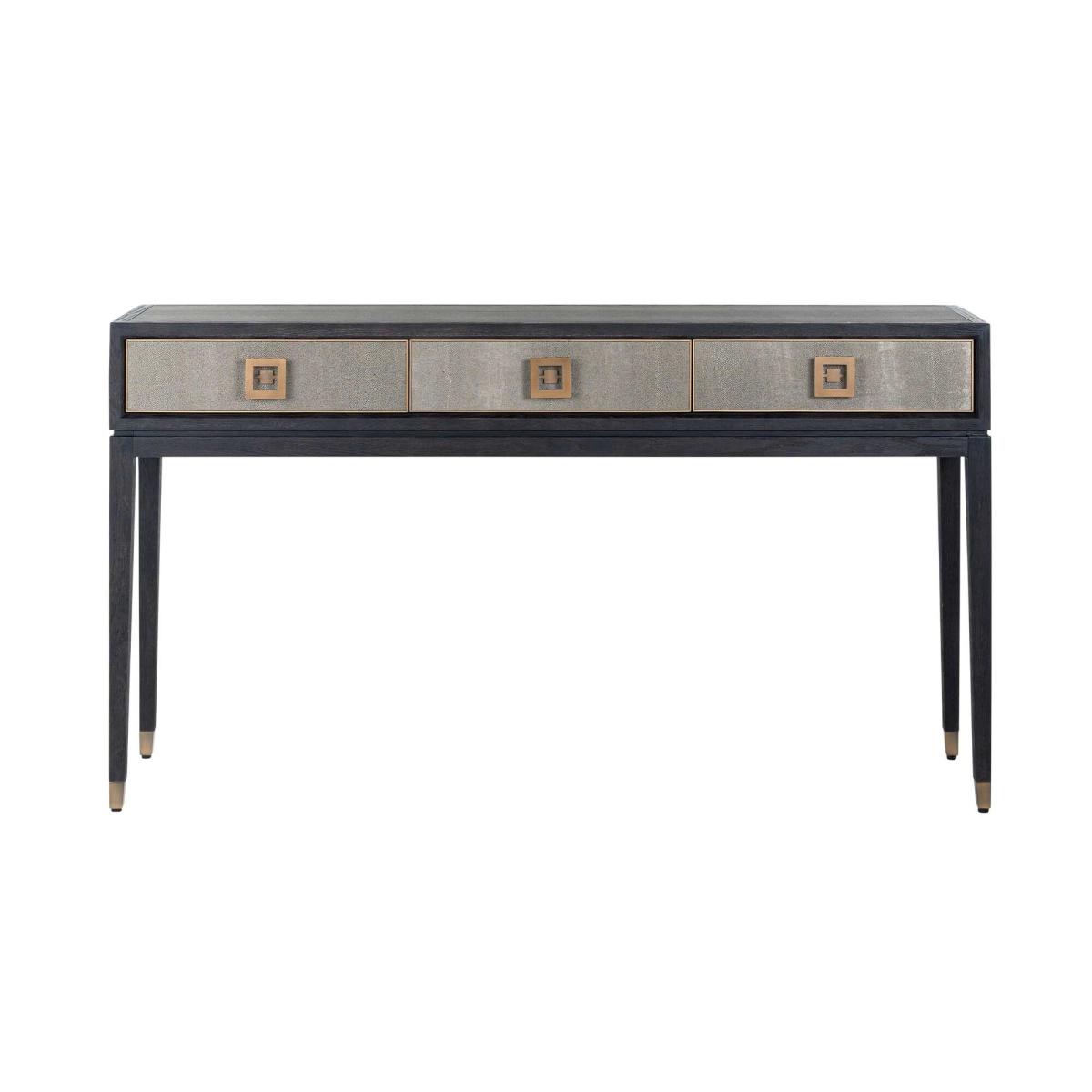 Add a touch of refined elegance to your home with this stunning 3-drawer console table. Featuring luxurious PU leather in a sophisticated ray skin print, it offers a unique texture and eye-catching appeal. The sleek design is complemented by rich black-stained framing and finished with striking matt gold metal handles for a warm, modern accent. Perfect for entryways, living rooms, or hallways, the three drawers provide stylish storage while the piece itself serves as a standout in any contemporary space.