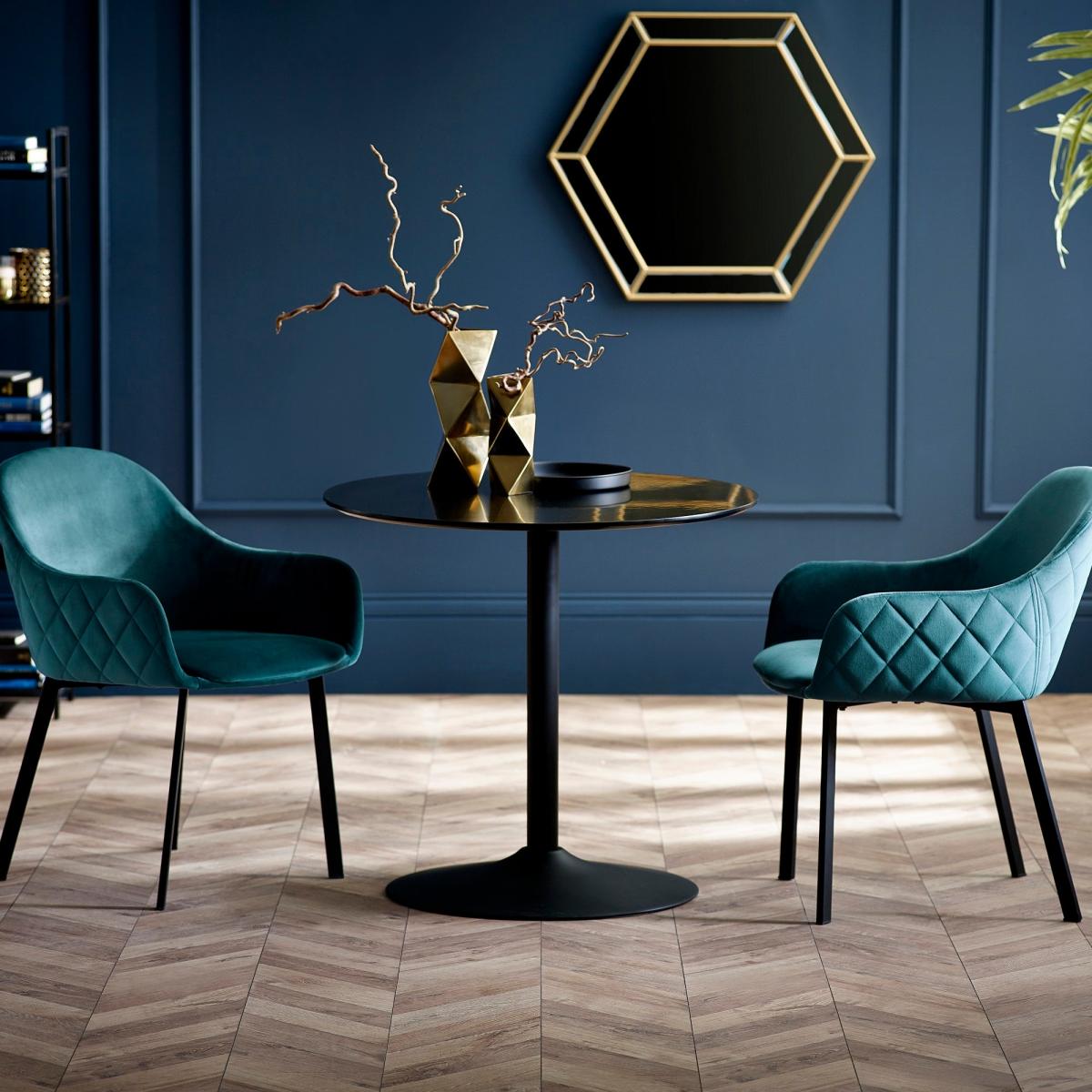 * Black pedestal design* Space saving* Metal base* Upholstered Chairs This dining set is an ideal space saver for smaller dining areas. The dining table features a black pedestal base, this simple yet elegant design fits seamlessly with various chairs within the Julian Bowen ranges. The Nero table's compact size and sleek design make it a versatile and practical choice for any dining space, offering both style and functionality. The chairs are upholstered in a sumptuous teal velvet fabric featuring a textured diamond stitching on the back, exuding opulence and comfort.