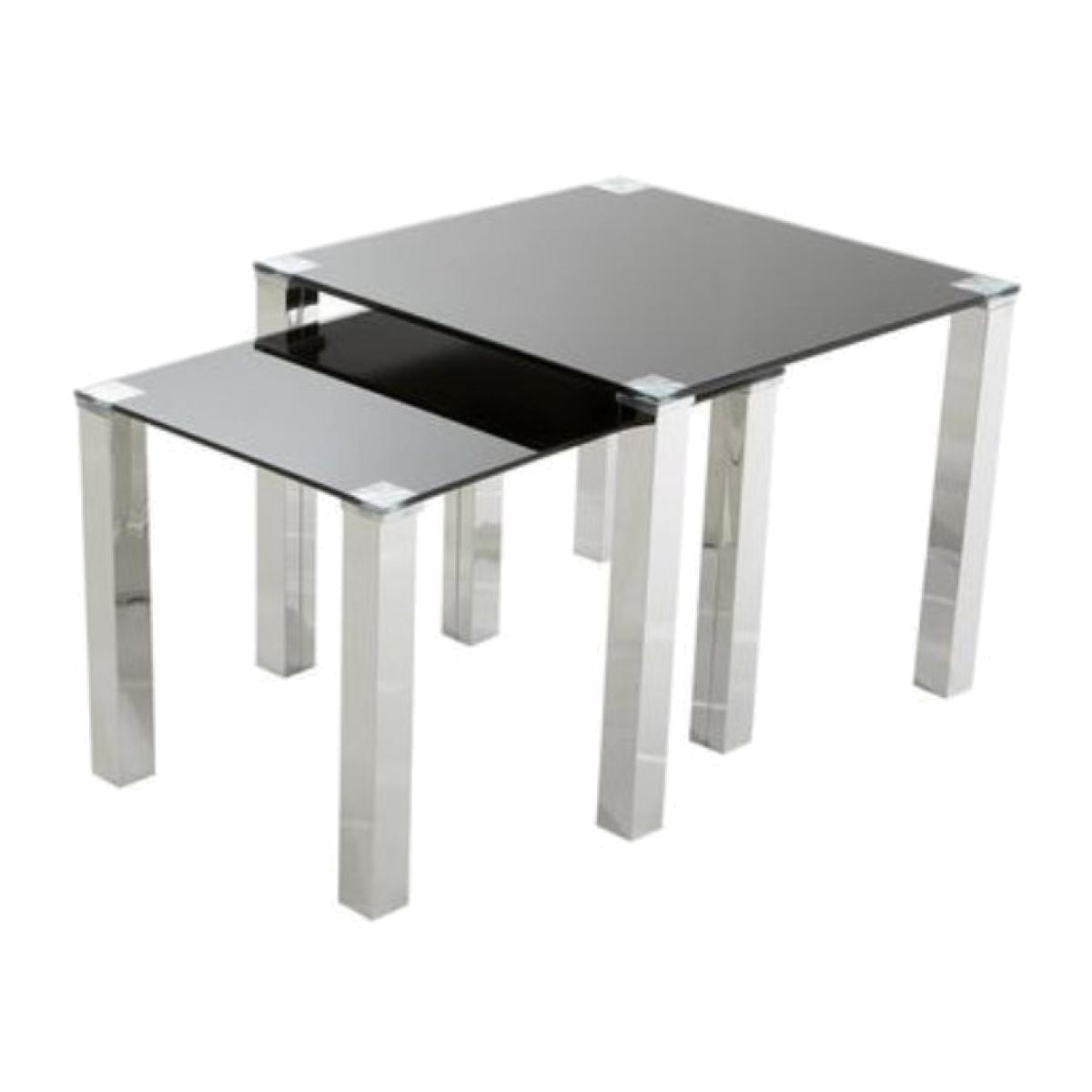 The Nero nest of tables will look great in your living room next to the sofa, for an additional surface space when needed. These nest tables are perfect for smaller spaces, since they can be stowed away. Made from black glass table top and suported by stainless steel legs. These nesting set is part of the Nero family which includes a coffee table and a side table. The Nero nest of tables will look great in your living room next to the sofa, for an additional surface space when needed. These nest tables are perfect for smaller spaces, since they can be stowed away. Made from black glass table top and suported by stainless steel legs. These nesting set is part of the Nero family which includes a coffee table and a side table.