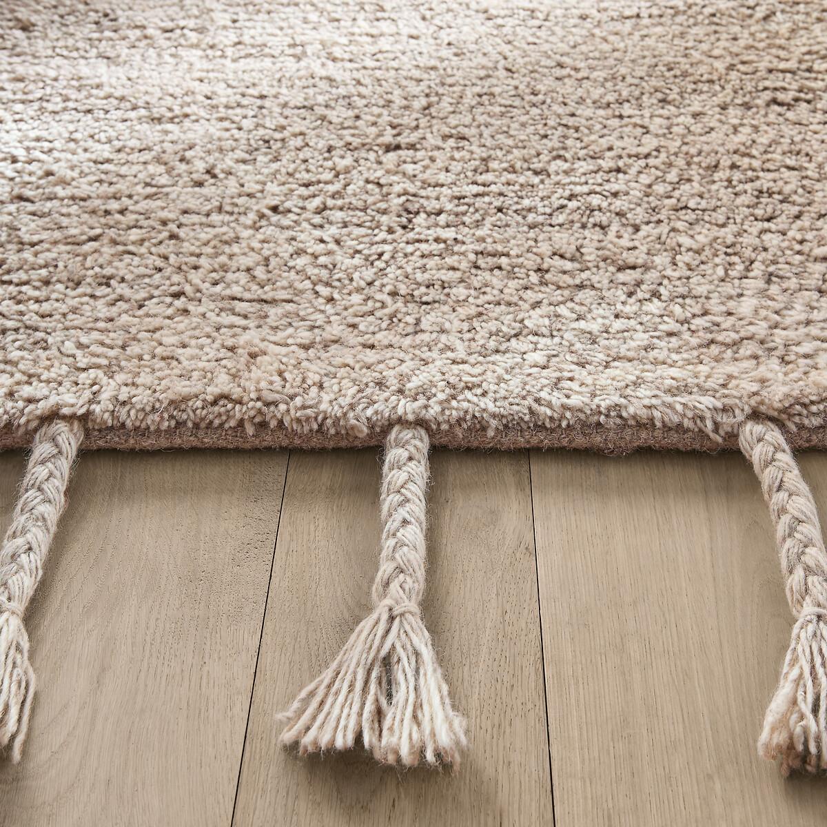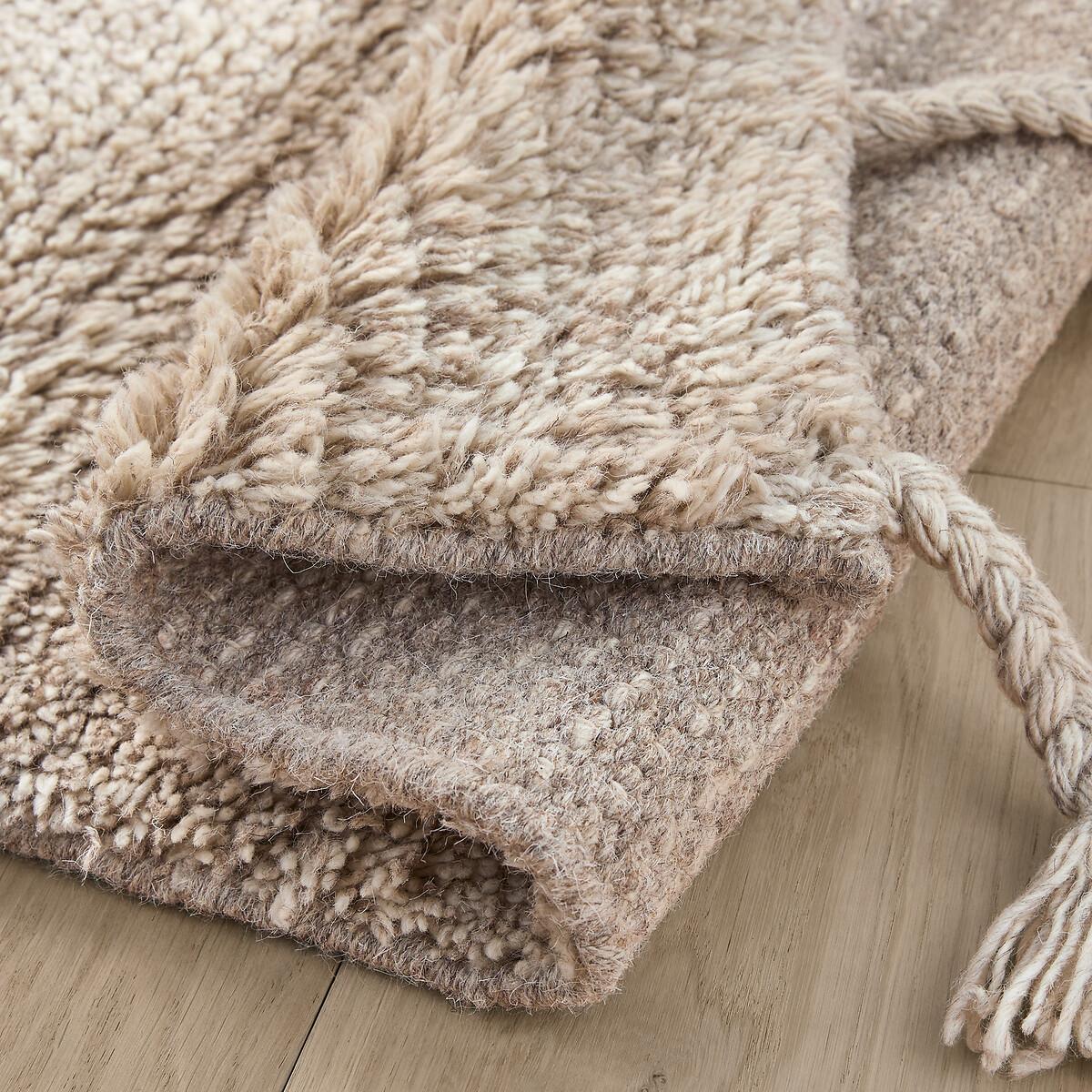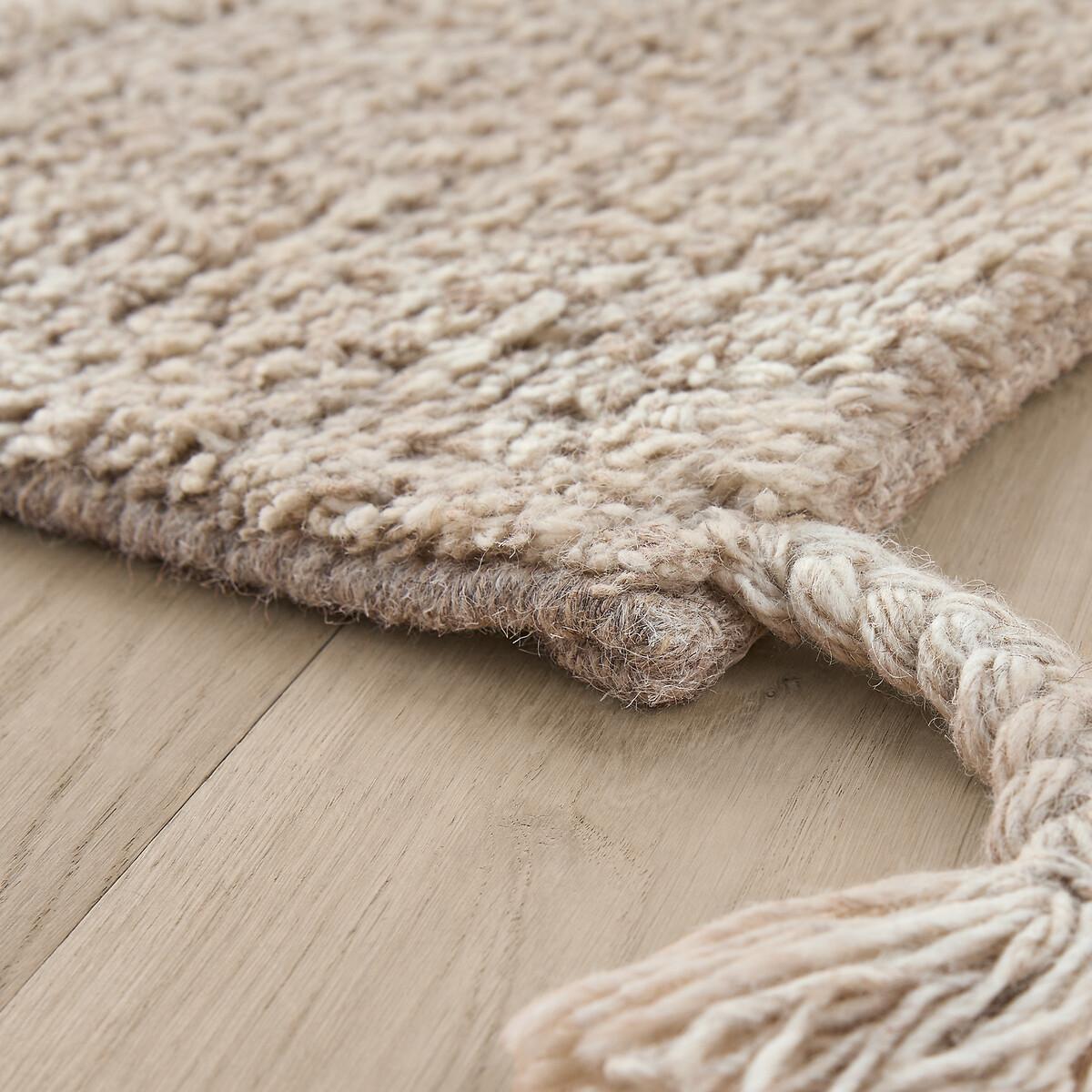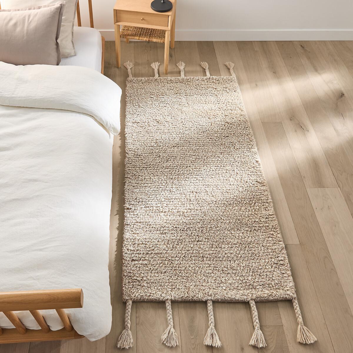 Comfort, warmth and softness of thick wool, the Berber-style Neroli bedside rug is mottled and knotted by hand. It is available in dimensions studied for corridors or narrow rooms. Product Details • 100% wool • Weight: 2500g/m² • Craftsmanship: Hand woven • Pile height: 15 to 18mm • Woven tassel finish. Quality • Wool is a warm and comfortable fibre. In addition to being hard-wearing, the wool carpet is also an excellent thermal and sound insulator.. Care Advice • Some materials such as wool are very fibrous and you can actually observe a piling during the first weeks of use: this is normal because the carpet "bursts" by rejecting its excess fibres. Remove the excess fibres by hand where possible, do not use a vacuum cleaner with a rotating brush as this can pull and tear the fibres. The pilling will improve over time. • For maintenance, we advise you to vacuum it very little the first month and then to vacuum it without rubbing too much always without using the brush. • Remove any stains immediately with a clean, damp cloth. • Dry clean recommended. Dimensions • Width 80 x Length 150cmDelivery:. Available for home delivery. • OEKO-TEX® Standard 100. Standard 100 certification by OEKO-TEX® tests textile products for harmful substances via an independent, international label. Dimensions and weight of parcel • L83 x H18 x D18cm. 4.2kg
