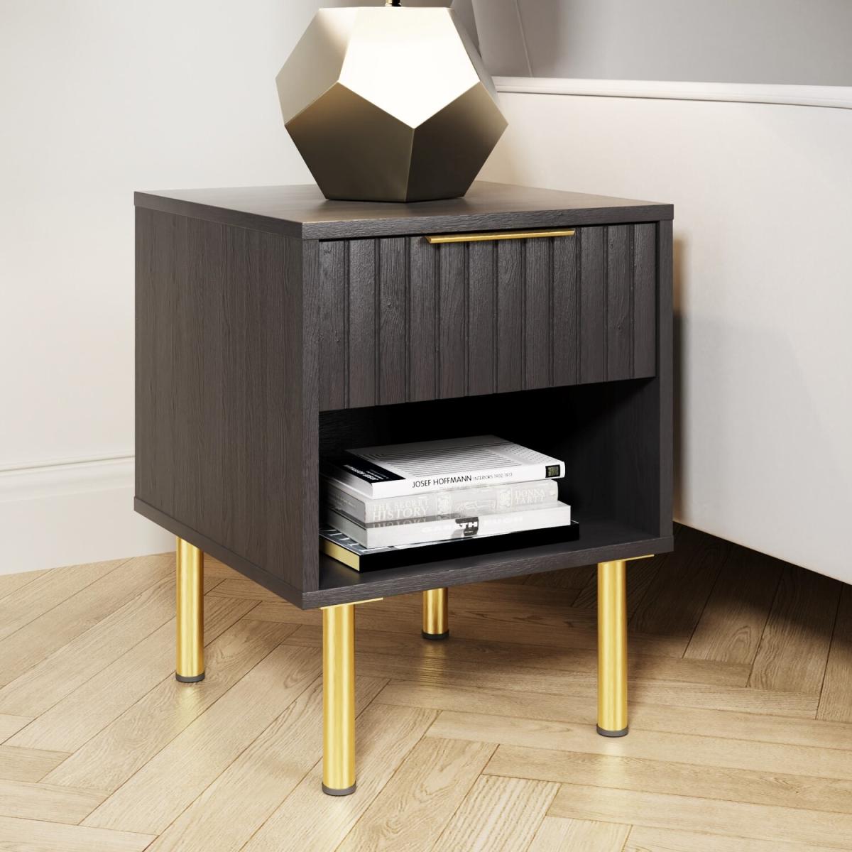 Experience the perfect blend of practicality and style with our Nervata Lamp Table. Its exquisite wooden panels, adorned with realistic wood grain texture, will elevate the ambiance of any room. The seamless integration of delicate handles adds a touch of technical brilliance, while the sleek black and gold design complements its surroundings. In the Nervata Range, every piece is thoughtfully designed to offer a unique and exceptional experience. Whether it's the coffee table, lamp table, sideboard, or TV unit, each one represents the perfect blend of elegance and functionality, allowing you to create a home that is truly a masterpiece.