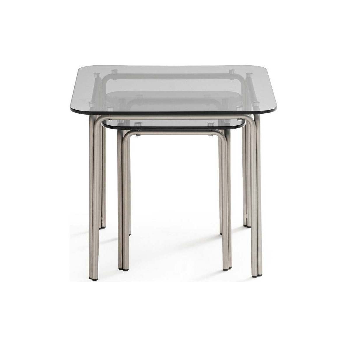 The Neso nesting tables. This set of nesting tables has a real '70s feel thanks to the tempered glass and curved steel design.Product Details
