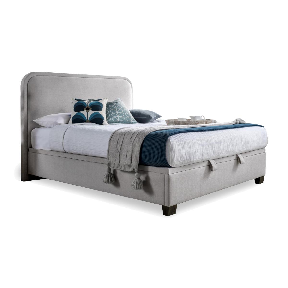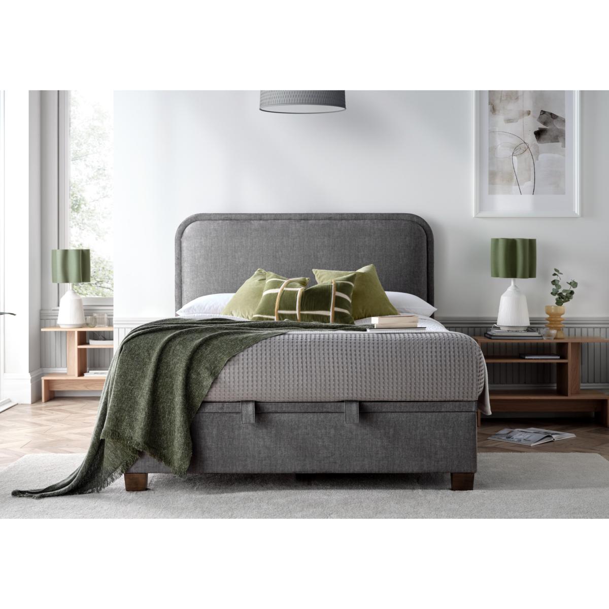 With its modern curved headboard, luxurious cushioning and beautifully tailored upholstery, this ottoman bed frame brings on-trend style to your bedroom as well as always-welcome storage. Why you'll love it The traditional ottoman storage bed gets a high-end modern look. Contemporary curved headboard is luxuriously cushioned. From the headboard’s stylish slim border to its integrated feet, every detail is perfect. Meticulously tailored with hand-finished upholstery. In a choice of colours. Dark wood foot end feet. Spacious underbed compartment for bedding, pillows and clothing. Hydraulic lift system makes the ottoman storage space so easy to open and close. Platform top base aids ventilation for cooler sleep. Safety bar prevents accidental closure. Made with sustainably sourced wood. In double, king and super king bed sizes. This ottoman bed frame is part of the Furniture Village bed frame collection. What you need to know Mattress sold separately. Maximum mattress weight is 50 kg for double, 65 kg for king and 70 kg for super king. Please keep hands clear of the mechanism when opening and closing the ottoman. Do not sit on this ottoman bed frame when opening. Clean regularly using a soft brush or vacuum with the curtain attachment. Deal with any spills promptly. Professional cleaning advised for oil- and grease-based stains. Some fabrics can show wear on areas of more use or in direct sunlight. Flattening and shading of heavy wear areas on pile fabrics like velvet is unavoidable. Be sure to brush pile fabrics only in the direction of the pile. Please read our upholstery care guide for more advice. Item code: NESSEO50MCY-001
