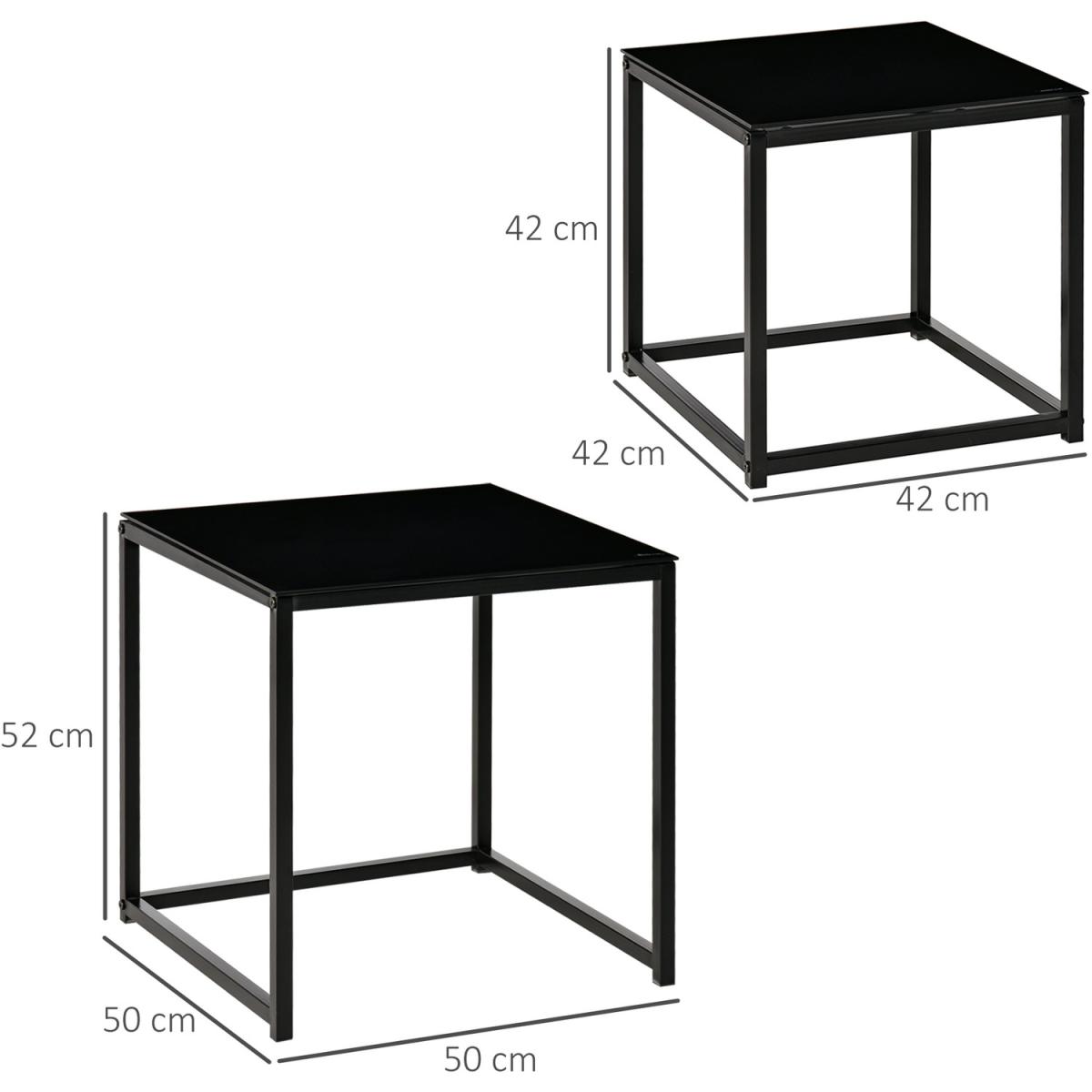 Black in colour, square in shape, they're an easy way to display your favourite pieces in the home of office - letting them stand out and shine. The frame, made from steel for a strong core, is fitted with a tempered glass table top, safely tough so it doesn't break, also gives both tables a sleek and polished look. Set consists of a smaller and larger tables, so when not in use, can be snuggly fitted together, keeping your house tidy.