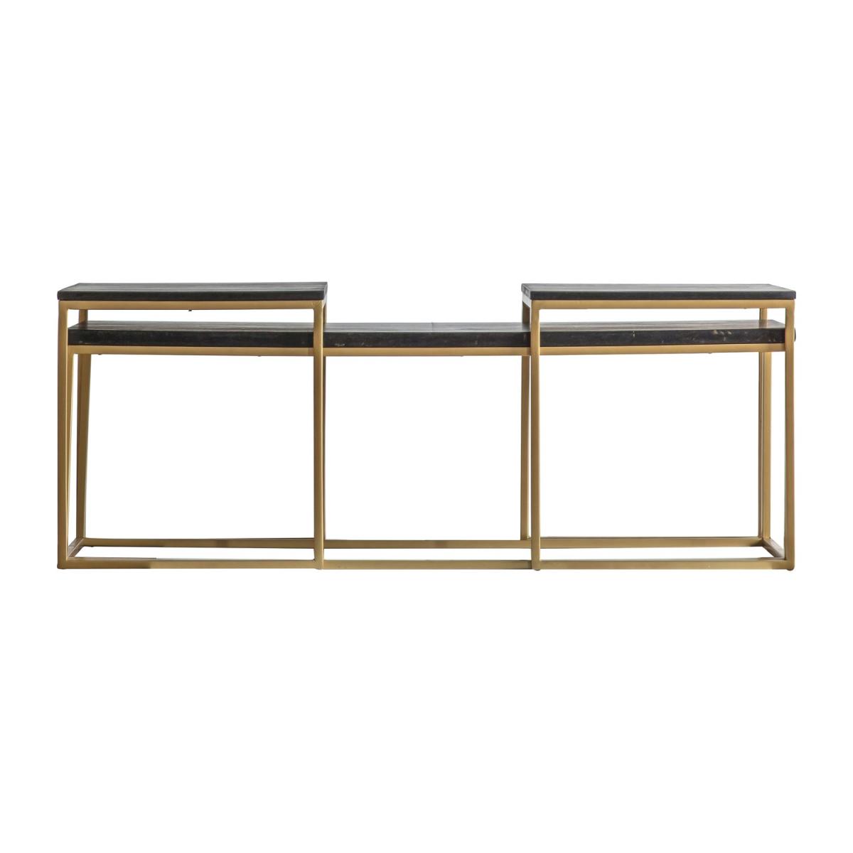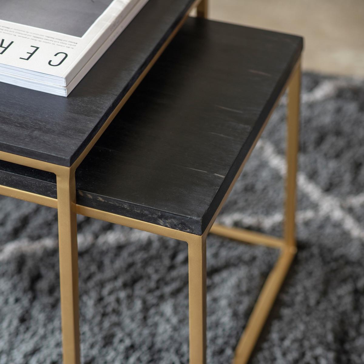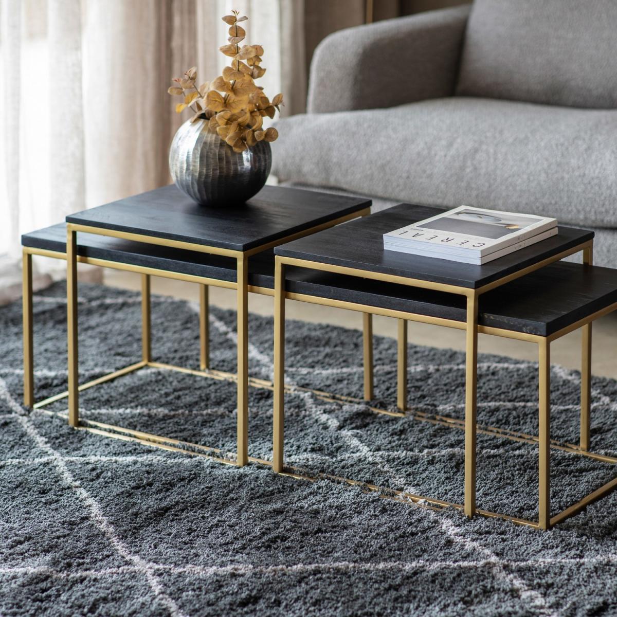Dimensions W120x H38x D38 cm. This Bertie coffee table is the perfect combination of style and function. Featuring a contrasting dark wood top and gold frame which create a distinct and glamourous statement for your living room. The contemporary minimalist and geometric design is truly eye catching. The nest of tables can be separated to offer you ample surface space or they can simply be nested together to create a bold centre piece for your living room. Features. A stylish and bold centre piece for your living room. Contrasting dark wood top and glamorous gold frame Contemporary minimalist and geometric design. Tables perfectly nest together Total of three tables. Assembly required..
