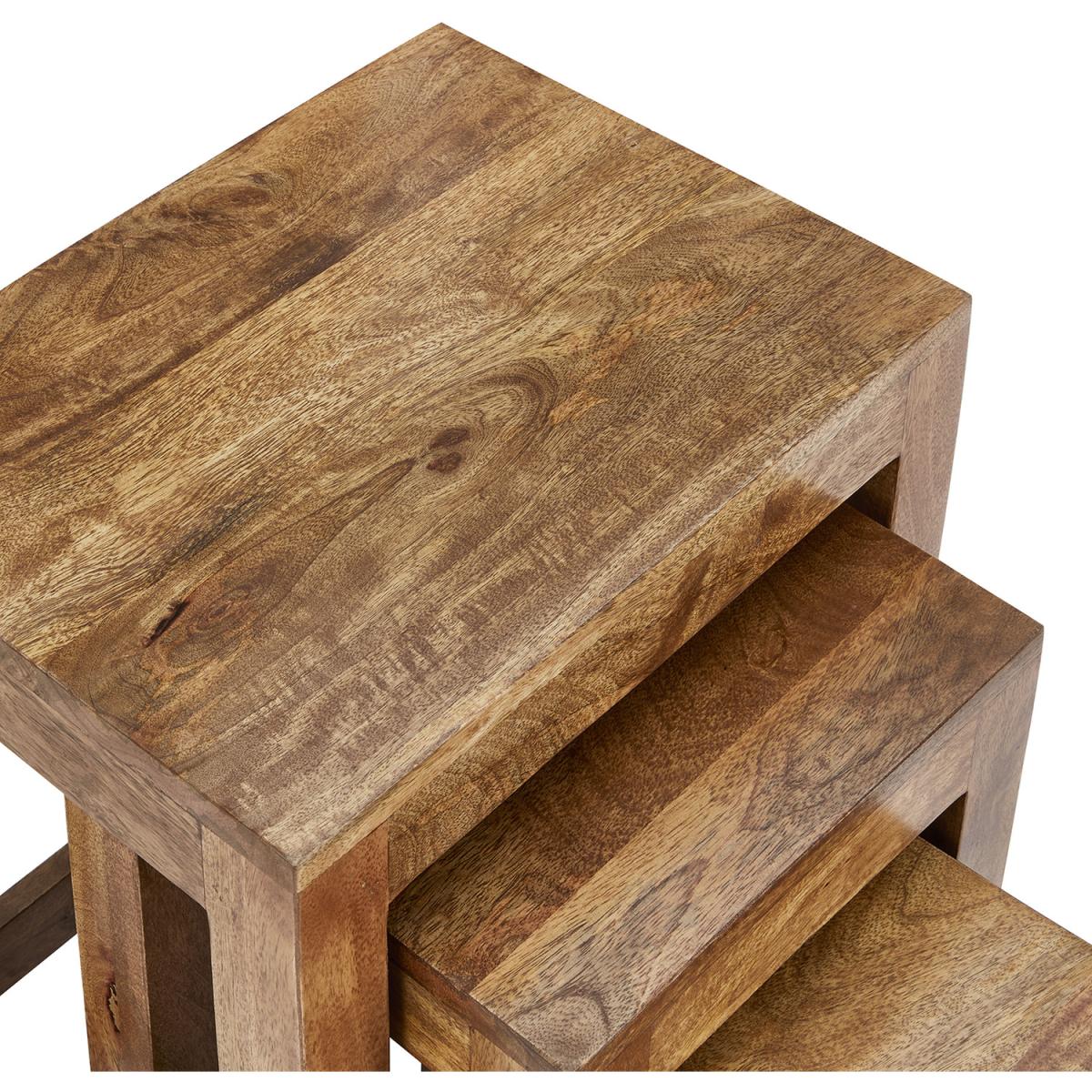 A beautiful nest of three tables which will be a great addition to any living room, offering extra space for that all important glass of wine or cup of coffee. The nest of tables is made from solid Mango wood and finished with a light Oak stain and wax. The framework is also made from solid Mango wood. This nest of three tables will be delivered fully assembled, simply unbox and they are ready to use.