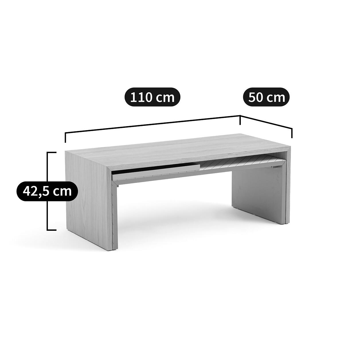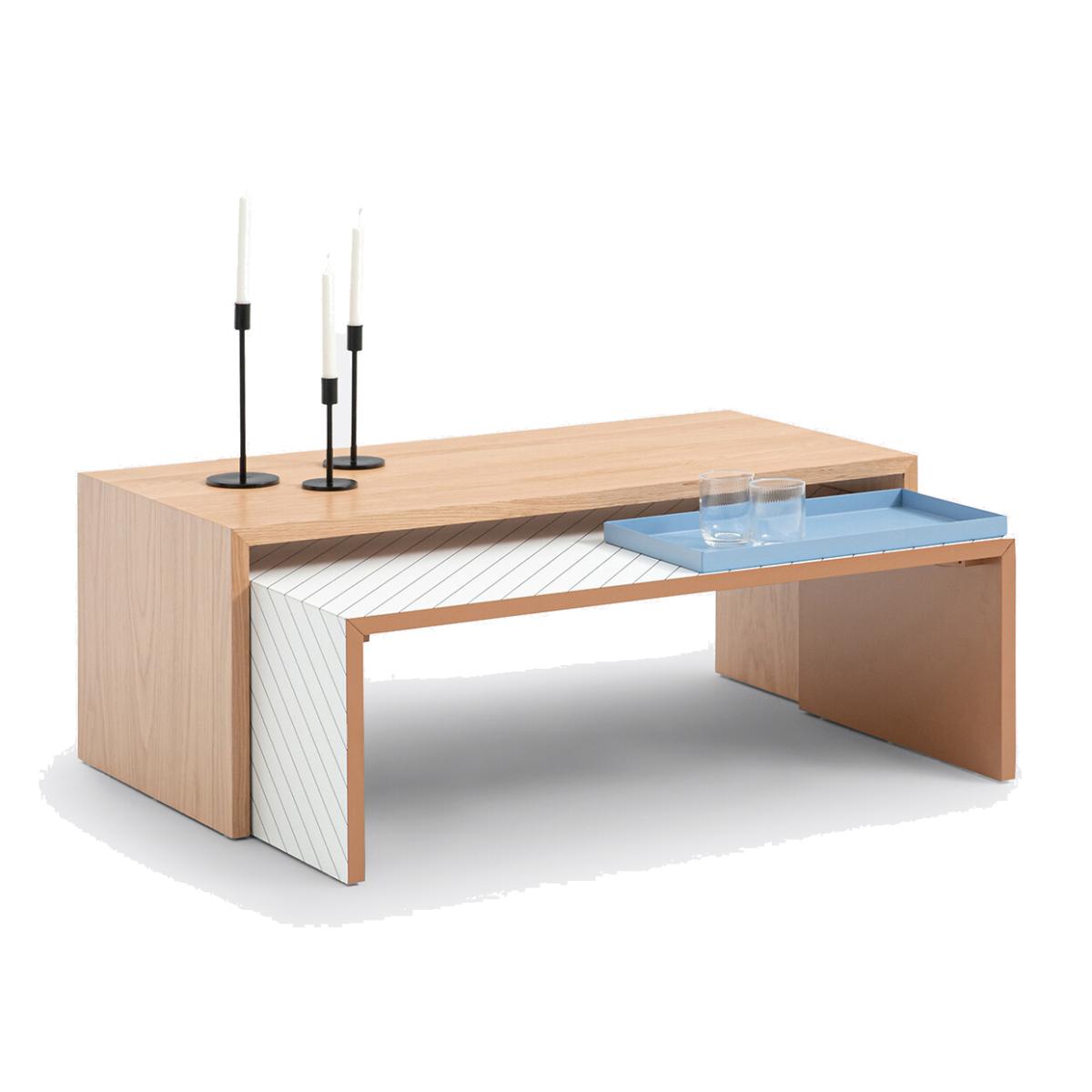 The Nesting coffee table duo. Practical, this rectangular table has two modular surfaces with a removable top. Use it to reinvent your space. A signature La Redoute Interiors design. Product Details • Oak veneer MDF structure, nitrocellulose varnish finish • Second tinted MDF structure with striated appearance, nitrocellulose varnish finishes • FSC® certified wood • 1 removable rectangular blue metal tray. Care Advice • To protect your table, consider trivets, coasters and placemats. Dimensions • Width: 110cm • Height: 42.5cm • Depth: 50cmDelivery:. Sold pre-assembled. Available for home delivery. Note! Please ensure all passageways and doorways are wide enough. • WOOD FROM SUSTAINABLY MANAGED FORESTS. FSC® certified wood comes from forests that are environmentally, socially and economically well managed. Dimensions and weight of parcel1 parcel • L118 x H50 x D58cm, 43kg