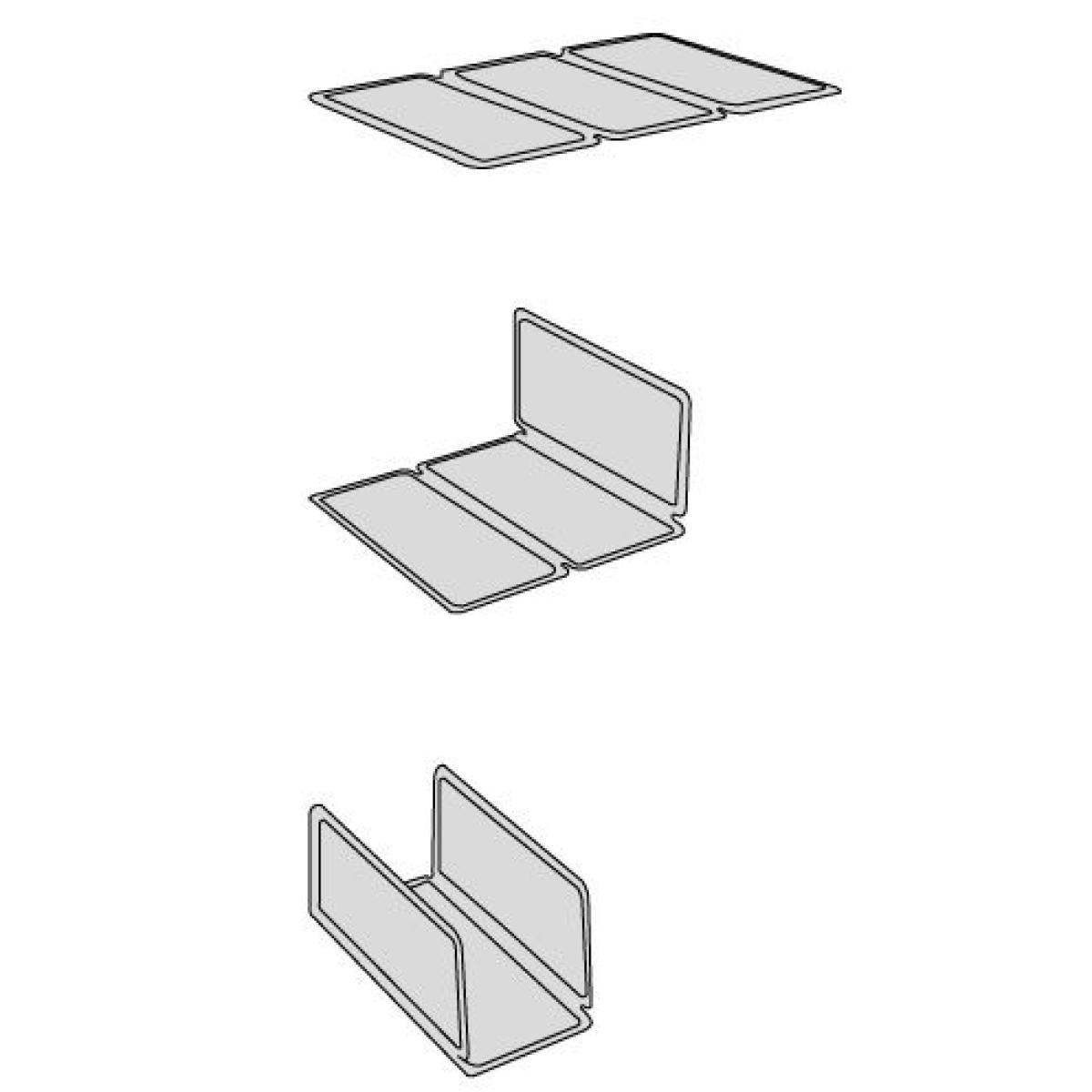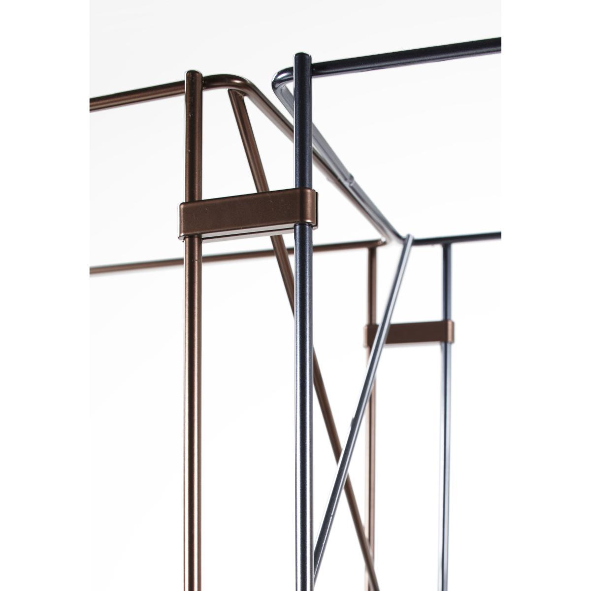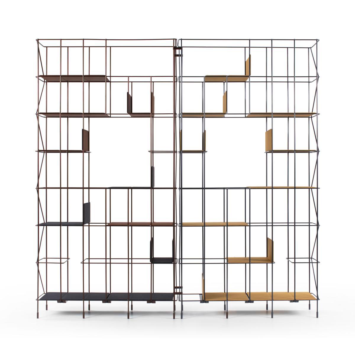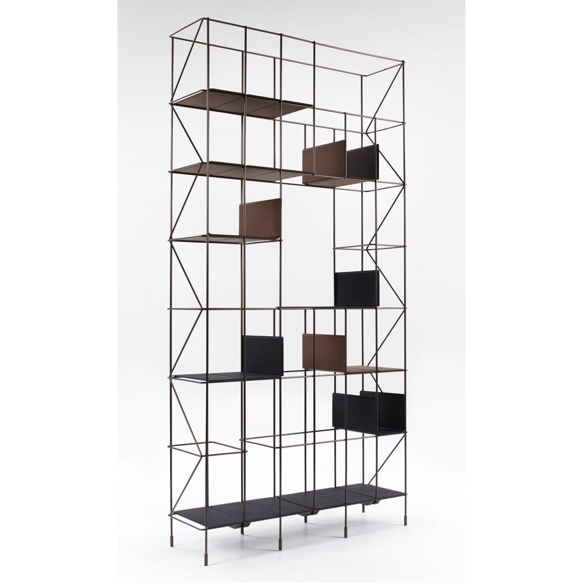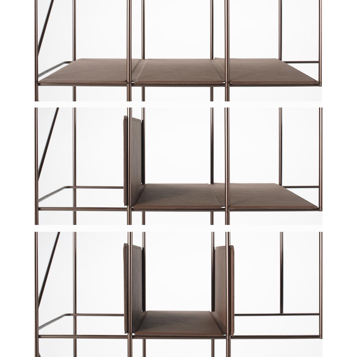 This airy modular bookcase features a fine metal structure on which you can freely put pliable leatherette shelves. Plenty of compartments in various sizes form an asymmetric assembly, a beautiful succession of rhythmic spaces. The shelves seem to be fluttering inside this metal “cage”. These shelves are very thin leatherette panels. Each panel/shelf consists of 3 pliable parts. The shelves can be folded and unfolded in no time at all to adopt three different positions: flat, one lifted edge, two lifted edges. Since they are not fixed on the structure, you can modify their form in the twinkling of an eye! We love this idea of transformable furniture one can reinvent according to one’s needs and desires. This bookcase includes: a bronze-coloured metal structure (L 98 x H 192 cm) and 5 pliable, removable bronze-coloured leatherette shelves. There is a possibility to buy more shelves separately (shelves sold in sets of 5 available in anthracite, brown, beige).