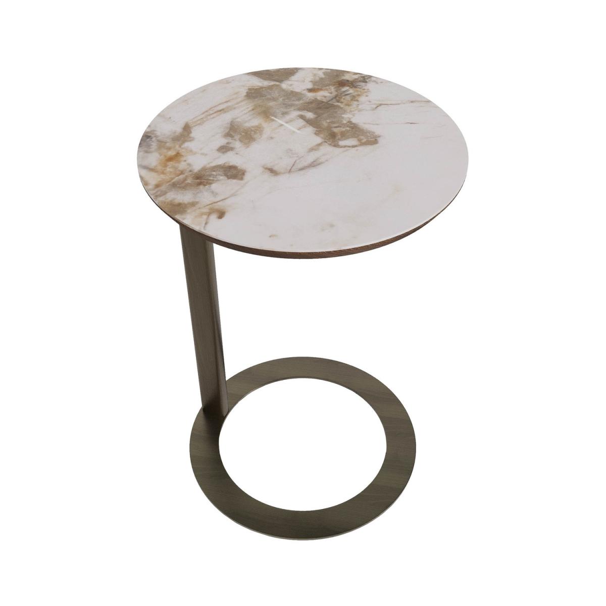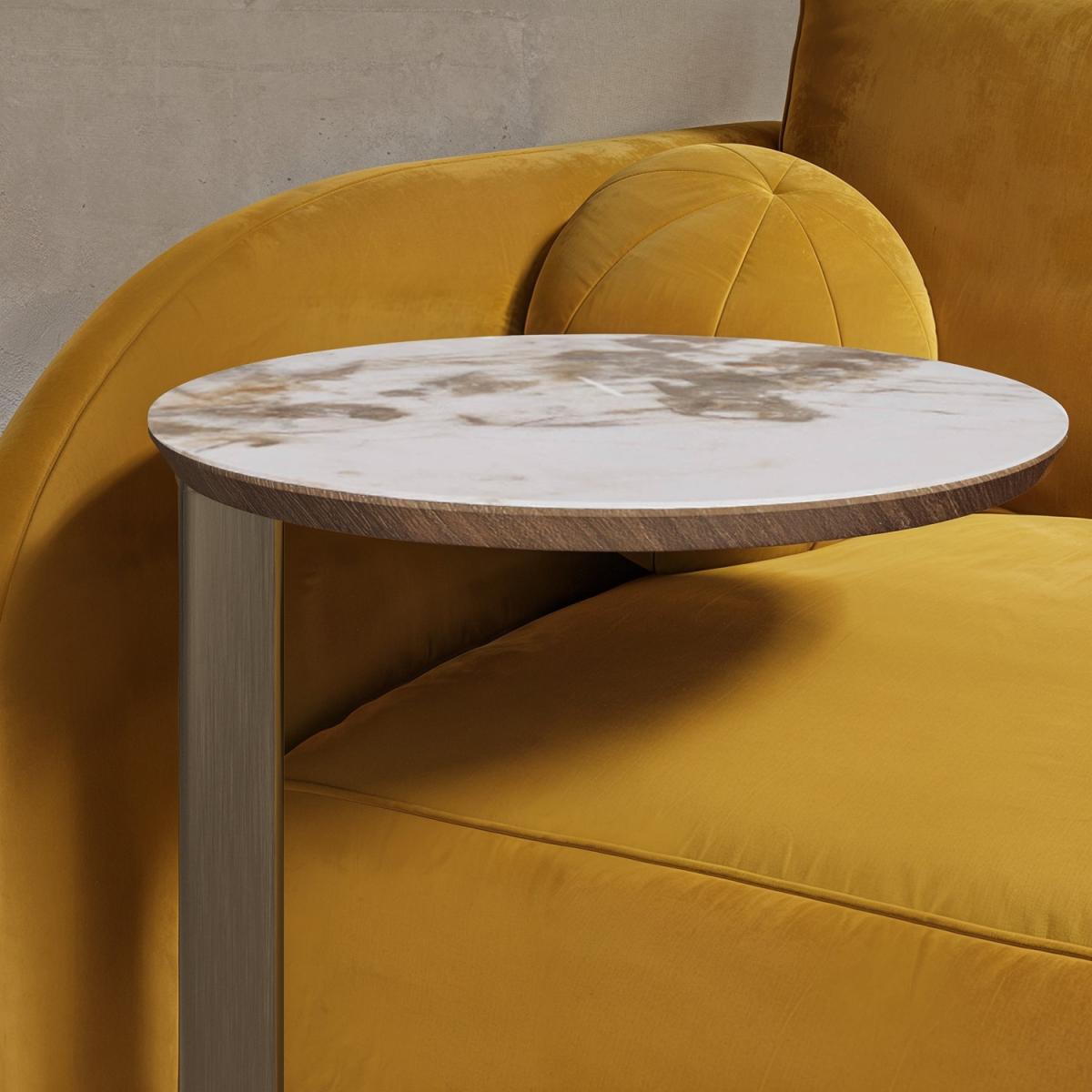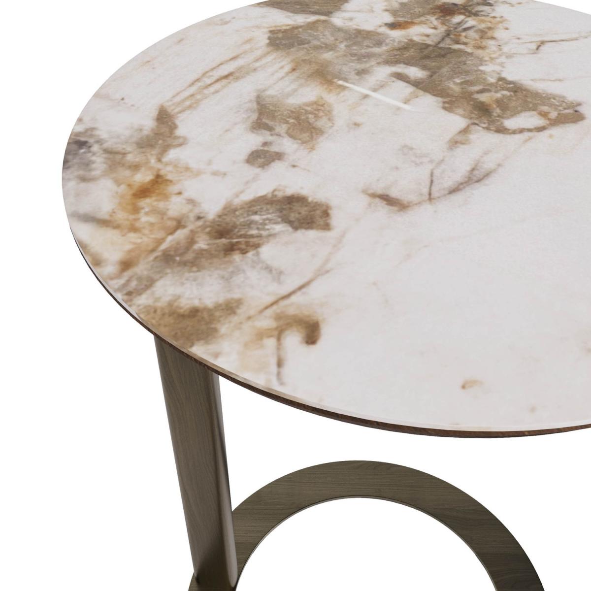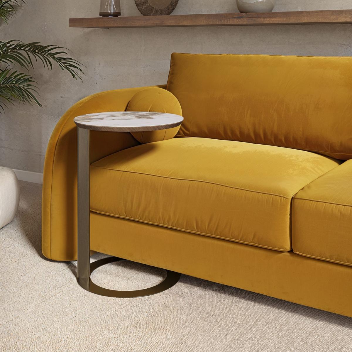 This modern Malia sofa table features a stylish brushed bronze metal base and a warm neutral ceramic top with a smooth finish, combining mid-century elegance with contemporary durability. The heat and scratch-proof ceramic top ensures a unique design, while the sturdy metal stand offers versatile functionality for any space. Due to the natural characteristics of the ceramic, marble effect, each table top is unique and may vary to images shown on site Dimensions: W40 x D40 x H58 cm Product Weight: 6kg Finish:Marble Top Material: Ceramic top Base Material: Brushed bronze metal and walnut veneer Colour: Beige Assembly required: Yes