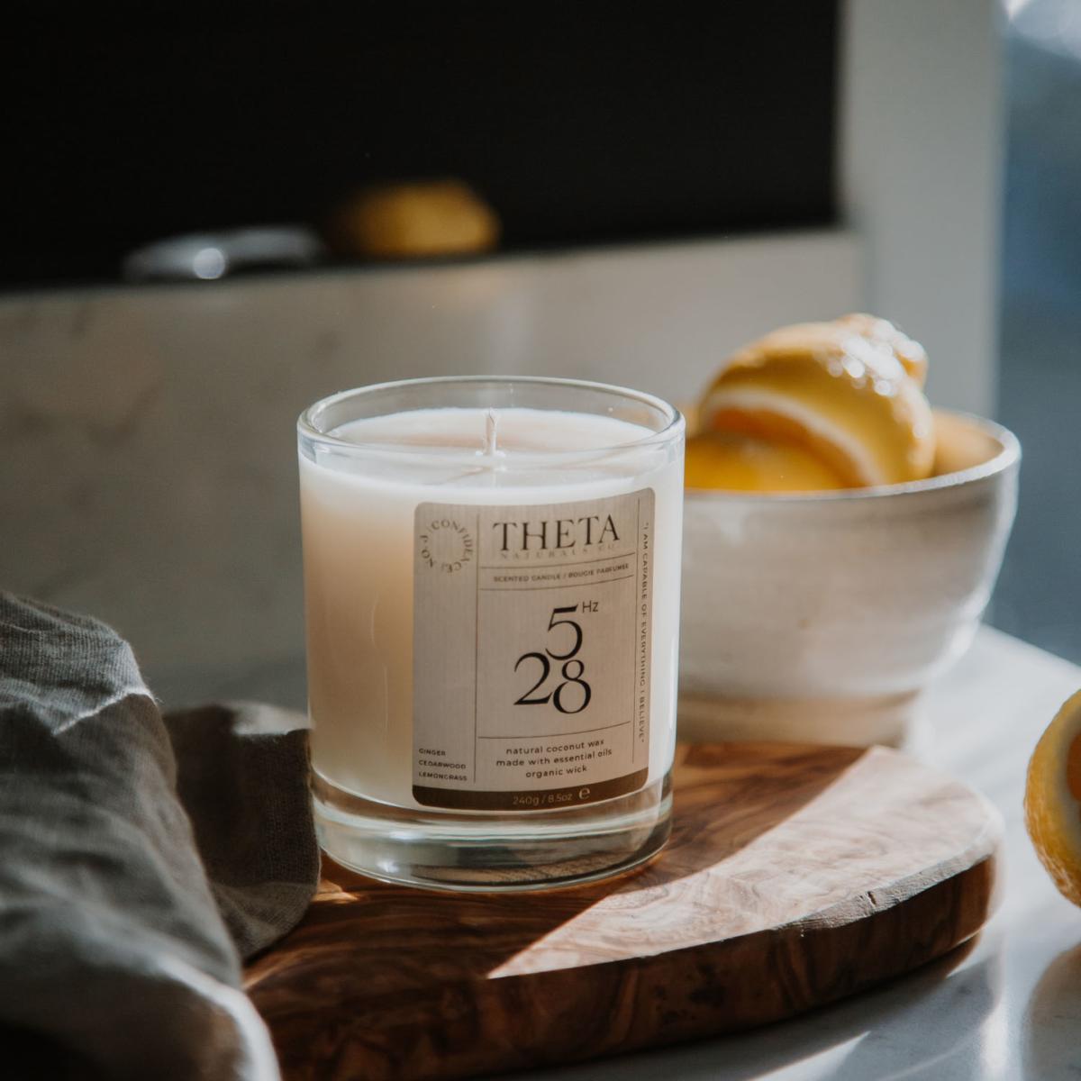Made with sustainably sourced essential oils and non-toxic materials Made with sustainably sourced essential oils and non-toxic materials Discover the transformative power of the 528Hz Confidence Candle, designed to balance your solar plexus chakra and restore harmony in your life. Indulge in the invigorating aromas of: Lemongrass | Cedarwood | Ginger Root Lemongrass: Fresh, citrusy, with herbal notes. Cedarwood: Earthy, woody, and warm. Ginger Root: Spicy, warm, with a touch of sweetness. This vibrant combination energizes your senses, evoking a refreshing and grounding ambience that instils a sense of resilience, and unwavering confidence.