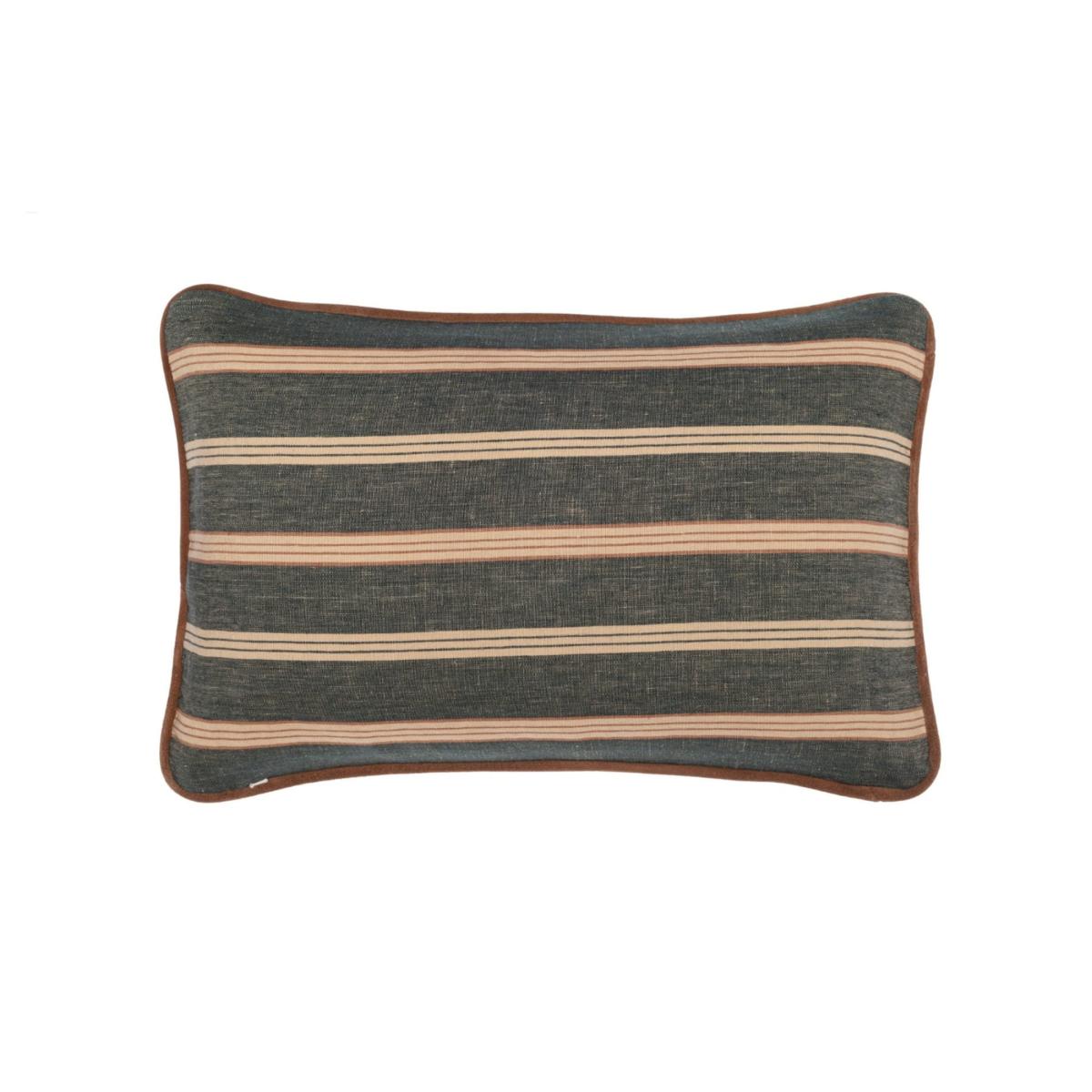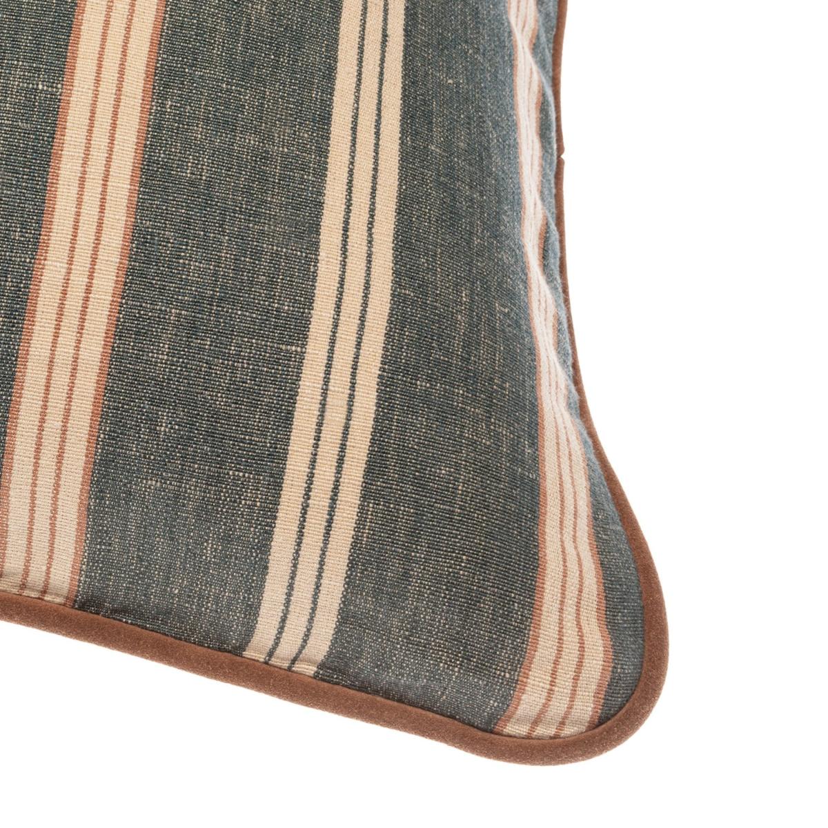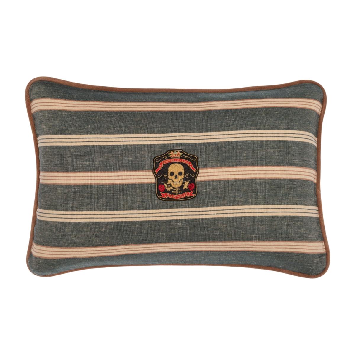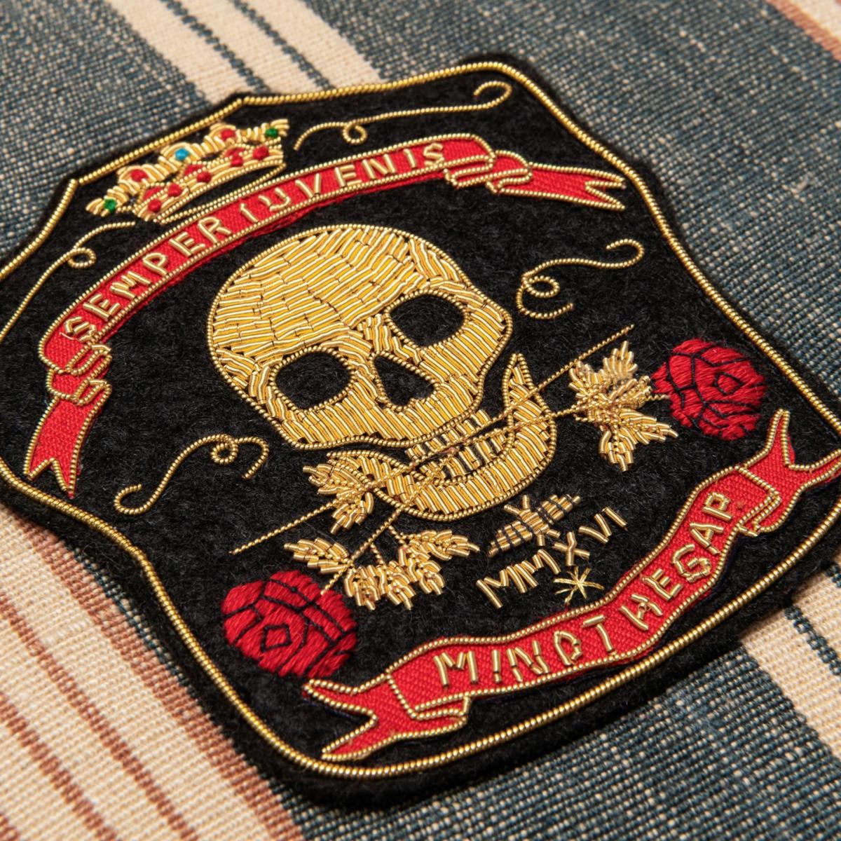 Referencing Vortex I, the rock festival held in Oregon in 1970, the OREGON STRIPES woven linen cushions show a colour palette which embodies the stonewashed denim fashion of the era. The Denim Washed and Orange Washed striped linen cushions are complemented with a brown leather piping, that enhance the premium look of the product. The front cover is decorated with a beautiful hand-embroidered metallic bullion displaying a skull and two roses representing the main symbol of the Woodstock Collection, Semper Iuvenis.