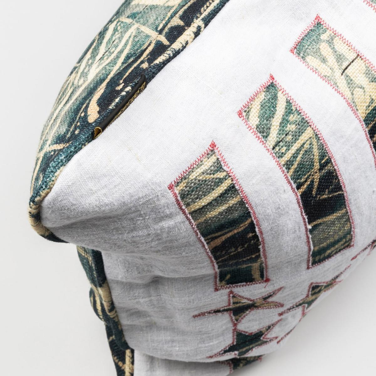 A beautiful statement cushion with one side made of patched stitched Stars and Stripes on white linen and on the back with Bamileke heavy linen. MINDTHEGAP's distinctive cushions show beautiful patterns and details of our fabrics. Made on heavy linen or cotton pile velvet, all cushions are printed in Romania by using traditional methods. To achieve a unique vintage effect and to get more softness, our linen cushions are stonewashed finished. The fillings are made of duck feathers in order to keep the natural look of the cushion and a good shape for long time.