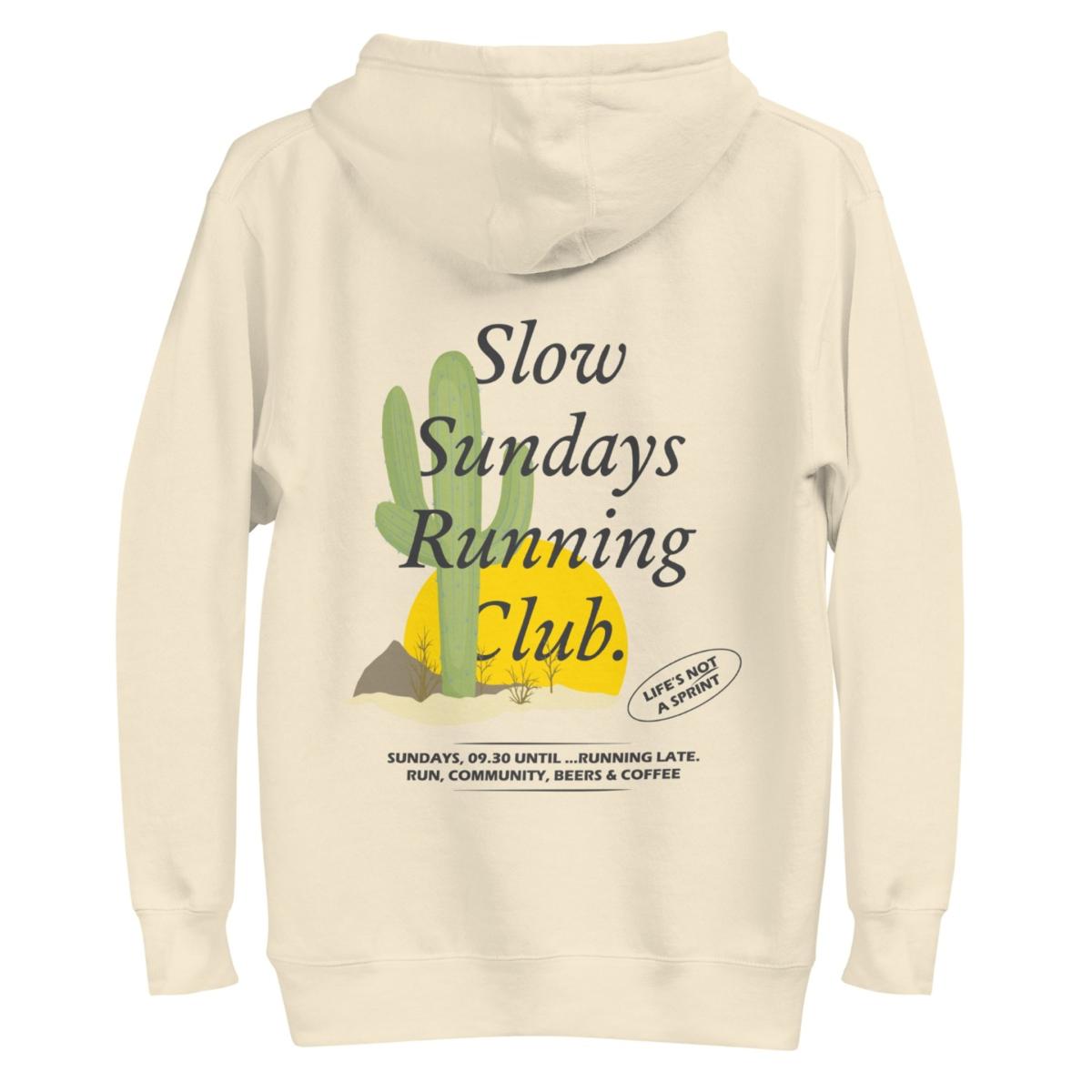The Cactus Slow Sundays Running Club Cotton Blend Hoodie was designed in-house and is manufactured-to-order on demand in our best effort to overcome the two biggest contributors to waste in fashion: overproduction and guesswork. High-quality, super-soft and eco-consciously made