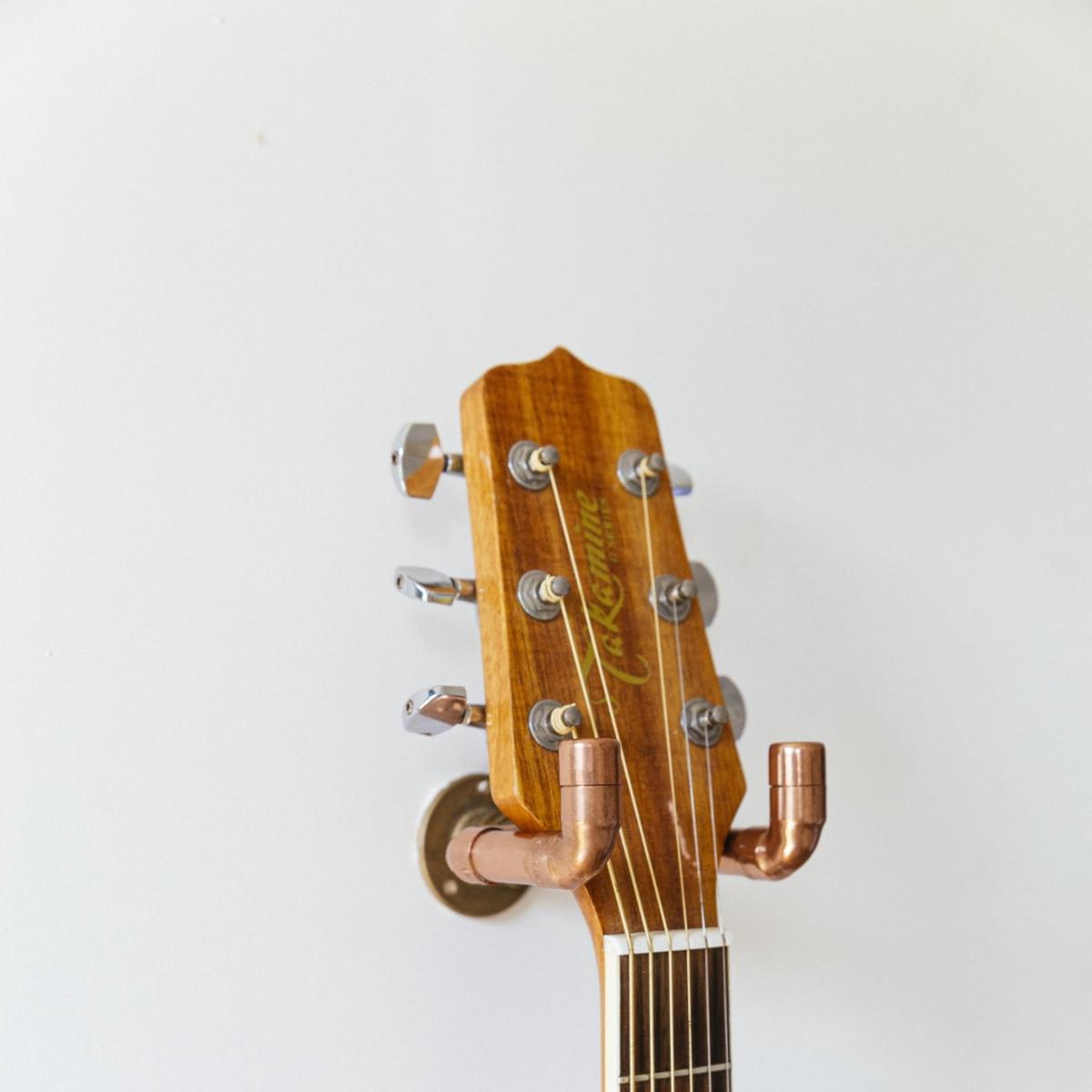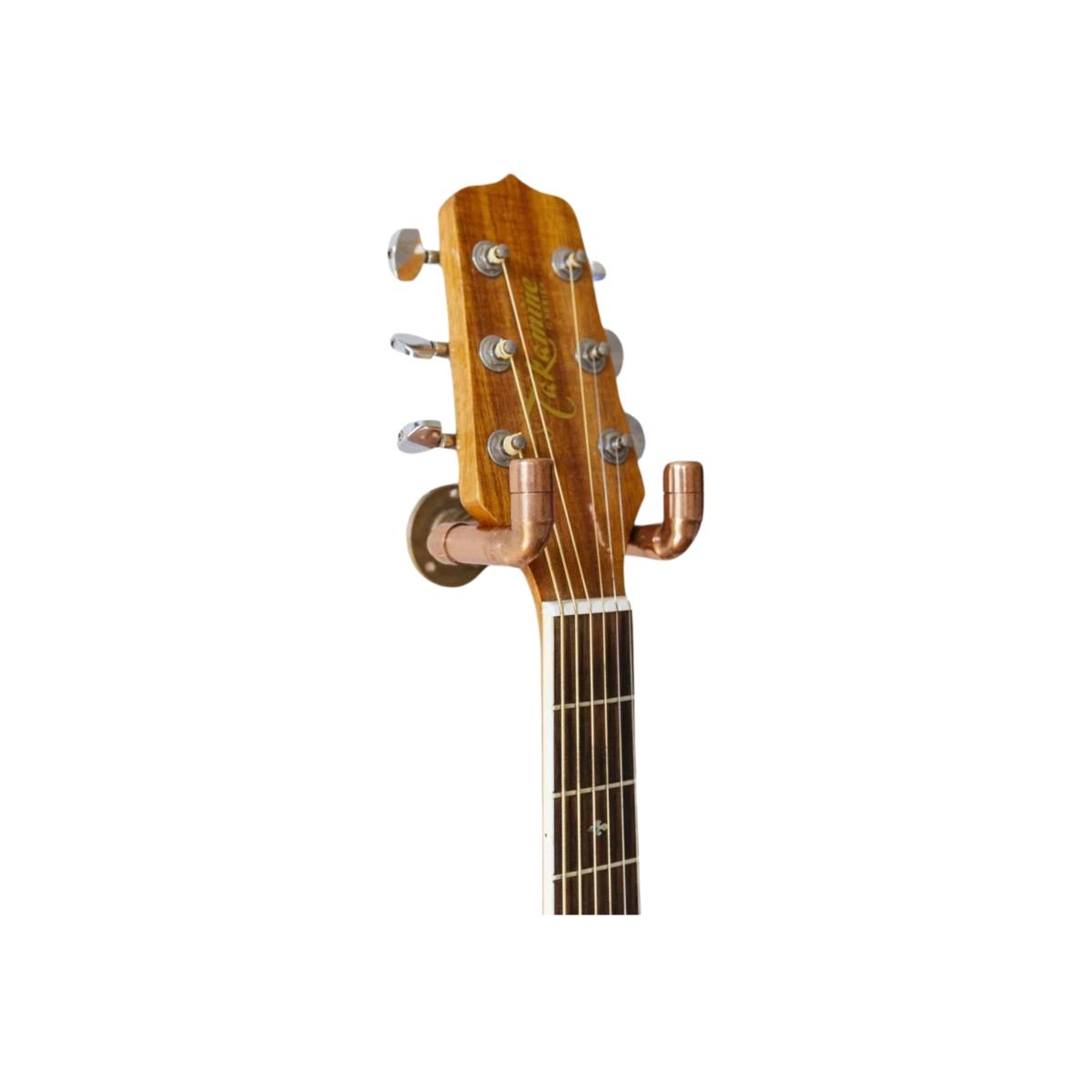 Display your guitar with rustic charm using our Copper Guitar Holder. Handcrafted from solid copper, this wall hanger not only securely holds your instrument but also adds an artisanal touch to your space. The unique design features a handmade copper guitar pick incorporated into the holder, showcasing the fusion of craftsmanship and functionality. Perfect for musicians who appreciate both style and practicality, this rustic accessory enhances the ambiance of any music room or studio.