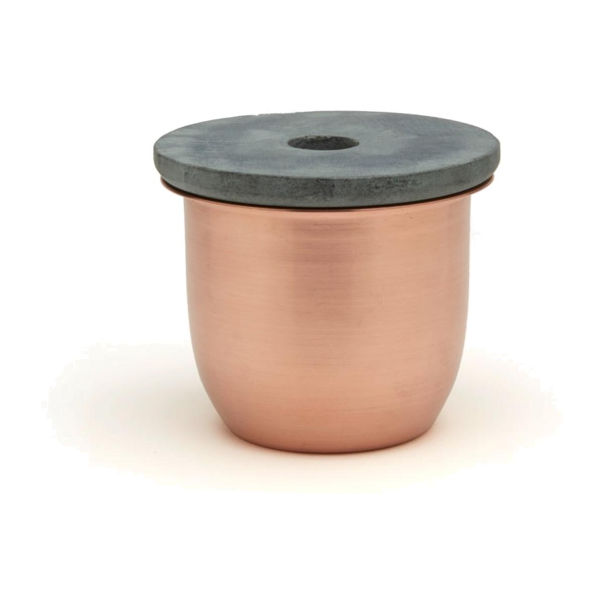 C3 Small Container is tiny but mighty vessel that is both pretty and useful. The container is spun in copper and comes with a lid made out of solid soapstone. The cup can be used to store things, as a small planter or over our glass piece C4 Jug to make a stunning centrepiece. The lid also makes a great coaster or even a candleholder. SIZE:Ø 11 x 10 cm The piece can be polished to maintain its original luster or allowed to develop a natural patina over time.