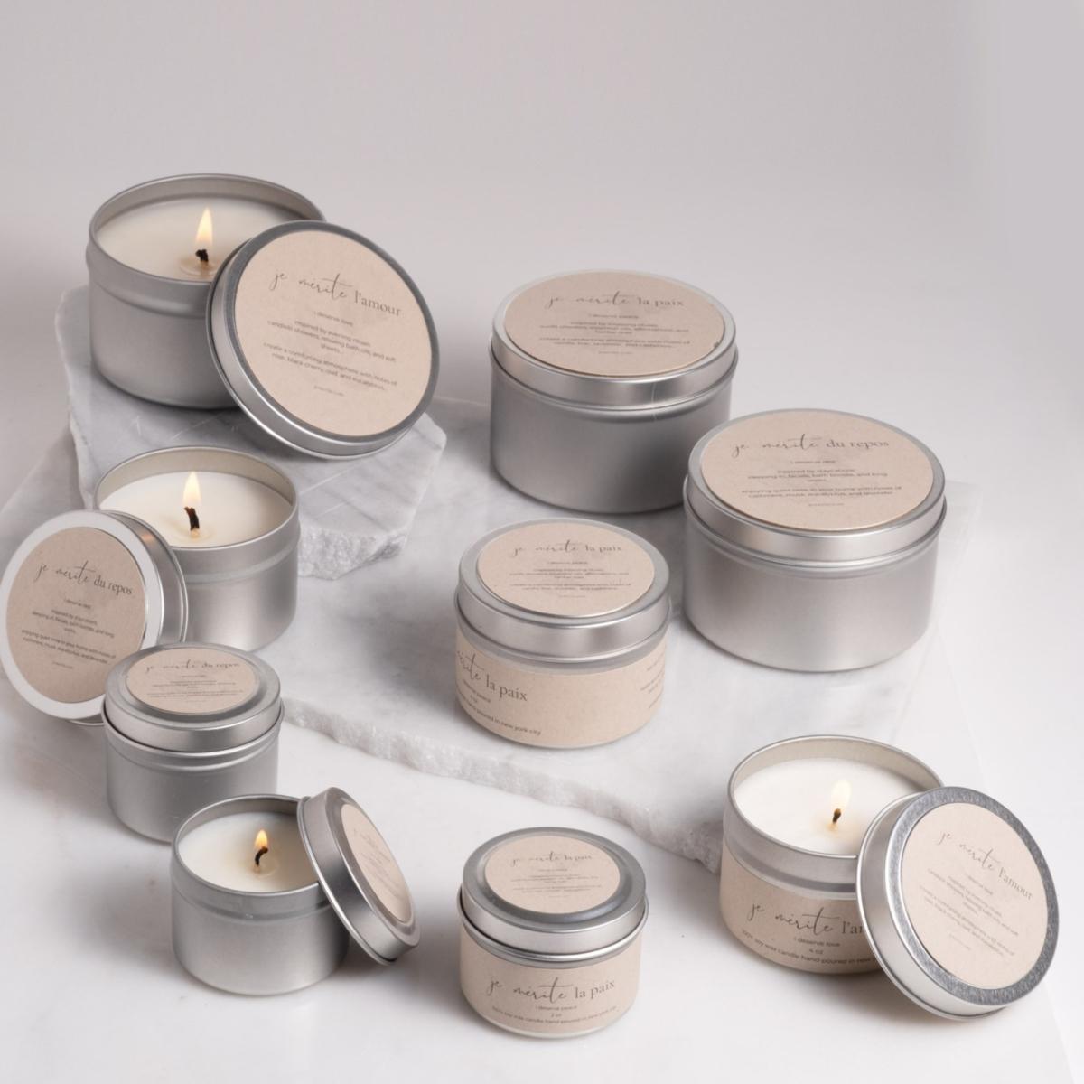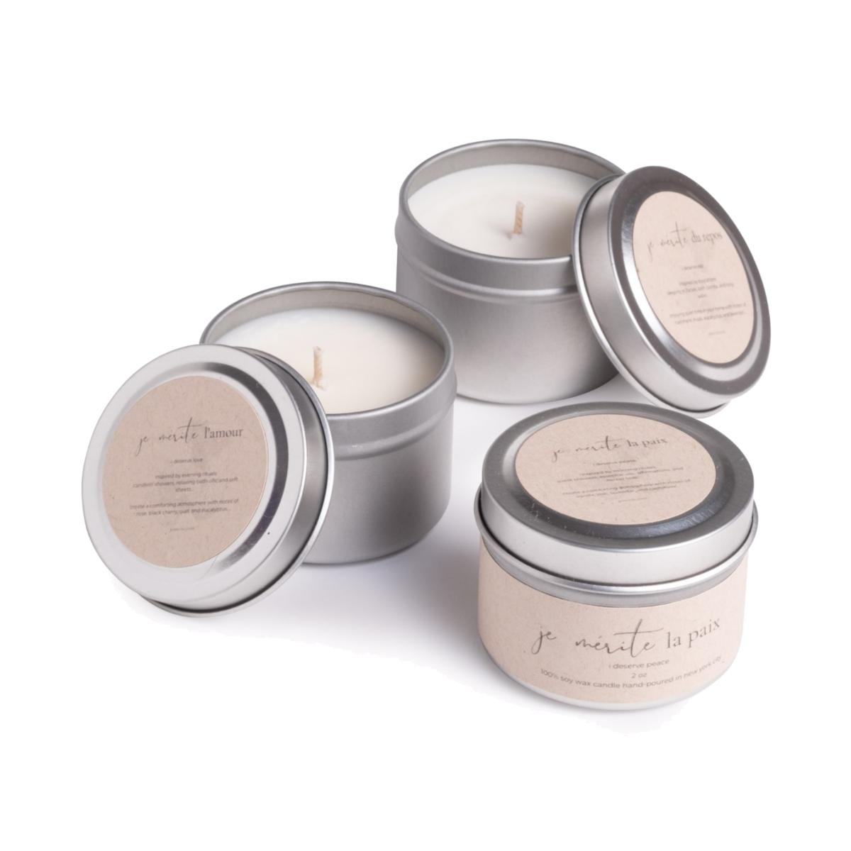 100% hand-poured soy wax 2 oz Je Mérite L'amour (I Deserve Love) Candle - inspired by romance...candlelit rooms, seductive glances, and flirtatious laughter… create a comforting atmosphere with notes of rose, black cherry, oud, and eucalyptus… 2 oz Je Mérite Du Repos (I Deserve Rest) Candle - inspired by staycations... sleeping in, facials, bath bombs, and long walks... enjoying quiet time in your home with notes of cashmere, musk, eucalyptus, and lavender... 2 oz Je Mérite La Paix (I Deserve Peace) Candle - Inspired by morning rituals... sunlit showers, essential oils, affirmations, and herbal teas... create a comforting atmosphere with notes of vanilla, lilac, lavender, and cashmere… May our sensual fragrances invite you to indulge and pamper yourself... you deserve it!
