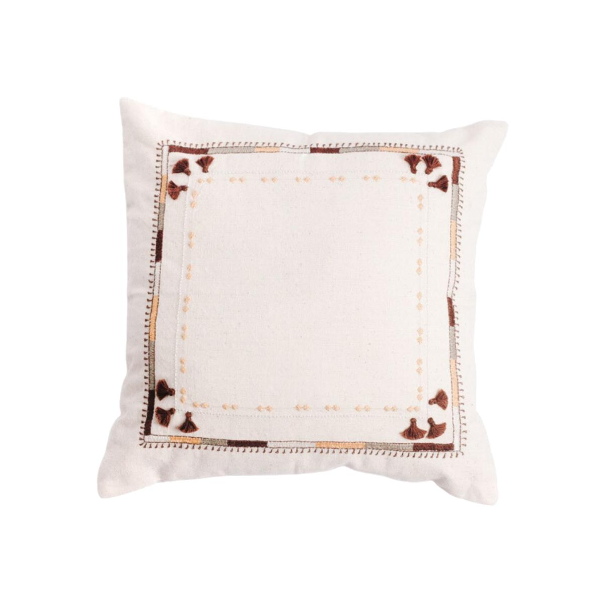 These unique pillow covers feature hand-loomed organic khadi cotton and Lambadi embroidery from southwestern India. In remote villages across Tamil Nadu, a group of 60 women use traditional techniques and motifs to create contemporary embroidered designs. This skill has been passed through many generations of Lambadi women, a tribal group renowned for their vibrant and elaborate designs. Pillow cover measures 16x16" with zipper closure. Dry clean only. Hypoallergenic pillow form insert is included. Ethically crafted in India. Dry clean only