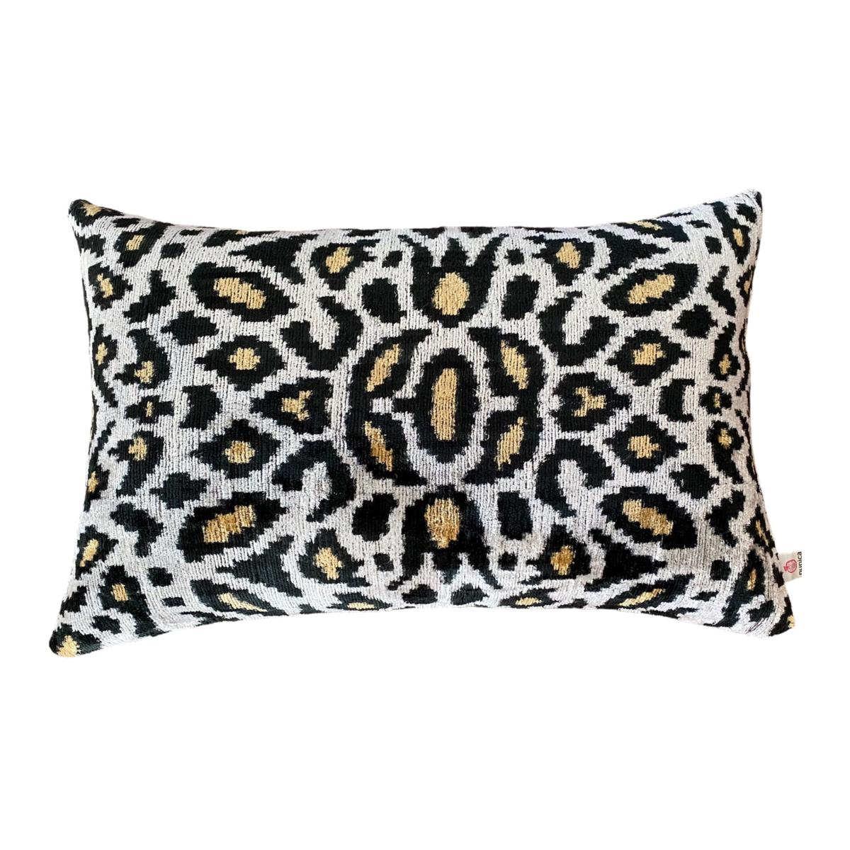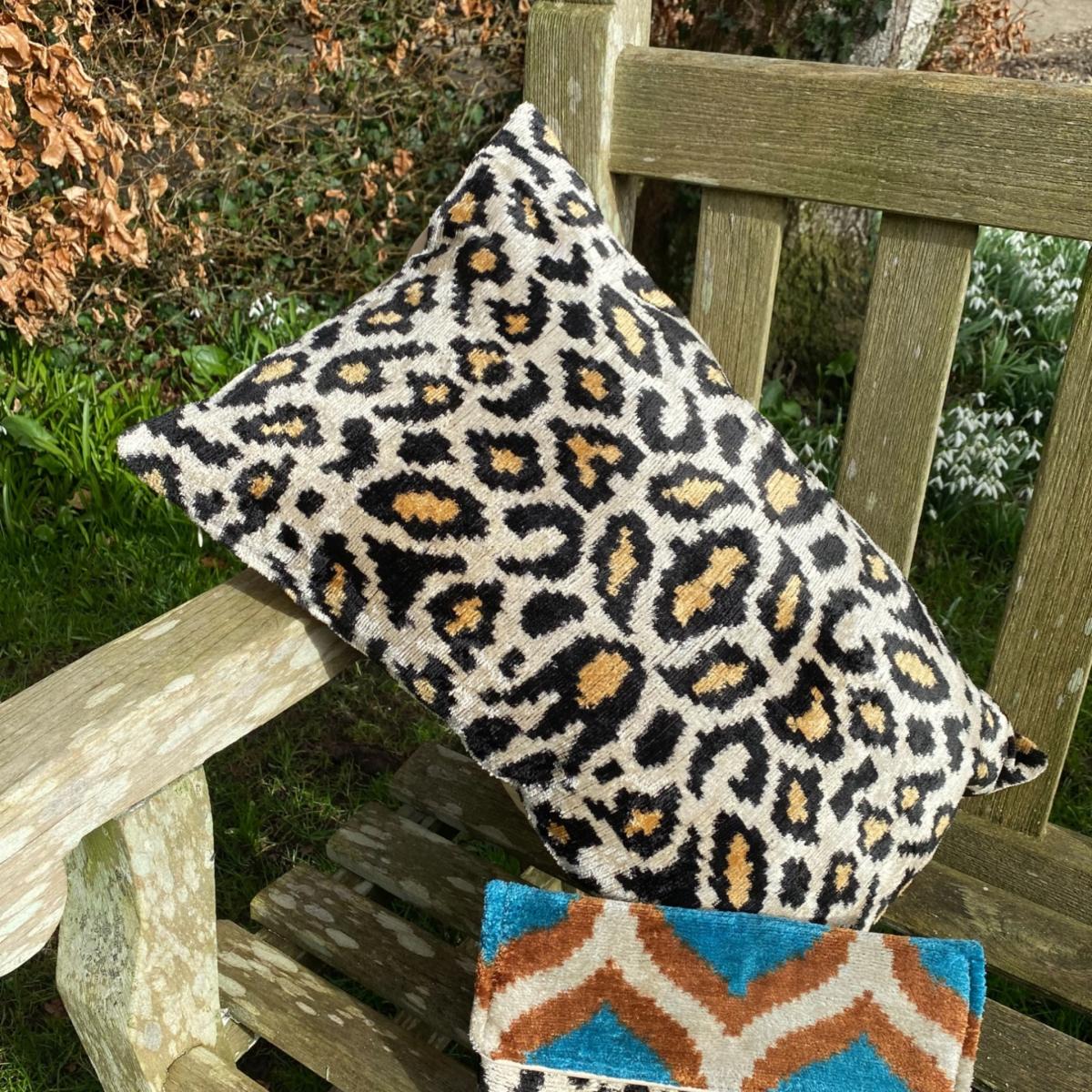 This stunning leopard design silk velvet ikat is truly a classic, one of our best sellers! We put the velvet on one side with a plain back.