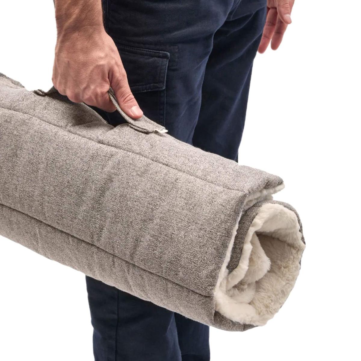 Portable dog bed made from fur-effect fabric by hand in Europe. It is the perfect accessory for travelling with your pet. It can be placed in the car for fur or on the floor of the restaurant to avoid the cold floor and make your dog more relaxed. It has a padded effect, is easy to roll up with its buttons and carry with a side handle.