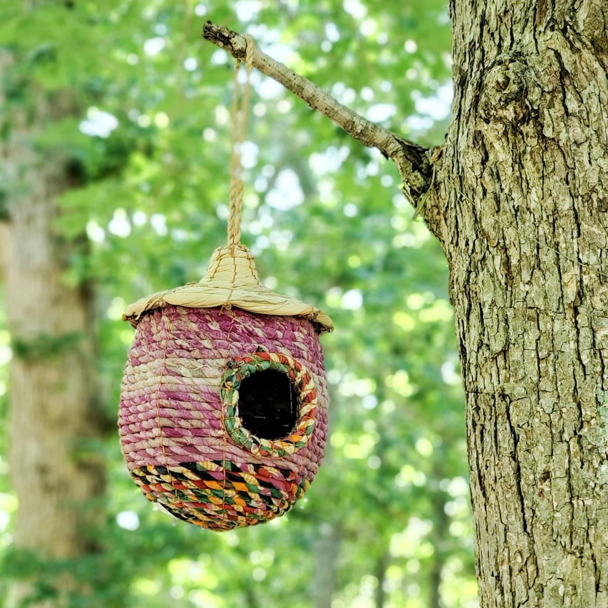 Making it a special addition to your backyard. Handcrafted using natural seagrass and repurposed sari cuttings, this bird's nest provides a cozy place for feathered friends to roost during winter months or a nest in spring. Also, this seagrass bird hut provides a warm, protected home from predators. This seagrass birdhouse is one-of-a-kind, environmentally friendly, durable and breathable for little birds to nest in, and easy to hang inside or outside your home and can be hung from a tree branch, hooked on your porch or garden. Each product is designed and curated by KORISSA, sustainably handmade by Fair Trade artisans in Bangladesh.